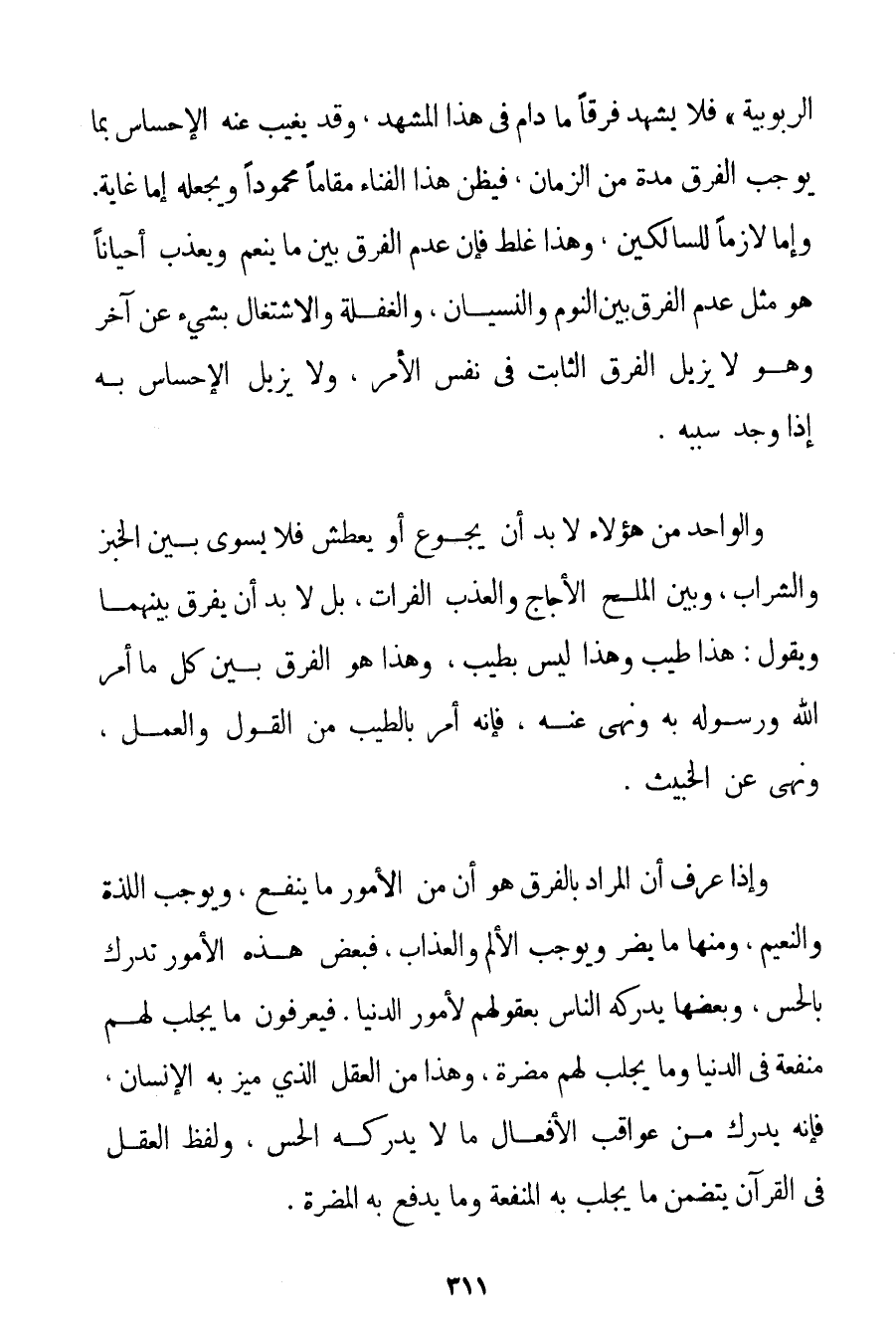 الرُّبُوبِيَّةِ " فَلَا يَشْهَدُ فَرْقًا مَا دَامَ فِي هَذَا الْمَشْهَدِ. وَقَدْ يَغِيبُ عَنْهُ الْإِحْسَاسُ بِمَا يُوجِبُ الْفَرْقَ مُدَّةً مِنْ الزَّمَانِ فَيَظُنُّ هَذَا الْفَنَاءَ مَقَامًا مَحْمُودًا وَيَجْعَلُهُ إمَّا غَايَةً. وَإِمَّا لَازِمًا لِلسَّالِكِينَ وَهَذَا غَلَطٌ فَإِنَّ عَدَمَ الْفَرْقِ بَيْنَ مَا يُنْعِمُ وَيُعَذِّبُ أَحْيَانًا هُوَ مِثْلُ عَدَمِ الْفَرْقِ بَيْنَ النَّوْمِ وَالنِّسْيَانِ وَالْغَفْلَةِ وَالِاشْتِغَالِ بِشَيْءِ عَنْ آخَرَ وَهُوَ لَا يُزِيلُ الْفَرْقَ الثَّابِتَ فِي نَفْسِ الْأَمْرِ وَلَا يُزِيلُ الْإِحْسَاسَ بِهِ إذَا وَجَدَ سَبَبَهُ. وَالْوَاحِدُ مِنْ هَؤُلَاءِ لَا بُدَّ أَنْ يَجُوعَ أَوْ يَعْطَشَ فَلَا يُسَوِّي بَيْنَ الْخُبْزِ وَالشَّرَابِ وَبَيْنَ الْمِلْحِ الْأُجَاجِ وَالْعَذْبِ الْفُرَاتِ بَلْ لَا بُدَّ أَنْ يُفَرِّقَ بَيْنَهُمَا وَيَقُولَ: هَذَا طَيِّبٌ وَهَذَا لَيْسَ بِطَيِّبِ وَهَذَا هُوَ الْفَرْقُ بَيْنَ كُلِّ مَا أَمَرَ اللَّهُ وَرَسُولُهُ بِهِ وَنَهَى عَنْهُ فَإِنَّهُ أَمَرَ بِالطَّيِّبِ مِنْ الْقَوْلِ وَالْعَمَلِ وَنَهَى عَنْ الْخَبِيثِ. وَإِذَا عَرَفَ أَنَّ الْمُرَادَ بِالْفَرْقِ هُوَ أَنَّ مِنْ الْأُمُورِ مَا يَنْفَعُ وَيُوجِبُ اللَّذَّةَ وَالنَّعِيمَ وَمِنْهَا مَا يَضُرُّ وَيُوجِبُ الْأَلَمَ وَالْعَذَابَ فَبَعْضُ هَذِهِ الْأُمُورِ تُدْرَكُ بِالْحِسِّ وَبَعْضُهَا يُدْرِكُهُ النَّاسُ بِعُقُولِهِمْ لِأُمُورِ الدُّنْيَا. فَيَعْرِفُونَ مَا يَجْلِبُ لَهُمْ مَنْفَعَةً فِي الدُّنْيَا وَمَا يَجْلِبُ لَهُمْ مَضَرَّةً وَهَذَا مِنْ الْعَقْلِ الَّذِي مُيِّزَ بِهِ الْإِنْسَانُ فَإِنَّهُ يُدْرِكُ مِنْ عَوَاقِبِ الْأَفْعَالِ مَا لَا يُدْرِكُهُ الْحِسُّ وَلَفْظُ الْعَقْلِ فِي الْقُرْآنِ يَتَضَمَّنُ مَا يَجْلِبُ بِهِ الْمَنْفَعَةَ وَمَا يَدْفَعُ بِهِ الْمَضَرَّةَ.