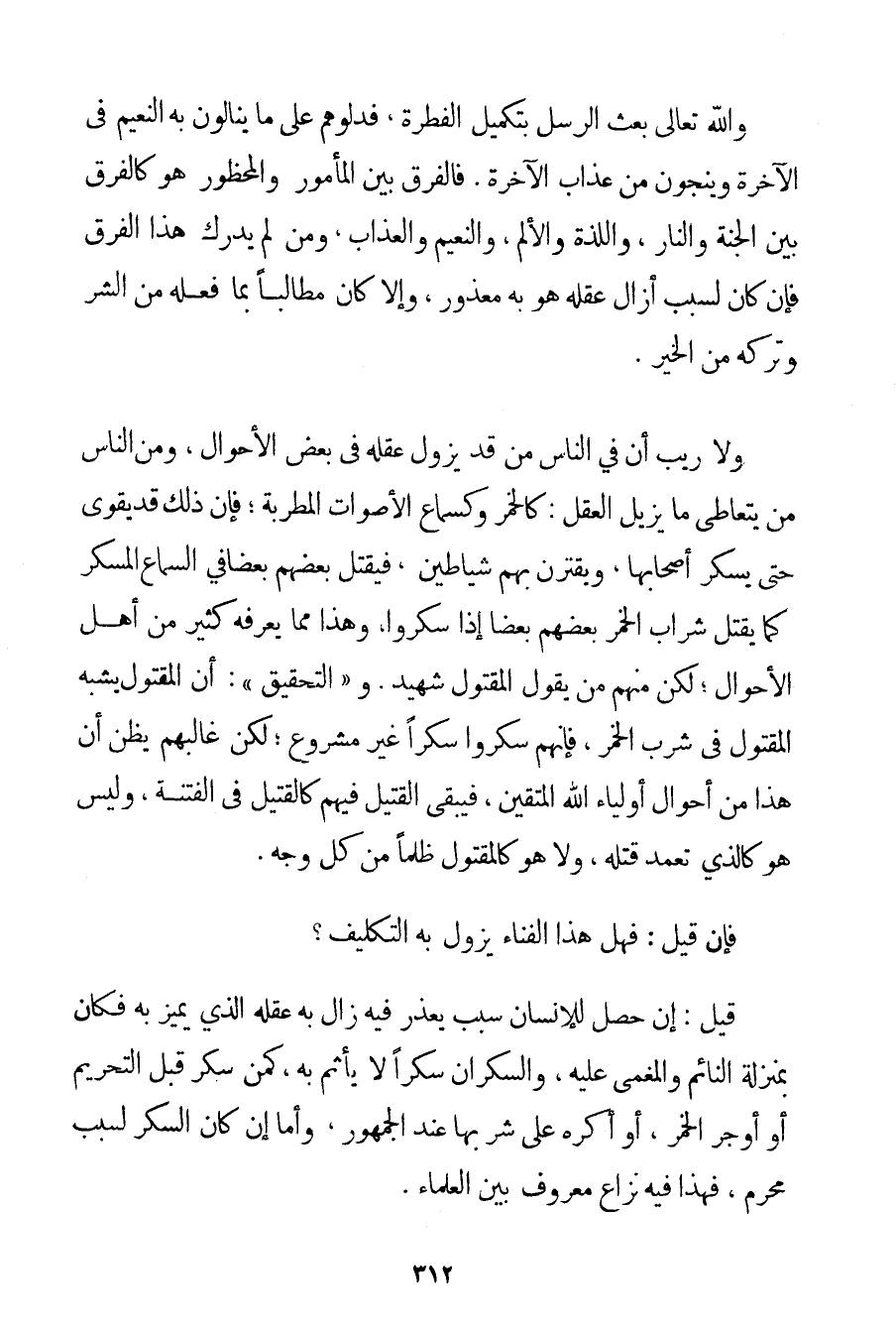 فَإِنْ قِيلَ: فَهَلْ هَذَا الْفَنَاءُ يَزُولُ بِهِ التَّكْلِيفُ؟ قِيلَ: إنْ حَصَلَ لِلْإِنْسَانِ سَبَبٌ يُعْذَرُ فِيهِ زَالَ بِهِ عَقْلُهُ الَّذِي يُمَيَّزُ بِهِ فَكَانَ بِمَنْزِلَةِ النَّائِمِ وَالْمُغْمَى عَلَيْهِ وَالسَّكْرَانِ سُكْرًا لَا يَأْثَمُ بِهِ كَمَنْ سَكِرَ قَبْلَ التَّحْرِيمِ أَوْ أُوجِرَ الْخَمْرَ أَوْ أُكْرِهَ عَلَى شُرْبِهَا عِنْدَ الْجُمْهُورِ، وَأَمَّا إنْ كَانَ السُّكْرُ لِسَبَبِ مُحَرَّمٍ فَهَذَا فِيهِ نِزَاعٌ مَعْرُوفٌ بَيْنَ الْعُلَمَاءِ.