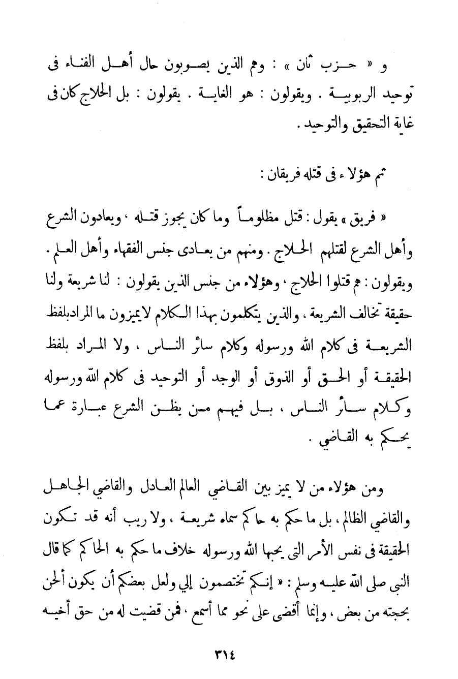 وَ " حِزْبٌ ثَانٍ ": وَهُمْ الَّذِينَ يُصَوِّبُونَ حَالَ أَهْلِ الْفَنَاءِ فِي تَوْحِيدِ الرُّبُوبِيَّةِ. وَيَقُولُونَ: هُوَ الْغَايَةُ. يَقُولُونَ: بَلْ الْحَلَّاجُ كَانَ فِي غَايَةِ التَّحْقِيقِ وَالتَّوْحِيدِ. ثُمَّ هَؤُلَاءِ فِي قَتْلِهِ فَرِيقَانِ: " فَرِيقٌ " يَقُولُ: قُتِلَ مَظْلُومًا وَمَا كَانَ يَجُوزُ قَتْلُهُ وَيُعَادُونَ الشَّرْعَ، وَأَهْلَ الشَّرْعِ لِقَتْلِهِمْ الْحَلَّاجَ. وَمِنْهُمْ مَنْ يُعَادِي جِنْسَ الْفُقَهَاءِ وَأَهْلَ الْعِلْمِ. وَيَقُولُونَ: هُمْ قَتَلُوا الْحَلَّاجَ وَهَؤُلَاءِ مِنْ جِنْسِ الَّذِينَ يَقُولُونَ: لَنَا شَرِيعَةٌ وَلَنَا حَقِيقَةٌ تُخَالِفُ الشَّرِيعَةَ وَاَلَّذِينَ يَتَكَلَّمُونَ بِهَذَا الْكَلَامِ لَا يُمَيِّزُونَ مَا الْمُرَادُ بِلَفْظِ الشَّرِيعَةِ فِي كَلَامِ اللَّهِ وَرَسُولِهِ وَكَلَامِ سَائِرِ النَّاسِ وَلَا الْمُرَادُ بِلَفْظِ الْحَقِيقَةِ أَوْ الْحَقِّ أَوْ الذَّوْقِ أَوْ الْوَجْدِ أَوْ التَّوْحِيدِ فِي كَلَامِ اللَّهِ وَرَسُولِهِ وَكَلَامِ سَائِرِ النَّاسِ بَلْ فِيهِمْ مَنْ يَظُنُّ الشَّرْعَ عِبَارَةً عَمَّا يَحْكُمُ بِهِ الْقَاضِي. وَمِنْ هَؤُلَاءِ مَنْ لَا يُمَيِّزُ بَيْنَ الْقَاضِي الْعَالِمِ الْعَادِلِ وَالْقَاضِي الْجَاهِلِ وَالْقَاضِي الظَّالِمِ بَلْ مَا حَكَمَ بِهِ حَاكِمٌ سَمَّاهُ شَرِيعَةً وَلَا رَيْبَ أَنَّهُ قَدْ تَكُونُ الْحَقِيقَةُ فِي نَفْسِ الْأَمْرِ الَّتِي يُحِبُّهَا اللَّهُ وَرَسُولُهُ خِلَافَ مَا حَكَمَ بِهِ الْحَاكِمُ كَمَا قَالَ النَّبِيُّ صَلَّى اللَّهُ عَلَيْهِ وَسَلَّمَ {إنَّكُمْ تَخْتَصِمُونَ إلَيَّ وَلَعَلَّ بَعْضَكُمْ أَنْ يَكُونَ أَلْحَنَ بِحُجَّتِهِ مِنْ بَعْضٍ وَإِنَّمَا أَقْضِي عَلَى نَحْوٍ مِمَّا أَسْمَعُ فَمَنْ قَضَيْت لَهُ مِنْ حَقِّ أَخِيهِ