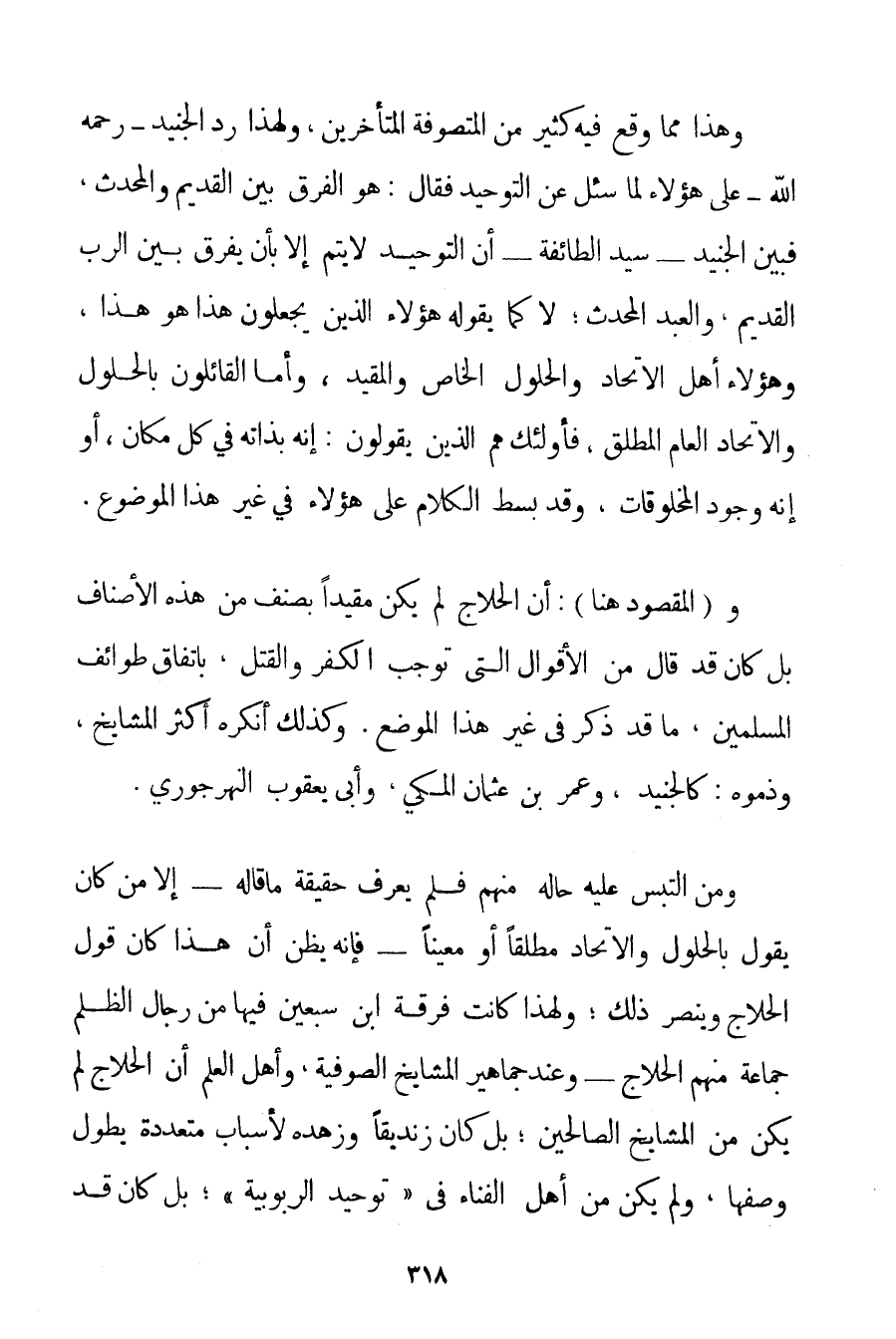 وَهَذَا مِمَّا وَقَعَ فِيهِ كَثِيرٌ مِنْ الْمُتَصَوِّفَةِ الْمُتَأَخِّرِينَ وَلِهَذَا رَدَّ الْجُنَيْد - رَحِمَهُ اللَّهُ - عَلَى هَؤُلَاءِ لَمَّا سُئِلَ عَنْ التَّوْحِيدِ فَقَالَ: هُوَ الْفَرْقُ بَيْنَ الْقَدِيمِ وَالْمُحْدَثِ فَبَيَّنَ الْجُنَيْد - سَيِّدُ الطَّائِفَةِ - أَنَّ التَّوْحِيدَ لَا يَتِمُّ إلَّا بِأَنْ يُفَرِّقَ بَيْنَ الرَّبِّ الْقَدِيمِ وَالْعَبْدِ الْمُحْدَثِ؛ لَا كَمَا يَقُولُهُ هَؤُلَاءِ الَّذِينَ يَجْعَلُونَ هَذَا هُوَ هَذَا وَهَؤُلَاءِ أَهْلُ الِاتِّحَادِ وَالْحُلُولِ الْخَاصِّ وَالْمُقَيَّدِ وَأَمَّا الْقَائِلُونَ بِالْحُلُولِ وَالِاتِّحَادِ الْعَامِّ الْمُطْلَقِ فَأُولَئِكَ هُمْ الَّذِينَ يَقُولُونَ: إنَّهُ بِذَاتِهِ فِي كُلِّ مَكَانٍ أَوْ إنَّهُ وُجُودُ الْمَخْلُوقَاتِ وَقَدْ بُسِطَ الْكَلَامُ عَلَى هَؤُلَاءِ فِي غَيْرِ هَذَا الْمَوْضُوعِ. وَ (الْمَقْصُودُ هُنَا: أَنَّ الْحَلَّاجَ لَمْ يَكُنْ مُقَيَّدًا بِصِنْفِ مِنْ هَذِهِ الْأَصْنَافِ بَلْ كَانَ قَدْ قَالَ مِنْ الْأَقْوَالِ الَّتِي تُوجِبُ الْكُفْرَ وَالْقَتْلَ بِاتِّفَاقِ طَوَائِفِ الْمُسْلِمِينَ مَا قَدْ ذُكِرَ فِي غَيْرِ هَذَا الْمَوْضِعِ. وَكَذَلِكَ أَنْكَرَهُ أَكْثَرُ الْمَشَايِخِ وَذَمُّوهُ: كالْجُنَيْد وَعُمَرَ بْنِ عُثْمَانَ الْمَكِّيِّ وَأَبِي يَعْقُوبَ النهرجوري. وَمَنْ الْتَبَسَ عَلَيْهِ حَالُهُ مِنْهُمْ فَلَمْ يَعْرِفْ حَقِيقَةَ مَا قَالَهُ - إلَّا مَنْ كَانَ يَقُولُ بِالْحُلُولِ وَالِاتِّحَادِ مُطْلَقًا أَوْ مُعَيَّنًا - فَإِنَّهُ يَظُنُّ أَنَّ هَذَا كَانَ قَوْلَ الْحَلَّاجِ وَيَنْصُرُ ذَلِكَ؛ وَلِهَذَا كَانَتْ فِرْقَةُ ابْنِ سَبْعِينَ فِيهَا مِنْ رِجَالِ الظُّلْمِ جَمَاعَةٌ مِنْهُمْ الْحَلَّاجُ - وَعِنْدَ جَمَاهِيرِ الْمَشَايِخِ الصُّوفِيَّةِ وَأَهْلِ الْعِلْمِ أَنَّ الْحَلَّاجَ لَمْ يَكُنْ مِنْ الْمَشَايِخِ الصَّالِحِينَ؛ بَلْ كَانَ زِنْدِيقًا وَزُهْدُهُ لِأَسْبَابِ مُتَعَدِّدَةٍ يَطُولُ وَصْفُهَا وَلَمْ يَكُنْ مِنْ أَهْلِ الْفَنَاءِ فِي " تَوْحِيدِ الرُّبُوبِيَّةِ "؛ بَلْ كَانَ قَدْ