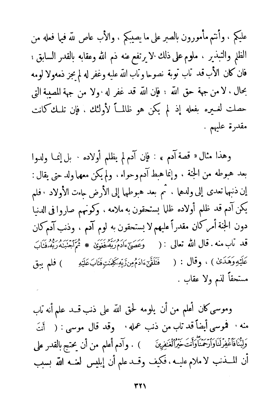 عَلَيْكُمْ وَأَنْتُمْ مَأْمُورُونَ بِالصَّبْرِ عَلَى مَا يُصِيبُكُمْ وَالْأَبُ عَاصٍ لِلَّهِ فِيمَا فَعَلَهُ مِنْ الظُّلْمِ وَالتَّبْذِيرِ مَلُومٌ عَلَى ذَلِكَ لَا يَرْتَفِعُ عَنْهُ ذَمُّ اللَّهِ وَعِقَابُهُ بِالْقَدَرِ السَّابِقِ؛ فَإِنْ كَانَ الْأَبُ قَدْ تَابَ تَوْبَةً نَصُوحًا وَتَابَ اللَّهُ عَلَيْهِ وَغَفَرَ لَهُ لَمْ يَجُزْ ذَمُّهُ وَلَا لَوْمُهُ بِحَالِ لَا مِنْ جِهَةِ حَقِّ اللَّهِ؛ فَإِنَّ اللَّهَ قَدْ غَفَرَ لَهُ وَلَا مِنْ جِهَةِ الْمُصِيبَةِ الَّتِي حَصَلَتْ لِغَيْرِهِ بِفِعْلِهِ إذْ لَمْ يَكُنْ هُوَ ظَالِمًا لِأُولَئِكَ فَإِنَّ تِلْكَ كَانَتْ مُقَدَّرَةً عَلَيْهِمْ. وَهَذَا مِثَالُ " قِصَّةِ آدَمَ ": فَإِنَّ آدَمَ لَمْ يَظْلِمْ أَوْلَادَهُ بَلْ إنَّمَا وُلِدُوا بَعْدَ هُبُوطِهِ مِنْ الْجَنَّةِ وَإِنَّمَا هَبَطَ آدَمَ وَحَوَّاءُ وَلَمْ يَكُنْ مَعَهُمَا وَلَدٌ حَتَّى يُقَالَ: إنَّ ذَنْبَهُمَا تَعَدَّى إلَى وَلَدِهِمَا ثُمَّ بَعْدَ هُبُوطِهِمَا إلَى الْأَرْضِ جَاءَتْ الْأَوْلَادُ فَلَمْ يَكُنْ آدَمَ قَدْ ظَلَمَ أَوْلَادَهُ ظُلْمًا يَسْتَحِقُّونَ بِهِ مَلَامَهُ وَكَوْنُهُمْ صَارُوا فِي الدُّنْيَا دُونَ الْجَنَّةِ أَمْرٌ كَانَ مُقَدَّرًا عَلَيْهِمْ لَا يَسْتَحِقُّونَ بِهِ لَوْمَ آدَمَ وَذَنَبُ آدَمَ كَانَ قَدْ تَابَ مِنْهُ. قَالَ اللَّهُ تَعَالَى: {وَعَصَى آدَمُ رَبَّهُ فَغَوَى} {ثُمَّ اجْتَبَاهُ رَبُّهُ فَتَابَ عَلَيْهِ وَهَدَى} وَقَالَ: {فَتَلَقَّى آدَمُ مِنْ رَبِّهِ كَلِمَاتٍ فَتَابَ عَلَيْهِ} فَلَمْ يَبْقَ مُسْتَحِقًّا لِذَمِّ وَلَا عِقَابٍ. وَمُوسَى كَانَ أَعْلَمَ مِنْ أَنْ يَلُومَهُ لِحَقِّ اللَّهِ عَلَى ذَنَبٍ قَدْ عَلِمَ أَنَّهُ تَابَ مِنْهُ فَمُوسَى أَيْضًا قَدْ تَابَ مِنْ ذَنْبٍ عَمِلَهُ وَقَدْ قَالَ مُوسَى: {أَنْتَ وَلِيُّنَا فَاغْفِرْ لَنَا وَارْحَمْنَا وَأَنْتَ خَيْرُ الْغَافِرِينَ} . وَآدَمُ أَعْلَمُ مِنْ أَنْ يَحْتَجَّ بِالْقَدَرِ عَلَى أَنَّ الْمُذْنِبَ لَا مَلَامَ عَلَيْهِ فَكَيْفَ وَقَدْ عَلِمَ أَنَّ إبْلِيسَ لَعَنَهُ اللَّهُ بِسَبَبِ