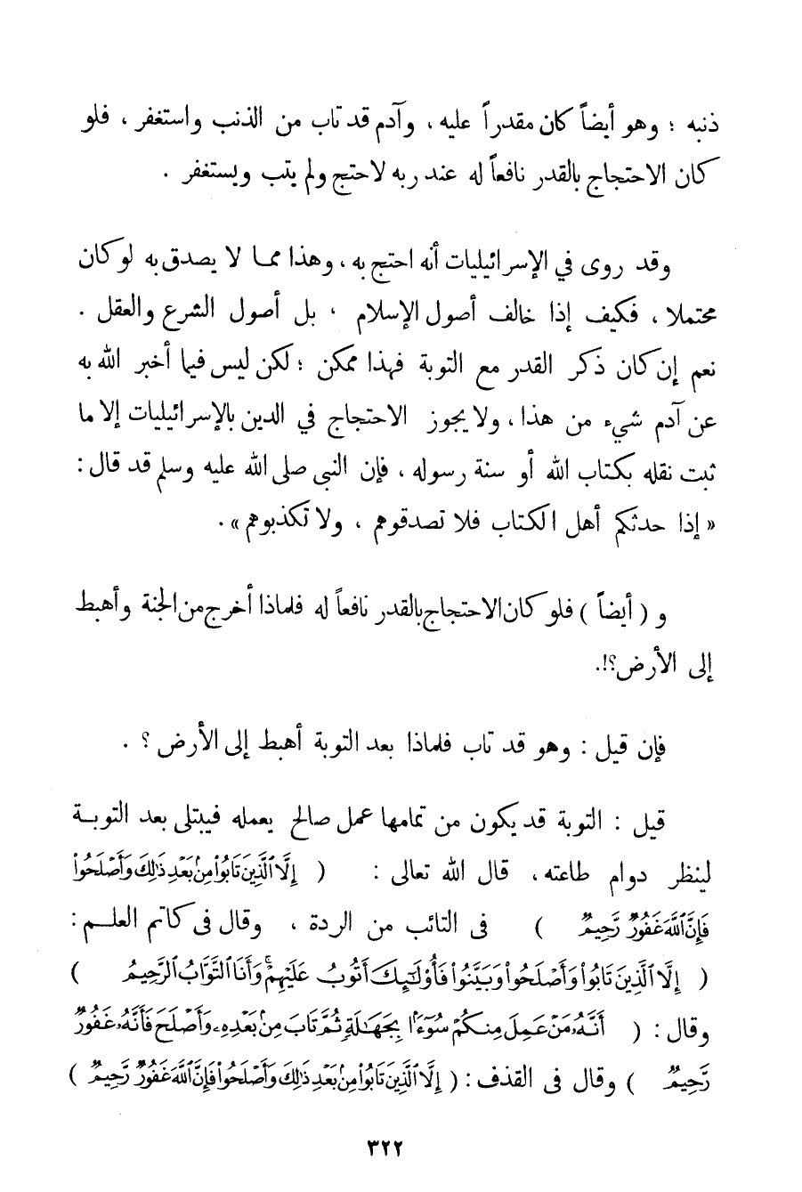 ذَنْبِهِ؛ وَهُوَ أَيْضًا كَانَ مُقَدَّرًا عَلَيْهِ وَآدَمُ قَدْ تَابَ مِنْ الذَّنْبِ وَاسْتَغْفَرَ فَلَوْ كَانَ الِاحْتِجَاجُ بِالْقَدَرِ نَافِعًا لَهُ عِنْدَ رَبِّهِ لَاحْتَجَّ وَلَمْ يَتُبْ وَيَسْتَغْفِرْ. وَقَدْ رُوِيَ فِي الإسرائيليات أَنَّهُ احْتَجَّ بِهِ وَهَذَا مِمَّا لَا يُصَدَّقُ بِهِ لَوْ كَانَ مُحْتَمَلًا فَكَيْفَ إذَا خَالَفَ أُصُولَ الْإِسْلَامِ بَلْ أُصُولَ الشَّرْعِ وَالْعَقْلِ. نَعَمْ إنْ كَانَ ذَكَرَ الْقَدَرَ مَعَ التَّوْبَةِ فَهَذَا مُمْكِنٌ؛ لَكِنْ لَيْسَ فِيمَا أَخْبَرَ اللَّهُ بِهِ عَنْ آدَمَ شَيْءٌ مِنْ هَذَا وَلَا يَجُوزُ الِاحْتِجَاجُ فِي الدِّينِ بالإسرائيليات إلَّا مَا ثَبَتَ نَقْلُهُ بِكِتَابِ اللَّهِ أَوْ سُنَّةِ رَسُولِهِ فَإِنَّ النَّبِيَّ صَلَّى اللَّهُ عَلَيْهِ وَسَلَّمَ قَدْ قَالَ: {إذَا حَدَّثَكُمْ أَهْلُ الْكِتَابِ فَلَا تُصَدِّقُوهُمْ وَلَا تُكَذِّبُوهُمْ} . وَ (أَيْضًا فَلَوْ كَانَ الِاحْتِجَاجُ بِالْقَدَرِ نَافِعًا لَهُ فَلِمَاذَا أُخْرِجَ مِنْ الْجَنَّةِ وَأُهْبِطَ إلَى الْأَرْضِ. فَإِنْ قِيلَ: وَهُوَ قَدْ تَابَ فَلِمَاذَا بَعْدَ التَّوْبَةِ أُهْبِطَ إلَى الْأَرْضِ؟ . قِيلَ: التَّوْبَةُ قَدْ يَكُونُ مِنْ تَمَامِهَا عَمَلٌ صَالِحٌ يَعْمَلُهُ فَيُبْتَلَى بَعْدَ التَّوْبَةِ لِيَنْظُرَ دَوَامَ طَاعَتِهِ قَالَ اللَّهُ تَعَالَى: {إلَّا الَّذِينَ تَابُوا مِنْ بَعْدِ ذَلِكَ وَأَصْلَحُوا فَإِنَّ اللَّهَ غَفُورٌ رَحِيمٌ} فِي التَّائِبِ مِنْ الرِّدَّةِ وَقَالَ فِي كَاتِمِ الْعِلْمِ: {إلَّا الَّذِينَ تَابُوا وَأَصْلَحُوا وَبَيَّنُوا فَأُولَئِكَ أَتُوبُ عَلَيْهِمْ وَأَنَا التَّوَّابُ الرَّحِيمُ} وَقَالَ: {أَنَّهُ مَنْ عَمِلَ مِنْكُمْ سُوءًا بِجَهَالَةٍ ثُمَّ تَابَ مِنْ بَعْدِهِ وَأَصْلَحَ فَأَنَّهُ غَفُورٌ رَحِيمٌ} وَقَالَ فِي الْقَذْفِ: {إلَّا الَّذِينَ تَابُوا مِنْ بَعْدِ ذَلِكَ وَأَصْلَحُوا