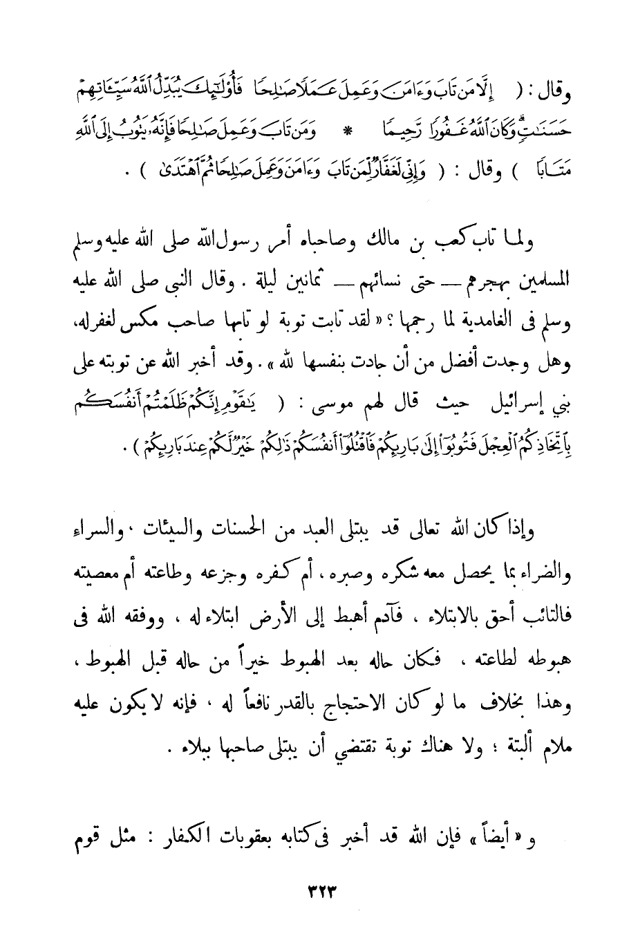 فَإِنَّ اللَّهَ غَفُورٌ رَحِيمٌ} وَقَالَ: {إلَّا مَنْ تَابَ وَآمَنَ وَعَمِلَ عَمَلًا صَالِحًا فَأُولَئِكَ يُبَدِّلُ اللَّهُ سَيِّئَاتِهِمْ حَسَنَاتٍ وَكَانَ اللَّهُ غَفُورًا رَحِيمًا} {وَمَنْ تَابَ وَعَمِلَ صَالِحًا فَإِنَّهُ يَتُوبُ إلَى اللَّهِ مَتَابًا} وَقَالَ: {وَإِنِّي لَغَفَّارٌ لِمَنْ تَابَ وَآمَنَ وَعَمِلَ صَالِحًا ثُمَّ اهْتَدَى} . {وَلَمَّا تَابَ كَعْبُ بْنُ مَالِكٍ وَصَاحِبَاهُ أَمَرَ رَسُولُ اللَّهِ صَلَّى اللَّهُ عَلَيْهِ وَسَلَّمَ الْمُسْلِمِينَ بِهَجْرِهِمْ - حَتَّى نِسَائِهِمْ - ثَمَانِينَ لَيْلَةً} . {وَقَالَ النَّبِيُّ صَلَّى اللَّهُ عَلَيْهِ وَسَلَّمَ فِي الغامدية لَمَّا رَجَمَهَا؟ لَقَدْ تَابَتْ تَوْبَةً لَوْ تَابَهَا صَاحِبُ مَكْسٍ لَغُفِرَ لَهُ وَهَلْ وَجَدْتَ أَفْضَلَ مِنْ أَنْ جَادَتْ بِنَفْسِهَا لِلَّهِ} . وَقَدْ أَخْبَرَ اللَّهُ عَنْ تَوْبَتِهِ عَلَى بَنِي إسْرَائِيلَ حَيْثُ قَالَ لَهُمْ مُوسَى: {يَا قَوْمِ إنَّكُمْ ظَلَمْتُمْ أَنْفُسَكُمْ بِاتِّخَاذِكُمُ الْعِجْلَ فَتُوبُوا إلَى بَارِئِكُمْ فَاقْتُلُوا أَنْفُسَكُمْ ذَلِكُمْ خَيْرٌ لَكُمْ عِنْدَ بَارِئِكُمْ} . وَإِذَا كَانَ اللَّهُ تَعَالَى قَدْ يَبْتَلِي الْعَبْدَ مِنْ الْحَسَنَاتِ وَالسَّيِّئَاتِ وَالسَّرَّاءِ وَالضَّرَّاءِ بِمَا يَحْصُلُ مَعَهُ شُكْرُهُ وَصَبْرُهُ أَمْ كُفْرُهُ وَجَزَعُهُ وَطَاعَتُهُ أَمْ مَعْصِيَتُهُ فَالتَّائِبُ أَحَقُّ بِالِابْتِلَاءِ فَآدَمُ أُهْبِطَ إلَى الْأَرْضِ ابْتِلَاءً لَهُ وَوَفَّقَهُ اللَّهُ فِي هُبُوطِهِ لِطَاعَتِهِ فَكَانَ حَالُهُ بَعْدَ الْهُبُوطِ خَيْرًا مِنْ حَالِهِ قَبْلَ الْهُبُوطِ وَهَذَا بِخِلَافِ مَا لَوْ كَانَ الِاحْتِجَاجُ بِالْقَدَرِ نَافِعًا لَهُ فَإِنَّهُ لَا يَكُونُ عَلَيْهِ مَلَامٌ أَلْبَتَّةَ؛ وَلَا هُنَاكَ تَوْبَةٌ تَقْتَضِي أَنْ يُبْتَلَى صَاحِبُهَا بِبَلَاءِ. وَ " أَيْضًا " فَإِنَّ اللَّهَ قَدْ أَخْبَرَ فِي كِتَابِهِ بِعُقُوبَاتِ الْكُفَّارِ: مِثْلَ قَوْمِ
