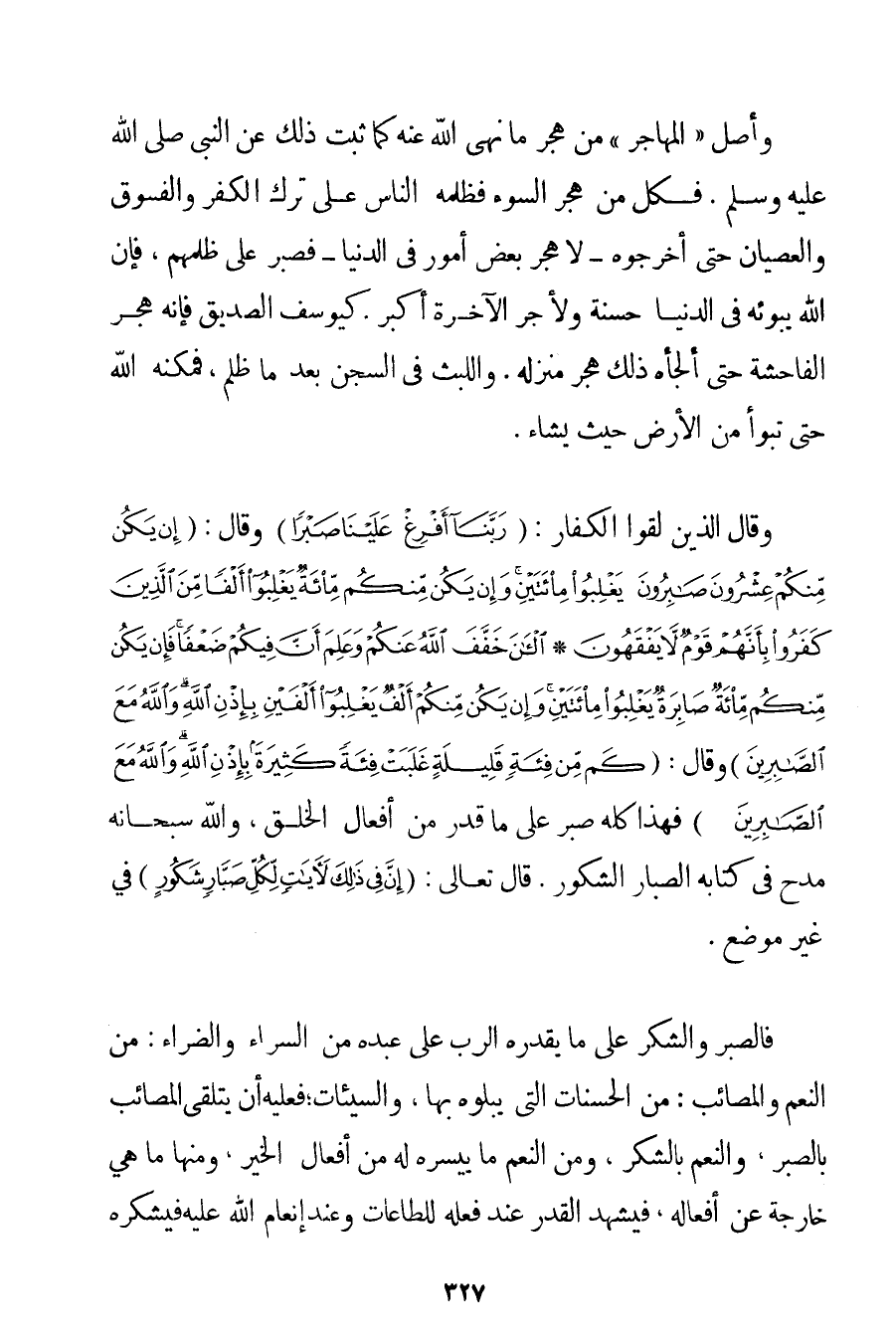 وَأَصْلُ " الْمُهَاجِرِ " مَنْ هَجَرَ مَا نَهَى اللَّهُ عَنْهُ كَمَا ثَبَتَ ذَلِكَ عَنْ النَّبِيِّ صَلَّى اللَّهُ عَلَيْهِ وَسَلَّمَ. فَكُلُّ مَنْ هَجَرَ السُّوءَ فَظَلَمَهُ النَّاسُ عَلَى تَرْكِ الْكُفْرِ وَالْفُسُوقِ وَالْعِصْيَانِ حَتَّى أَخْرَجُوهُ - لَا هَجَرَ بَعْضَ أُمُورٍ فِي الدُّنْيَا - فَصَبَرَ عَلَى ظُلْمِهِمْ فَإِنَّ اللَّهَ يُبَوِّئُهُ فِي الدُّنْيَا حَسَنَةً وَلَأَجْرُ الْآخِرَةِ أَكْبَرُ، كَيُوسُفَ الصِّدِّيقِ فَإِنَّهُ هَجَرَ الْفَاحِشَةَ حَتَّى أَلْجَأَهُ ذَلِكَ هَجْرَ مَنْزِلِهِ. وَاللُّبْثَ فِي السِّجْنِ بَعْدَ مَا ظُلِمَ فَمَكَّنَهُ اللَّهُ حَتَّى تَبَوَّأَ مِنْ الْأَرْضِ حَيْثُ يَشَاءُ. وَقَالَ الَّذِينَ لَقُوا الْكُفَّارَ: {رَبَّنَا أَفْرِغْ عَلَيْنَا صَبْرًا} وَقَالَ: {إنْ يَكُنْ مِنْكُمْ عِشْرُونَ صَابِرُونَ يَغْلِبُوا مِائَتَيْنِ وَإِنْ يَكُنْ مِنْكُمْ مِائَةٌ يَغْلِبُوا أَلْفًا مِنَ الَّذِينَ كَفَرُوا بِأَنَّهُمْ قَوْمٌ لَا يَفْقَهُونَ} {الْآنَ خَفَّفَ اللَّهُ عَنْكُمْ وَعَلِمَ أَنَّ فِيكُمْ ضَعْفًا فَإِنْ يَكُنْ مِنْكُمْ مِائَةٌ صَابِرَةٌ يَغْلِبُوا مِائَتَيْنِ وَإِنْ يَكُنْ مِنْكُمْ أَلْفٌ يَغْلِبُوا أَلْفَيْنِ بِإِذْنِ اللَّهِ وَاللَّهُ مَعَ الصَّابِرِينَ} وَقَالَ: {كَمْ مِنْ فِئَةٍ قَلِيلَةٍ غَلَبَتْ فِئَةً كَثِيرَةً بِإِذْنِ اللَّهِ وَاللَّهُ مَعَ الصَّابِرِينَ} فَهَذَا كُلُّهُ صَبْرٌ عَلَى مَا قُدِّرَ مِنْ أَفْعَالِ الْخَلْقِ وَاَللَّهُ سُبْحَانَهُ مَدَحَ فِي كِتَابِهِ الصَّبَّارَ الشَّكُورَ. قَالَ تَعَالَى: {إنَّ فِي ذَلِكَ لَآيَاتٍ لِكُلِّ صَبَّارٍ شَكُورٍ} فِي غَيْرِ مَوْضِعٍ، فَالصَّبْرُ وَالشُّكْرُ عَلَى مَا يُقَدِّرُهُ الرَّبُّ عَلَى عَبْدِهِ مِنْ السَّرَّاءِ وَالضَّرَّاءِ: مِنْ النِّعَمِ وَالْمَصَائِبِ: مِنْ الْحَسَنَاتِ الَّتِي يَبْلُوهُ بِهَا وَالسَّيِّئَاتِ؛ فَعَلَيْهِ أَنْ يَتَلَقَّى الْمَصَائِبَ بِالصَّبْرِ وَالنِّعَمَ بِالشُّكْرِ وَمِنْ النِّعَمِ مَا يُيَسِّرُهُ لَهُ مِنْ أَفْعَالِ الْخَيْرِ وَمِنْهَا مَا هِيَ خَارِجَةٌ عَنْ أَفْعَالِهِ فَيَشْهَدُ الْقَدَرَ عِنْدَ فِعْلِهِ لِلطَّاعَاتِ وَعِنْدَ إنْعَامِ اللَّهِ عَلَيْهِ فَيَشْكُرُهُ