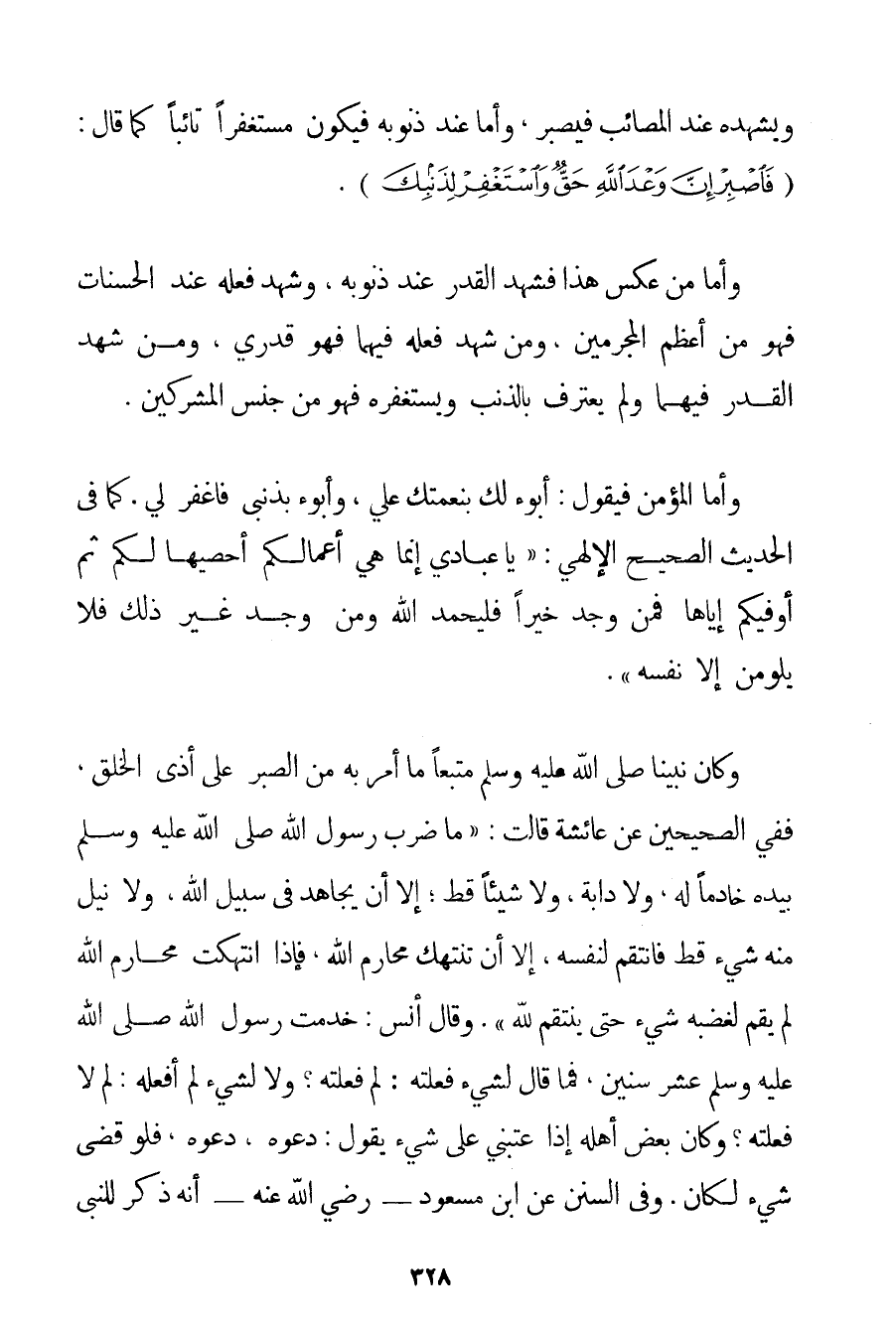وَيَشْهَدُهُ عِنْدَ الْمَصَائِبِ فَيَصْبِرُ وَأَمَّا عِنْدَ ذُنُوبِهِ فَيَكُونُ مُسْتَغْفِرًا تَائِبًا كَمَا قَالَ: {فَاصْبِرْ إنَّ وَعْدَ اللَّهِ حَقٌّ وَاسْتَغْفِرْ لِذَنْبِكَ} . وَأَمَّا مَنْ عَكَسَ هَذَا فَشَهِدَ الْقَدَرَ عِنْدَ ذُنُوبِهِ وَشَهِدَ فِعْلَهُ عِنْدَ الْحَسَنَاتِ فَهُوَ مِنْ أَعْظَمِ الْمُجْرِمِينَ وَمَنْ شَهِدَ فِعْلَهُ فِيهِمَا فَهُوَ قَدَرِيٌّ وَمَنْ شَهِدَ الْقَدَرَ فِيهِمَا وَلَمْ يَعْتَرِفْ بِالذَّنْبِ وَيَسْتَغْفِرْهُ فَهُوَ مِنْ جِنْسِ الْمُشْرِكِينَ. وَأَمَّا الْمُؤْمِنُ فَيَقُولُ: أَبُوءُ لَك بِنِعْمَتِك عَلَيَّ وَأَبُوءُ بِذَنْبِي فَاغْفِرْ لِي. كَمَا فِي الْحَدِيثِ الصَّحِيحِ الْإِلَهِيِّ: {يَا عِبَادِي إنَّمَا هِيَ أَعْمَالُكُمْ أُحْصِيهَا لَكُمْ ثُمَّ أُوَفِّيكُمْ إيَّاهَا فَمَنْ وَجَدَ خَيْرًا فَلْيَحْمَدْ اللَّهَ وَمَنْ وَجَدَ غَيْرَ ذَلِكَ فَلَا يَلُومَنَّ إلَّا نَفْسَهُ} . وَكَانَ نَبِيُّنَا صَلَّى اللَّهُ عَلَيْهِ وَسَلَّمَ مُتَّبِعًا مَا أُمِرَ بِهِ مِنْ الصَّبْرِ عَلَى أَذَى الْخَلْقِ فَفِي الصَّحِيحَيْنِ عَنْ عَائِشَةَ قَالَتْ: {مَا ضَرَبَ رَسُولُ اللَّهِ صَلَّى اللَّهُ عَلَيْهِ وَسَلَّمَ بِيَدِهِ خَادِمًا لَهُ وَلَا دَابَّةً وَلَا شَيْئًا قَطُّ؛ إلَّا أَنْ يُجَاهِدَ فِي سَبِيلِ اللَّهِ وَلَا نِيلَ مِنْهُ شَيْءٌ قَطُّ فَانْتَقَمَ لِنَفْسِهِ إلَّا أَنْ تُنْتَهَكَ مَحَارِمُ اللَّهِ فَإِذَا اُنْتُهِكَتْ مَحَارِمُ اللَّهِ لَمْ يَقُمْ لِغَضَبِهِ شَيْءٌ حَتَّى يَنْتَقِمَ لِلَّهِ} . {وَقَالَ أَنَسٌ: خَدَمْت رَسُولَ اللَّهِ صَلَّى اللَّهُ عَلَيْهِ وَسَلَّمَ عَشْرَ سِنِينَ فَمَا قَالَ لِشَيْءِ فَعَلْته: لِمَ فَعَلْته؟ وَلَا لِشَيْءِ لَمْ أَفْعَلْهُ: لِمَ لَا فَعَلْته؟ وَكَانَ بَعْضُ أَهْلِهِ إذَا عَتَبَنِي عَلَى شَيْءٍ يَقُولُ: دَعُوهُ دَعُوهُ فَلَوْ قُضِيَ شَيْءٌ لَكَانَ} . وَفِي السُّنَنِ {عَنْ ابْنِ مَسْعُودٍ - رَضِيَ اللَّهُ عَنْهُ - أَنَّهُ ذَكَرَ لِلنَّبِيِّ
