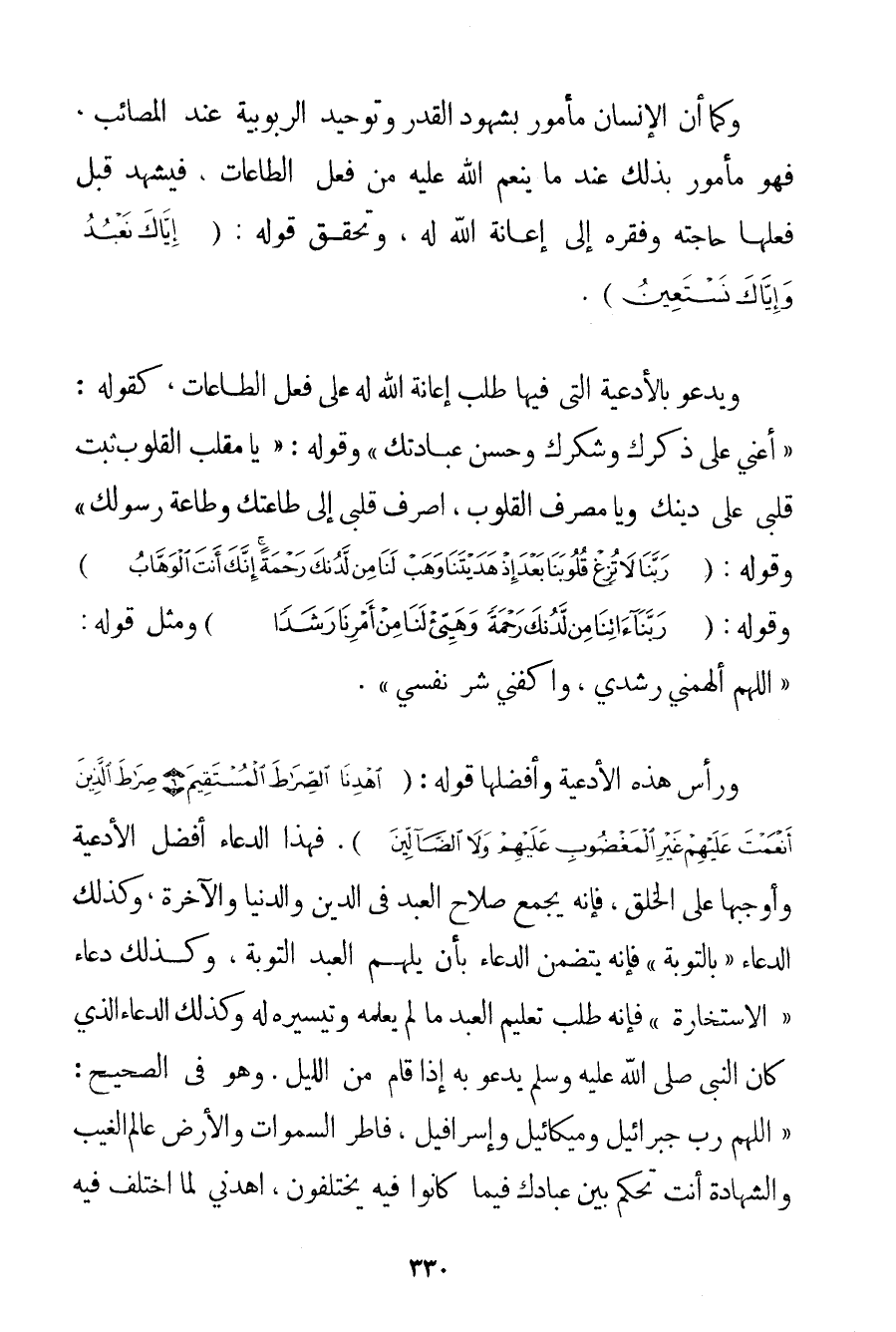 وَكَمَا أَنَّ الْإِنْسَانَ مَأْمُورٌ بِشُهُودِ الْقَدَرِ وَتَوْحِيدِ الرُّبُوبِيَّةِ عِنْدَ الْمَصَائِبِ فَهُوَ مَأْمُورٌ بِذَلِكَ عِنْدَمَا يُنْعِمُ اللَّهُ عَلَيْهِ مِنْ فِعْلِ الطَّاعَاتِ فَيَشْهَدُ قَبْلَ فِعْلِهَا حَاجَتَهُ وَفَقْرَهُ إلَى إعَانَةِ اللَّهِ لَهُ وَتَحَقُّقِ قَوْلِهِ: {إيَّاكَ نَعْبُدُ وَإِيَّاكَ نَسْتَعِينُ} . وَيَدْعُو بِالْأَدْعِيَةِ الَّتِي فِيهَا طَلَبُ إعَانَةِ اللَّهِ لَهُ عَلَى فِعْلِ الطَّاعَاتِ كَقَوْلِهِ: {أَعِنِّي عَلَى ذِكْرِك وَشُكْرِك وَحُسْنِ عِبَادَتِك} وَقَوْلِهِ: {يَا مُقَلِّبَ الْقُلُوبِ ثَبِّتْ قَلْبِي عَلَى دِينِك وَيَا مُصَرِّفَ الْقُلُوبِ اصْرِفْ قَلْبِي إلَى طَاعَتِك وَطَاعَةِ رَسُولِك} وَقَوْلِهِ: {رَبَّنَا لَا تُزِغْ قُلُوبَنَا بَعْدَ إذْ هَدَيْتَنَا وَهَبْ لَنَا مِنْ لَدُنْكَ رَحْمَةً إنَّكَ أَنْتَ الْوَهَّابُ} وَقَوْلِهِ: {رَبَّنَا آتِنَا مِنْ لَدُنْكَ رَحْمَةً وَهَيِّئْ لَنَا مِنْ أَمْرِنَا رَشَدًا} وَمِثْلِ قَوْلِهِ: {اللَّهُمَّ أَلْهِمْنِي رُشْدِي وَاكْفِنِي شَرَّ نَفْسِي} . وَرَأْسُ هَذِهِ الْأَدْعِيَةِ وَأَفْضَلُهَا قَوْلُهُ: {اهْدِنَا الصِّرَاطَ الْمُسْتَقِيمَ} {صِرَاطَ الَّذِينَ أَنْعَمْتَ عَلَيْهِمْ غَيْرِ الْمَغْضُوبِ عَلَيْهِمْ وَلَا الضَّالِّينَ} . فَهَذَا الدُّعَاءُ أَفْضَلُ الْأَدْعِيَةِ وَأَوْجَبُهَا عَلَى الْخَلْقِ فَإِنَّهُ يَجْمَعُ صَلَاحَ الْعَبْدِ فِي الدِّينِ وَالدُّنْيَا وَالْآخِرَةِ وَكَذَلِكَ الدُّعَاءُ " بِالتَّوْبَةِ " فَإِنَّهُ يَتَضَمَّنُ الدُّعَاءَ بِأَنْ يُلْهِمَ الْعَبْدَ التَّوْبَةَ وَكَذَلِكَ دُعَاءُ " الِاسْتِخَارَةِ " فَإِنَّهُ طَلَبُ تَعْلِيمِ الْعَبْدِ مَا لَمْ يَعْلَمْهُ وَتَيْسِيرِهِ لَهُ وَكَذَلِكَ الدُّعَاءُ الَّذِي كَانَ النَّبِيُّ صَلَّى اللَّهُ عَلَيْهِ وَسَلَّمَ يَدْعُو بِهِ إذَا قَامَ مِنْ اللَّيْلِ. وَهُوَ فِي الصَّحِيحِ: {اللَّهُمَّ رَبِّ جبرائيل وميكائيل وَإِسْرَافِيلَ فَاطِرَ السَّمَوَاتِ وَالْأَرْضِ عَالِمَ الْغَيْبِ وَالشَّهَادَةِ أَنْتَ تَحْكُمُ بَيْنَ عِبَادِك فِيمَا كَانُوا فِيهِ يَخْتَلِفُونَ اهْدِنِي لِمَا اُخْتُلِفَ فِيهِ