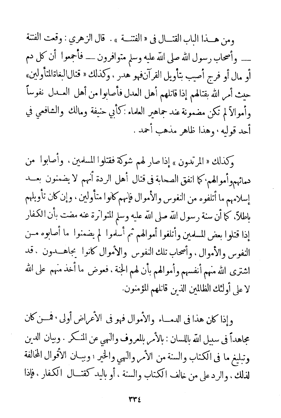 وَمِنْ هَذَا الْبَابِ الْقِتَالُ فِي " الْفِتْنَةِ ". قَالَ الزُّهْرِيُّ: وَقَعَتْ الْفِتْنَةُ - وَأَصْحَابُ رَسُولِ اللَّهِ صَلَّى اللَّهُ عَلَيْهِ وَسَلَّمَ مُتَوَافِرُونَ - فَأَجْمَعُوا أَنَّ كُلَّ دَمٍ أَوْ مَالٍ أَوْ فَرْجٍ أُصِيبَ بِتَأْوِيلِ الْقُرْآنِ فَهُوَ هَدَرٌ وَكَذَلِكَ " قِتَالُ الْبُغَاةِ الْمُتَأَوِّلِينَ " حَيْثُ أَمَرَ اللَّهُ بِقِتَالِهِمْ إذَا قَاتَلَهُمْ أَهْلُ الْعَدْلِ فَأَصَابُوا مِنْ أَهْلِ الْعَدْلِ نُفُوسًا وَأَمْوَالًا لَمْ تَكُنْ مَضْمُونَةً عِنْدَ جَمَاهِيرِ الْعُلَمَاءِ: كَأَبِي حَنِيفَةَ وَمَالِكٍ وَالشَّافِعِيِّ فِي أَحَدِ قَوْلَيْهِ وَهَذَا ظَاهِرُ مَذْهَبِ أَحْمَد. وَكَذَلِكَ " الْمُرْتَدُّونَ " إذَا صَارَ لَهُمْ شَوْكَةٌ فَقَتَلُوا الْمُسْلِمِينَ وَأَصَابُوا مِنْ دِمَائِهِمْ وَأَمْوَالِهِمْ كَمَا اتَّفَقَ الصَّحَابَةُ فِي قِتَالِ أَهْلِ الرِّدَّةِ أَنَّهُمْ لَا يَضْمَنُونَ بَعْدَ إسْلَامِهِمْ مَا أَتْلَفُوهُ مِنْ النُّفُوسِ وَالْأَمْوَالِ فَإِنَّهُمْ كَانُوا مُتَأَوِّلِينَ وَإِنْ كَانَ تَأْوِيلُهُمْ بَاطِلًا كَمَا أَنَّ سُنَّةَ رَسُولِ اللَّهِ صَلَّى اللَّهُ عَلَيْهِ وَسَلَّمَ الْمُتَوَاتِرَةَ عَنْهُ مَضَتْ بِأَنَّ الْكُفَّارَ إذَا قَتَلُوا بَعْضَ الْمُسْلِمِينَ وَأَتْلَفُوا أَمْوَالَهُمْ ثُمَّ أَسْلَمُوا لَمْ يَضْمَنُوا مَا أَصَابُوهُ مِنْ النُّفُوسِ وَالْأَمْوَالِ وَأَصْحَابُ تِلْكَ النُّفُوسِ وَالْأَمْوَالِ كَانُوا يُجَاهِدُونَ قَدْ اشْتَرَى اللَّهُ مِنْهُمْ أَنْفُسَهُمْ وَأَمْوَالَهُمْ بِأَنَّ لَهُمْ الْجَنَّةَ فَعِوَضُ مَا أُخِذَ مِنْهُمْ عَلَى اللَّهِ لَا عَلَى أُولَئِكَ الظَّالِمِينَ الَّذِينَ قَاتَلَهُمْ الْمُؤْمِنُونَ. وَإِذَا كَانَ هَذَا فِي الدِّمَاءِ وَالْأَمْوَالِ فَهُوَ فِي الْأَعْرَاضِ أَوْلَى فَمَنْ كَانَ مُجَاهِدًا فِي سَبِيلِ اللَّهِ بِاللِّسَانِ: بِالْأَمْرِ بِالْمَعْرُوفِ وَالنَّهْيِ عَنْ الْمُنْكَرِ. وَبَيَانِ الدَّيْنِ وَتَبْلِيغِ مَا فِي الْكِتَابِ وَالسُّنَّةِ مِنْ الْأَمْرِ وَالنَّهْيِ وَالْخَيْرِ؛ وَبَيَانِ الْأَقْوَالِ الْمُخَالِفَةِ لِذَلِكَ وَالرَّدِّ عَلَى مَنْ خَالَفَ الْكِتَابَ وَالسُّنَّةَ أَوْ بِالْيَدِ كَقِتَالِ الْكُفَّارِ فَإِذَا