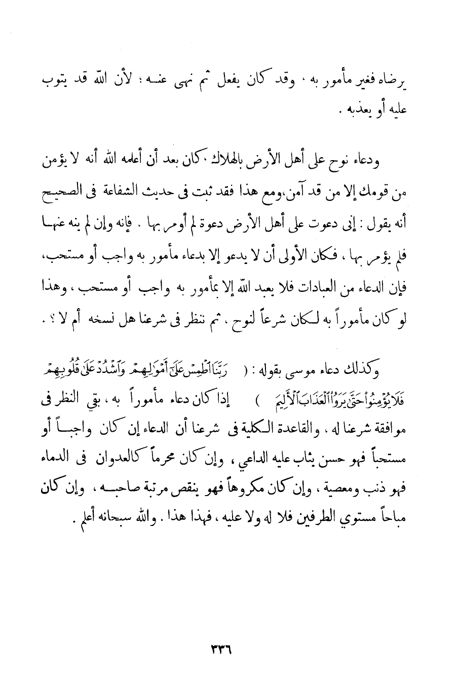 يَرْضَاهُ فَغَيْرُ مَأْمُورٍ بِهِ وَقَدْ كَانَ يَفْعَلُ ثُمَّ نَهَى عَنْهُ؛ لِأَنَّ اللَّهَ قَدْ يَتُوبُ عَلَيْهِ أَوْ يُعَذِّبُهُ. وَدُعَاءُ نُوحٍ عَلَى أَهْلِ الْأَرْضِ بِالْهَلَاكِ كَانَ بَعْدَ أَنْ أَعْلَمَهُ اللَّهُ أَنَّهُ لَا يُؤْمِنُ مِنْ قَوْمِك إلَّا مَنْ قَدْ آمَنَ وَمَعَ هَذَا فَقَدَ ثَبَتَ فِي حَدِيثِ الشَّفَاعَةِ فِي الصَّحِيحِ أَنَّهُ يَقُولُ: {إنِّي دَعَوْت عَلَى أَهْلِ الْأَرْضِ دَعْوَةً لَمْ أومر بِهَا} فَإِنَّهُ وَإِنْ لَمْ يَنْهَ عَنْهَا فَلَمْ يُؤْمَرْ بِهَا فَكَانَ الْأَوْلَى أَنْ لَا يَدْعُوَ إلَّا بِدُعَاءِ مَأْمُورٍ بِهِ وَاجِبٍ أَوْ مُسْتَحَبٍّ فَإِنَّ الدُّعَاءَ مِنْ الْعِبَادَاتِ فَلَا يُعْبَدُ اللَّهُ إلَّا بِمَأْمُورِ بِهِ وَاجِبٍ أَوْ مُسْتَحَبٍّ وَهَذَا لَوْ كَانَ مَأْمُورًا بِهِ لَكَانَ شَرْعًا لِنُوحِ ثُمَّ نَنْظُرُ فِي شَرْعِنَا هَلْ نَسَخَهُ أَمْ لَا؟ . وَكَذَلِكَ دُعَاءُ مُوسَى بِقَوْلِهِ: {رَبَّنَا اطْمِسْ عَلَى أَمْوَالِهِمْ وَاشْدُدْ عَلَى قُلُوبِهِمْ فَلَا يُؤْمِنُوا حَتَّى يَرَوُا الْعَذَابَ الْأَلِيمَ} إذَا كَانَ دُعَاءً مَأْمُورًا بِهِ بَقِيَ النَّظَرُ فِي مُوَافَقَةِ شَرْعِنَا لَهُ وَالْقَاعِدَةُ الْكُلِّيَّةُ فِي شَرْعِنَا أَنَّ الدُّعَاءَ إنْ كَانَ وَاجِبًا أَوْ مُسْتَحَبًّا فَهُوَ حَسَنٌ يُثَابُ عَلَيْهِ الدَّاعِي وَإِنْ كَانَ مُحَرَّمًا كَالْعُدْوَانِ فِي الدِّمَاءِ فَهُوَ ذَنْبٌ وَمَعْصِيَةٌ وَإِنْ كَانَ مَكْرُوهًا فَهُوَ يُنْقِصُ مَرْتَبَةَ صَاحِبِهِ وَإِنْ كَانَ مُبَاحًا مُسْتَوِيَ الطَّرَفَيْنِ فَلَا لَهُ وَلَا عَلَيْهِ فَهَذَا هَذَا. وَاَللَّهُ سُبْحَانَهُ أَعْلَمُ.