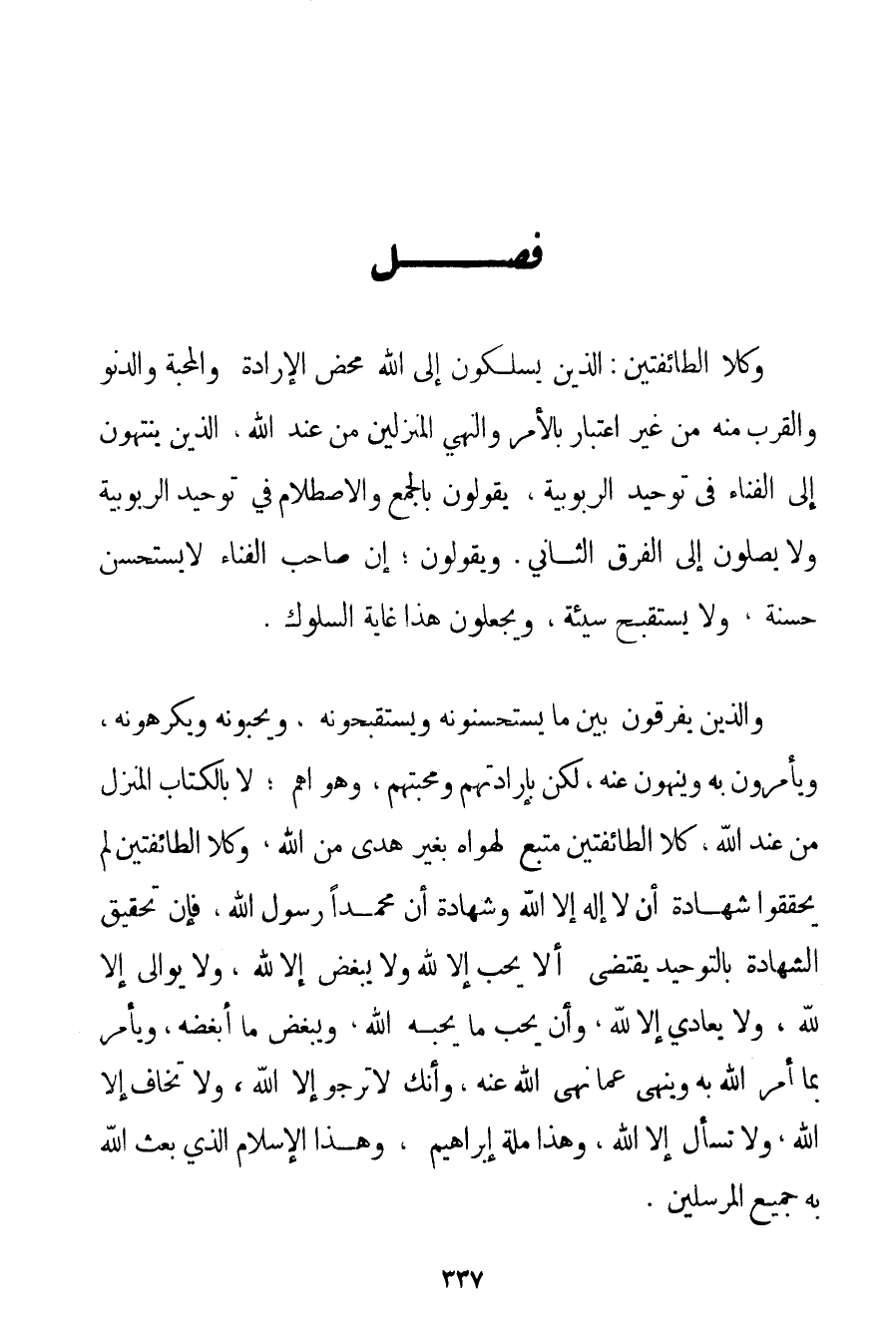 وَكِلَا الطَّائِفَتَيْنِ: الَّذِينَ يَسْلُكُونَ إلَى اللَّهِ مَحْضَ الْإِرَادَةِ وَالْمَحَبَّةِ وَالدُّنُوِّ وَالْقُرْبِ مِنْهُ مِنْ غَيْرِ اعْتِبَارٍ بِالْأَمْرِ وَالنَّهْيِ الْمُنَزَّلَيْنِ مِنْ عِنْدِ اللَّهِ الَّذِينَ يَنْتَهُونَ إلَى الْفَنَاءِ فِي تَوْحِيدِ الرُّبُوبِيَّةِ يَقُولُونَ بِالْجَمْعِ وَالِاصْطِلَامِ فِي تَوْحِيدِ الرُّبُوبِيَّةِ وَلَا يَصِلُونَ إلَى الْفَرْقِ الثَّانِي. وَيَقُولُونَ؛ إنَّ صَاحِبَ الْفَنَاءِ لَا يَسْتَحْسِنُ حَسَنَةً وَلَا يَسْتَقْبِحُ سَيِّئَةً وَيَجْعَلُونَ هَذَا غَايَةَ السُّلُوكِ. وَاَلَّذِينَ يُفَرِّقُونَ بَيْنَ مَا يَسْتَحْسِنُونَهُ ويستقبحونه وَيُحِبُّونَهُ وَيَكْرَهُونَهُ وَيَأْمُرُونَ بِهِ وَيَنْهَوْنَ عَنْهُ لَكِنْ بِإِرَادَتِهِمْ وَمَحَبَّتِهِمْ وَهَوَاهُمْ؛ لَا بِالْكِتَابِ الْمُنَزَّلِ مِنْ عِنْدِ اللَّهِ كِلَا الطَّائِفَتَيْنِ مُتَّبِعٌ لِهَوَاهُ بِغَيْرِ هُدًى مِنْ اللَّهِ وَكِلَا الطَّائِفَتَيْنِ لَمْ يُحَقِّقُوا شَهَادَةَ أَنْ لَا إلَهَ إلَّا اللَّهُ وَشَهَادَةَ أَنَّ مُحَمَّدًا رَسُولُ اللَّهِ فَإِنَّ تَحْقِيقَ الشَّهَادَةِ بِالتَّوْحِيدِ يَقْتَضِي أَنْ لَا يُحِبَّ إلَّا لِلَّهِ وَلَا يُبْغِضَ إلَّا لِلَّهِ، وَلَا يُوَالِيَ إلَّا لِلَّهِ، وَلَا يُعَادِيَ إلَّا لِلَّهِ وَأَنْ يُحِبَّ مَا يُحِبُّهُ اللَّهُ وَيُبْغِضَ مَا أَبْغَضَهُ وَيَأْمُرَ بِمَا أَمَرَ اللَّهُ بِهِ، وَيَنْهَى عَمَّا نَهَى اللَّهُ عَنْهُ وَأَنَّك لَا تَرْجُو إلَّا اللَّهَ وَلَا تَخَافُ إلَّا اللَّهَ وَلَا تَسْأَلُ إلَّا اللَّهَ وَهَذَا مِلَّةُ إبْرَاهِيمَ وَهَذَا الْإِسْلَامُ الَّذِي بَعَثَ اللَّهُ بِهِ جَمِيعَ الْمُرْسَلِينَ.