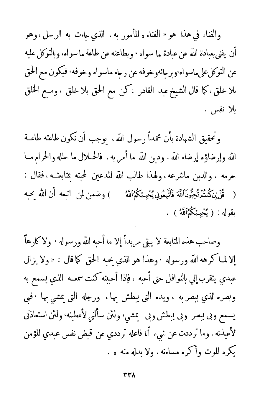 وَالْفَنَاءُ فِي هَذَا هُوَ " الْفَنَاءُ " الْمَأْمُورُ بِهِ الَّذِي جَاءَتْ بِهِ الرُّسُلُ وَهُوَ أَنْ يَفْنَى بِعِبَادَةِ اللَّهِ عَنْ عِبَادَةِ مَا سِوَاهُ؛ وَبِطَاعَتِهِ عَنْ طَاعَةِ مَا سِوَاهُ وَبِالتَّوَكُّلِ عَلَيْهِ عَنْ التَّوَكُّلِ عَلَى مَا سِوَاهُ وَبِرَجَائِهِ وَخَوْفِهِ عَنْ رَجَاءِ مَا سِوَاهُ وَخَوْفِهِ فَيَكُونُ مَعَ الْحَقِّ بِلَا خَلْقٍ كَمَا قَالَ الشَّيْخُ عَبْدُ الْقَادِرِ: كُنْ مَعَ الْحَقِّ بِلَا خَلْقٍ وَمَعَ الْخَلْقِ بِلَا نَفْسٍ. وَتَحْقِيقُ الشَّهَادَةِ بِأَنَّ مُحَمَّدًا رَسُولُ اللَّهِ يُوجِبُ أَنْ يَكُونَ طَاعَتُهُ طَاعَةَ اللَّهِ وَإِرْضَاؤُهُ إرْضَاءَ اللَّهِ. وَدِينُ اللَّهِ مَا أَمَرَ بِهِ فَالْحَلَالُ مَا حَلَّلَهُ وَالْحَرَامُ مَا حَرَّمَهُ وَالدِّينُ مَا شَرَعَهُ وَلِهَذَا طَالَبَ اللَّهُ الْمُدَّعِينَ لِمَحَبَّتِهِ بِمُتَابَعَتِهِ فَقَالَ: {قُلْ إنْ كُنْتُمْ تُحِبُّونَ اللَّهَ فَاتَّبِعُونِي يُحْبِبْكُمُ اللَّهُ} وَضَمِنَ لِمَنْ اتَّبَعَهُ أَنَّ اللَّهَ يُحِبُّهُ بِقَوْلِهِ: {يُحْبِبْكُمُ اللَّهُ} . وَصَاحِبُ هَذِهِ الْمُتَابَعَةِ لَا يَبْقَى مُرِيدًا إلَّا مَا أَحَبَّهُ اللَّهُ وَرَسُولُهُ وَلَا كَارِهًا إلَّا لِمَا كَرِهَهُ اللَّهُ وَرَسُولُهُ وَهَذَا هُوَ الَّذِي يُحِبُّهُ الْحَقُّ كَمَا قَالَ: {وَلَا يَزَالُ عَبْدِي يَتَقَرَّبُ إلَيَّ بِالنَّوَافِلِ حَتَّى أُحِبَّهُ فَإِذَا أَحْبَبْته كُنْت سَمْعَهُ الَّذِي يَسْمَعُ بِهِ وَبَصَرَهُ الَّذِي يُبْصِرُ بِهِ وَيَدَهُ الَّتِي يَبْطِشُ بِهَا وَرِجْلَهُ الَّتِي يَمْشِي بِهَا فَبِي يَسْمَعُ وَبِي يُبْصِرُ وَبِي يَبْطِشُ وَبِي يَمْشِي؛ وَلَئِنْ سَأَلَنِي لَأُعْطِيَنَّهُ وَلَئِنْ اسْتَعَاذَنِي لَأُعِيذَنهُ. وَمَا تَرَدَّدْت عَنْ شَيْءٍ أَنَا فَاعِلُهُ تَرَدُّدِي عَنْ قَبْضِ نَفْسِ عَبْدِي الْمُؤْمِنِ يَكْرَهُ الْمَوْتَ وَأَكْرَهُ مُسَاءَتَهُ وَلَا بُدَّ لَهُ مِنْهُ} .
