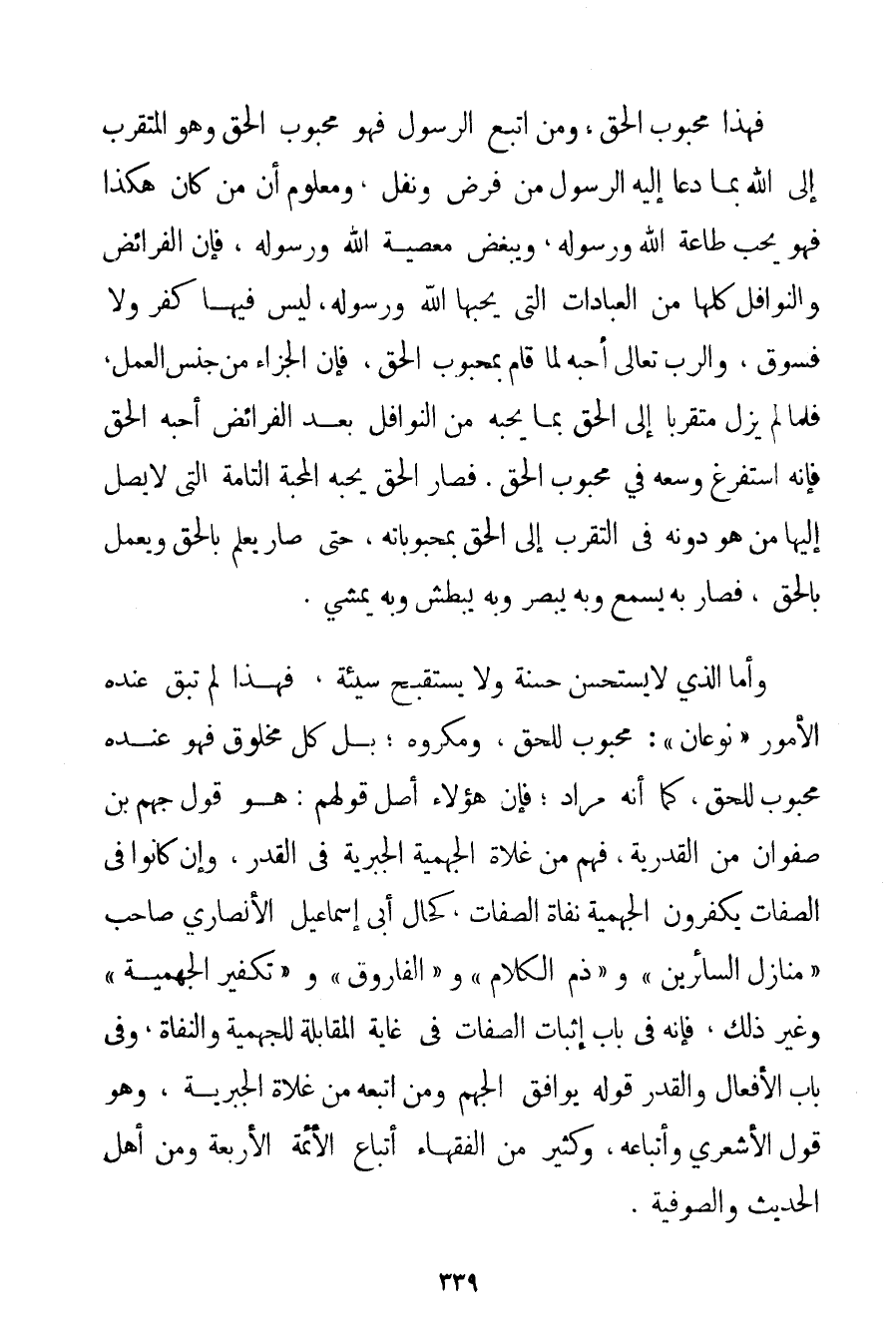 فَهَذَا مَحْبُوبُ الْحَقِّ وَمَنْ اتَّبَعَ الرَّسُولَ فَهُوَ مَحْبُوبُ الْحَقِّ وَهُوَ الْمُتَقَرِّبُ إلَى اللَّهِ بِمَا دَعَا إلَيْهِ الرَّسُولُ مِنْ فَرْضٍ وَنَفْلٍ وَمَعْلُومٌ أَنَّ مَنْ كَانَ هَكَذَا فَهُوَ يُحِبُّ طَاعَةَ اللَّهِ وَرَسُولِهِ وَيُبْغِضُ مَعْصِيَةَ اللَّهِ وَرَسُولِهِ فَإِنَّ الْفَرَائِضَ وَالنَّوَافِلَ كُلَّهَا مِنْ الْعِبَادَاتِ الَّتِي يُحِبُّهَا اللَّهُ وَرَسُولُهُ لَيْسَ فِيهَا كُفْرٌ وَلَا فُسُوقٌ وَالرَّبُّ تَعَالَى أَحَبَّهُ لَمَّا قَامَ بِمَحْبُوبِ الْحَقِّ فَإِنَّ الْجَزَاءَ مِنْ جِنْسِ الْعَمَلِ فَلَمَّا لَمْ يَزَلْ مُتَقَرِّبًا إلَى الْحَقِّ بِمَا يُحِبُّهُ مِنْ النَّوَافِلِ بَعْدَ الْفَرَائِضِ أَحَبَّهُ الْحَقُّ فَإِنَّهُ اسْتَفْرَغَ وُسْعَهُ فِي مَحْبُوبِ الْحَقِّ. فَصَارَ الْحَقُّ يُحِبُّهُ الْمَحَبَّةَ التَّامَّةَ الَّتِي لَا يَصِلُ إلَيْهَا مَنْ هُوَ دُونَهُ فِي التَّقَرُّبِ إلَى الْحَقِّ بِمَحْبُوبَاتِهِ حَتَّى صَارَ يَعْلَمُ بِالْحَقِّ وَيَعْمَلُ بِالْحَقِّ فَصَارَ بِهِ يَسْمَعُ وَبِهِ يُبْصِرُ وَبِهِ يَبْطِشُ وَبِهِ يَمْشِي. وَأَمَّا الَّذِي لَا يَسْتَحْسِنُ حَسَنَةً وَلَا يَسْتَقْبِحُ سَيِّئَةً فَهَذَا لَمْ تَبْقَ عِنْدَهُ الْأُمُورُ " نَوْعَانِ ": مَحْبُوبٌ لِلْحَقِّ وَمَكْرُوهٌ؛ بَلْ كُلُّ مَخْلُوقٍ فَهُوَ عِنْدَهُ مَحْبُوبٌ لِلْحَقِّ كَمَا أَنَّهُ مُرَادٌ؛ فَإِنَّ هَؤُلَاءِ أَصْلُ قَوْلِهِمْ: هُوَ قَوْلُ جَهْمِ بْنِ صَفْوَانَ مِنْ الْقَدَرِيَّةِ فَهُمْ مِنْ غُلَاةِ الْجَهْمِيَّة الْجَبْرِيَّةِ فِي الْقَدَرِ وَإِنْ كَانُوا فِي الصِّفَاتِ يُكَفِّرُونَ الْجَهْمِيَّة نفاة الصِّفَاتِ كَحَالِ أَبِي إسْمَاعِيلَ الْأَنْصَارِيِّ صَاحِبِ " مَنَازِلِ السَّائِرِينَ " وَ " ذَمِّ الْكَلَامِ " و " الْفَارُوقِ " و " تَكْفِيرِ الْجَهْمِيَّة " وَغَيْرِ ذَلِكَ فَإِنَّهُ فِي بَابِ إثْبَاتِ الصِّفَاتِ فِي غَايَةِ الْمُقَابَلَةِ للجهمية والْنُّفَاةِ وَفِي بَابِ الْأَفْعَالِ وَالْقَدَرِ قَوْلُهُ يُوَافِقُ الْجَهْمَ وَمَنْ اتَّبَعَهُ مِنْ غُلَاةِ الْجَبْرِيَّةِ وَهُوَ قَوْلُ الْأَشْعَرِيِّ وَأَتْبَاعِهِ وَكَثِيرٍ مِنْ الْفُقَهَاءِ أَتْبَاعِ الْأَئِمَّةِ الْأَرْبَعَةِ وَمِنْ أَهْلِ الْحَدِيثِ وَالصُّوفِيَّةِ.