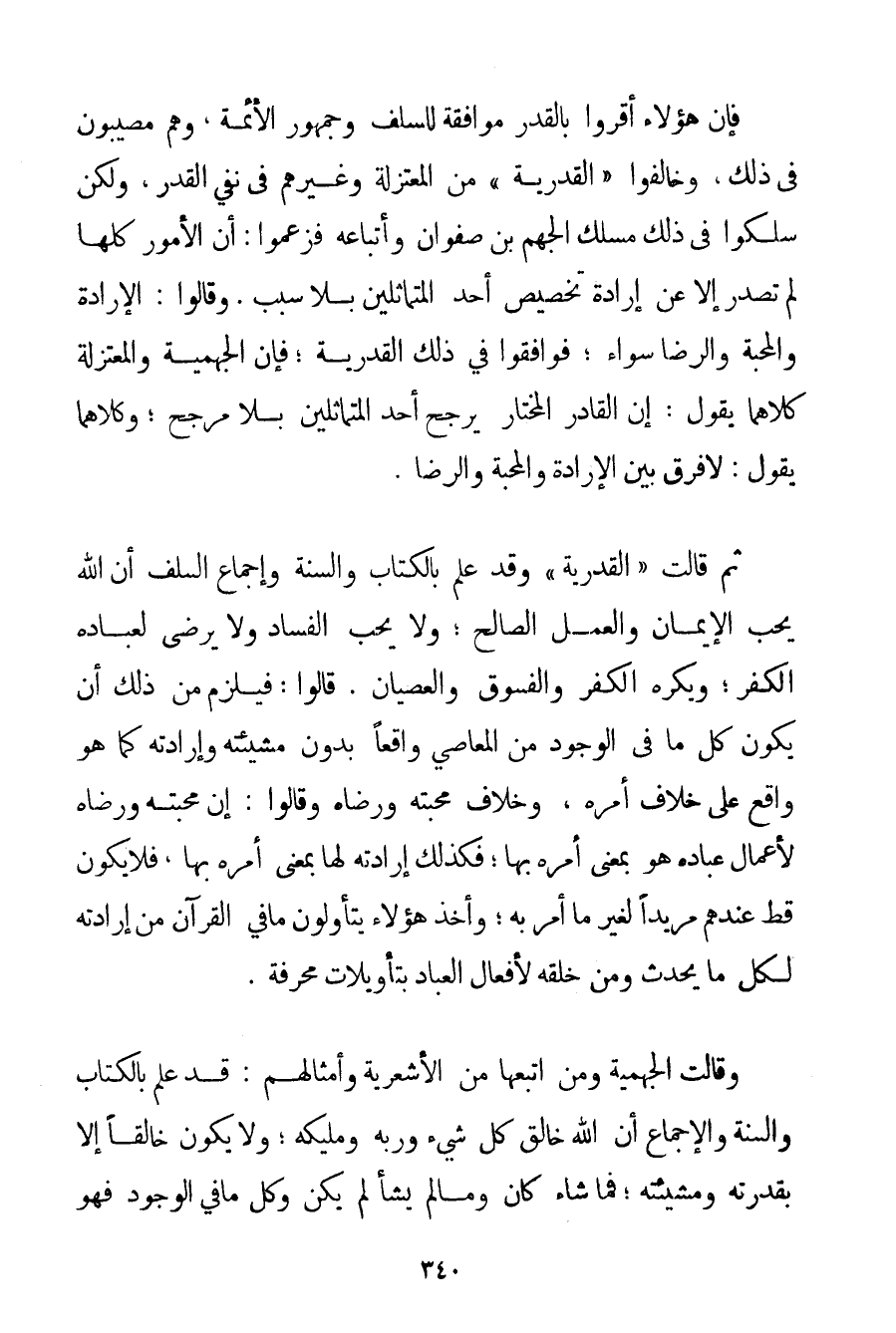 فَإِنَّ هَؤُلَاءِ أَقَرُّوا بِالْقَدَرِ مُوَافَقَةً لِلسَّلَفِ وَجُمْهُورِ الْأَئِمَّةِ وَهُمْ مُصِيبُونَ فِي ذَلِكَ وَخَالَفُوا " الْقَدَرِيَّةَ " مِنْ الْمُعْتَزِلَةِ وَغَيْرَهُمْ فِي نَفْيِ الْقَدَرِ وَلَكِنْ سَلَكُوا فِي ذَلِكَ مَسْلَكَ الْجَهْمِ بْنِ صَفْوَانَ وَأَتْبَاعِهِ فَزَعَمُوا: أَنَّ الْأُمُورَ كُلَّهَا لَمْ تَصْدُرْ إلَّا عَنْ إرَادَةِ تَخْصِيصِ أَحَدِ الْمُتَمَاثِلَيْنِ بِلَا سَبَبٍ. وَقَالُوا: الْإِرَادَةُ وَالْمَحَبَّةُ وَالرِّضَا سَوَاءٌ؛ فَوَافَقُوا فِي ذَلِكَ الْقَدَرِيَّةَ؛ فَإِنَّ الْجَهْمِيَّة وَالْمُعْتَزِلَةَ كِلَاهُمَا يَقُولُ: إنَّ الْقَادِرَ الْمُخْتَارَ يُرَجِّحُ أَحَدَ الْمُتَمَاثِلَيْنِ بِلَا مُرَجِّحٍ؛ وَكِلَاهُمَا يَقُولُ: لَا فَرْقَ بَيْنَ الْإِرَادَةِ وَالْمَحَبَّةِ وَالرِّضَا. ثُمَّ قَالَتْ " الْقَدَرِيَّةُ " وَقَدْ عُلِمَ بِالْكِتَابِ وَالسُّنَّةِ وَإِجْمَاعِ السَّلَفِ أَنَّ اللَّهَ يُحِبُّ الْإِيمَانَ وَالْعَمَلَ الصَّالِحَ؛ وَلَا يُحِبُّ الْفَسَادَ وَلَا يَرْضَى لِعِبَادِهِ الْكُفْرَ؛ وَيَكْرَهُ الْكُفْرَ وَالْفُسُوقَ وَالْعِصْيَانَ. قَالُوا: فَيَلْزَمُ مِنْ ذَلِكَ أَنْ يَكُونَ كُلُّ مَا فِي الْوُجُودِ مِنْ الْمَعَاصِي وَاقِعًا بِدُونِ مَشِيئَتِهِ وَإِرَادَتِهِ كَمَا هُوَ وَاقِعٌ عَلَى خِلَافِ أَمْرِهِ وَخِلَافِ مَحَبَّتِهِ وَرِضَاهُ وَقَالُوا: إنَّ مَحَبَّتَهُ وَرِضَاهُ لِأَعْمَالِ عِبَادِهِ هُوَ بِمَعْنَى أَمْرِهِ بِهَا؛ فَكَذَلِكَ إرَادَتُهُ لَهَا بِمَعْنَى أَمْرِهِ بِهَا فَلَا يَكُونُ قَطُّ عِنْدَهُمْ مُرِيدًا لِغَيْرِ مَا أَمَرَهُ بِهِ؛ وَأَخَذَ هَؤُلَاءِ يَتَأَوَّلُونَ مَا فِي الْقُرْآنِ مِنْ إرَادَتِهِ لِكُلِّ مَا يَحْدُثُ وَمِنْ خَلْقِهِ لِأَفْعَالِ الْعِبَادِ بِتَأْوِيلَاتِ مُحَرَّفَةٍ. وَقَالَتْ الْجَهْمِيَّة وَمَنْ اتَّبَعَهَا مِنْ الْأَشْعَرِيَّةِ وَأَمْثَالِهِمْ: قَدْ عُلِمَ بِالْكِتَابِ وَالسُّنَّةِ وَالْإِجْمَاعِ أَنَّ اللَّهَ خَالِقُ كُلِّ شَيْءٍ وَرَبُّهُ وَمَلِيكُهُ؛ وَلَا يَكُونُ خَالِقًا إلَّا بِقُدْرَتِهِ وَمَشِيئَتِهِ؛ فَمَا شَاءَ كَانَ وَمَا لَمْ يَشَأْ لَمْ يَكُنْ وَكُلُّ مَا فِي الْوُجُودِ فَهُوَ