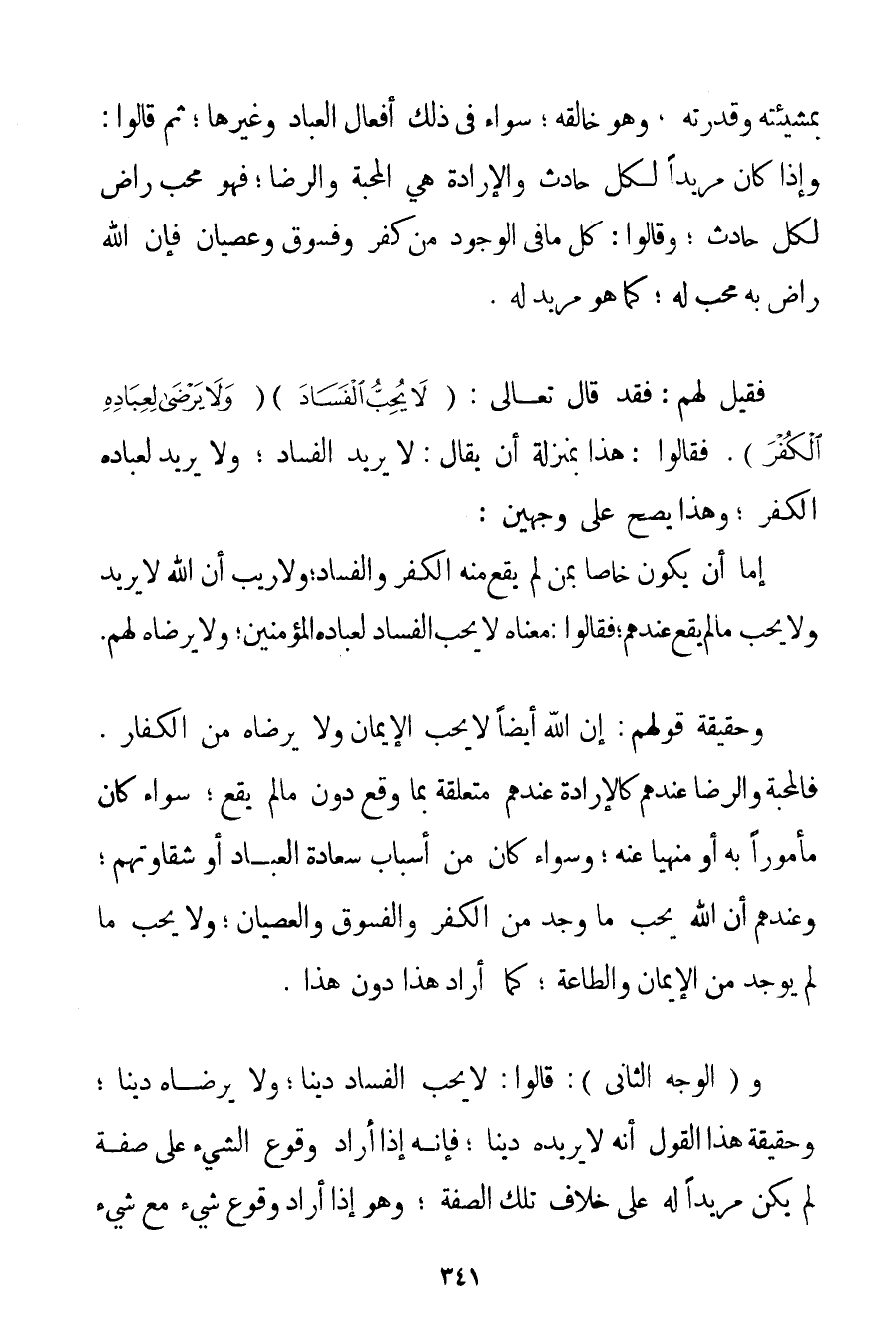 بِمَشِيئَتِهِ وَقُدْرَتِهِ وَهُوَ خَالِقُهُ؛ سَوَاءٌ فِي ذَلِكَ أَفْعَالُ الْعِبَادِ وَغَيْرُهَا؛ ثُمَّ قَالُوا: وَإِذَا كَانَ مُرِيدًا لِكُلِّ حَادِثٍ وَالْإِرَادَةُ هِيَ الْمَحَبَّةُ وَالرِّضَا؛ فَهُوَ مُحِبٌّ رَاضٍ لِكُلِّ حَادِثٍ؛ وَقَالُوا: كُلُّ مَا فِي الْوُجُودِ مِنْ كُفْرٍ وَفُسُوقٍ وَعِصْيَانٍ فَإِنَّ اللَّهَ رَاضٍ بِهِ مُحِبٌّ لَهُ؛ كَمَا هُوَ مُرِيدٌ لَهُ. فَقِيلَ لَهُمْ: فَقَدْ قَالَ تَعَالَى: {لَا يُحِبُّ الْفَسَادَ} {وَلَا يَرْضَى لِعِبَادِهِ الْكُفْرَ} . فَقَالُوا: هَذَا بِمَنْزِلَةِ أَنْ يُقَالَ: لَا يُرِيدُ الْفَسَادَ؛ وَلَا يُرِيدُ لِعِبَادِهِ الْكُفْرَ؛ وَهَذَا يَصِحُّ عَلَى وَجْهَيْنِ: إمَّا أَنْ يَكُونَ خَاصًّا بِمَنْ لَمْ يَقَعْ مِنْهُ الْكُفْرُ وَالْفَسَادُ؛ وَلَا رَيْبَ أَنَّ اللَّهَ لَا يُرِيدُ وَلَا يُحِبُّ مَا لَمْ يَقَعْ عِنْدَهُمْ؛ فَقَالُوا: مَعْنَاهُ لَا يُحِبُّ الْفَسَادَ لِعِبَادِهِ الْمُؤْمِنِينَ؛ وَلَا يَرْضَاهُ لَهُمْ. وَحَقِيقَةُ قَوْلِهِمْ: أَنَّ اللَّهَ أَيْضًا لَا يُحِبُّ الْإِيمَانَ وَلَا يَرْضَاهُ مِنْ الْكُفَّارِ. فَالْمَحَبَّةُ وَالرِّضَا عِنْدَهُمْ كَالْإِرَادَةِ عِنْدَهُمْ مُتَعَلِّقَةٌ بِمَا وَقَعَ دُونَ مَا لَمْ يَقَعْ؛ سَوَاءٌ كَانَ مَأْمُورًا بِهِ أَوْ مَنْهِيًّا عَنْهُ؛ وَسَوَاءٌ كَانَ مِنْ أَسْبَابِ سَعَادَةِ الْعِبَادِ أَوْ شَقَاوَتِهِمْ؛ وَعِنْدَهُمْ أَنَّ اللَّهَ يُحِبُّ مَا وُجِدَ مِنْ الْكُفْرِ وَالْفُسُوقِ وَالْعِصْيَانِ؛ وَلَا يُحِبُّ مَا لَمْ يُوجَدْ مِنْ الْإِيمَانِ وَالطَّاعَةِ؛ كَمَا أَرَادَ هَذَا دُونَ هَذَا.