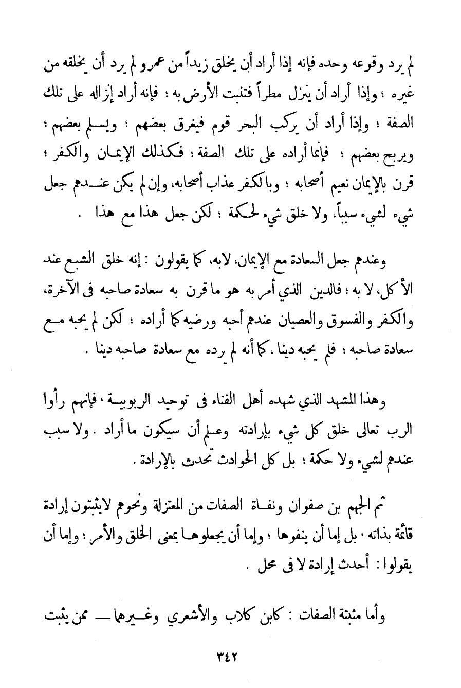 ثُمَّ الْجَهْمُ بْنُ صَفْوَانَ ونفاة الصِّفَاتِ مِنْ الْمُعْتَزِلَةِ وَنَحْوِهِمْ لَا يُثْبِتُونَ إرَادَةً قَائِمَةً بِذَاتِهِ بَلْ إمَّا أَنْ يَنْفُوهَا؛ وَإِمَّا أَنْ يَجْعَلُوهَا بِمَعْنَى الْخَلْقِ وَالْأَمْرِ؛ وَإِمَّا أَنْ يَقُولُوا: أَحْدَثَ إرَادَةً لَا فِي مَحَلٍّ. وَأَمَّا مُثْبِتَةُ الصِّفَاتِ: كَابْنِ كُلَّابٍ وَالْأَشْعَرِيِّ وَغَيْرِهِمَا - مِمَّنْ يُثْبِتُ