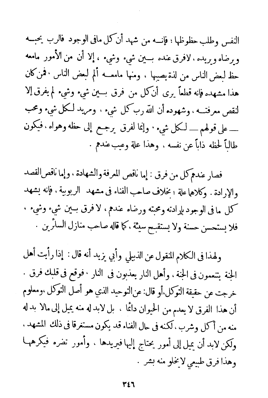 النَّفْسِ وَطَلَبَ حُظُوظَهَا؛ فَإِنَّهُ مَنْ شَهِدَ أَنَّ كُلَّ مَا فِي الْوُجُودِ فَالرَّبُّ يُحِبُّهُ وَيَرْضَاهُ وَيُرِيدُهُ لَا فَرْقَ عِنْدَهُ بَيْنَ شَيْءٍ وَشَيْءٍ إلَّا أَنَّ مِنْ الْأُمُورِ مَا مَعَهُ حَظٌّ لِبَعْضِ النَّاسِ مِنْ لَذَّةٍ يُصِيبُهَا وَمِنْهَا مَا مَعَهُ أَلَمٌ لِبَعْضِ النَّاسِ فَمَنْ كَانَ هَذَا مَشْهَدُهُ فَإِنَّهُ قَطْعًا يَرَى أَنَّ كُلَّ مَنْ فَرَّقَ بَيْنَ شَيْءٍ وَشَيْءٍ لَمْ يُفَرِّقْ إلَّا لِنَقْصِ مَعْرِفَتِهِ، وَشُهُودُهُ أَنَّ اللَّهَ رَبُّ كُلِّ شَيْءٍ وَمُرِيدٌ لِكُلِّ شَيْءٍ وَمُحِبٌّ - عَلَى قَوْلِهِمْ - لِكُلِّ شَيْءٍ وَإِنَّمَا لِفَرْقِ يَرْجِعُ إلَى حَظِّهِ وَهَوَاهُ فَيَكُونُ طَالِبًا لِحَظِّهِ ذَابًّا عَنْ نَفْسِهِ. وَهَذَا عِلَّةٌ وَعَيْبٌ عِنْدَهُمْ. فَصَارَ عِنْدَهُمْ كُلُّ مَنْ فَرَّقَ: إمَّا نَاقِصُ الْمَعْرِفَةِ وَالشَّهَادَةِ وَإِمَّا نَاقِصُ الْقَصْدِ وَالْإِرَادَةِ. وَكِلَاهُمَا عِلَّةٌ؛ بِخِلَافِ صَاحِبِ الْفَنَاءِ فِي مَشْهَدِ الرُّبُوبِيَّةِ فَإِنَّهُ يَشْهَدُ كُلَّ مَا فِي الْوُجُودِ بِإِرَادَتِهِ وَمَحَبَّتِهِ وَرِضَاهُ عِنْدَهُمْ لَا فَرْقَ بَيْنَ شَيْءٍ وَشَيْءٍ فَلَا يَسْتَحْسِنُ حَسَنَةً وَلَا يَسْتَقْبِحُ سَيِّئَةً كَمَا قَالَهُ صَاحِبُ مَنَازِلِ السَّائِرِينَ. وَلِهَذَا فِي الْكَلَامِ الْمَنْقُولِ عَنْ الذبيلي وَأَبِي يَزِيدَ أَنَّهُ قَالَ: إذَا رَأَيْت أَهْلَ الْجَنَّةِ يَتَنَعَّمُونَ فِي الْجَنَّةِ وَأَهْلَ النَّارِ يُعَذَّبُونَ فِي النَّارِ فَوَقَعَ فِي قَلْبِك فَرْقٌ. خَرَجْت عَنْ حَقِيقَةِ التَّوَكُّلِ أَوْ قَالَ: عَنْ التَّوْحِيدِ الَّذِي هُوَ أَصْلُ التَّوَكُّلِ وَمَعْلُومٌ أَنَّ هَذَا الْفَرْقَ لَا يُعْدَمُ مِنْ الْحَيَوَانِ دَائِمًا بَلْ لَا بُدَّ لَهُ مِنْهُ يَمِيلُ إلَى مَا لَا بُدَّ لَهُ مِنْهُ مِنْ أَكْلٍ وَشُرْبٍ لَكِنَّهُ فِي حَالِ الْفَنَاءِ قَدْ يَكُونُ مُسْتَغْرِقًا فِي ذَلِكَ الْمَشْهَدِ وَلَكِنْ لَا بُدَّ أَنْ يَمِيلَ إلَى أُمُورٍ يَحْتَاجُ إلَيْهَا فَيُرِيدُهَا وَأُمُورٍ تَضُرُّهُ فَيَكْرَهُهَا وَهَذَا فَرْقٌ طَبِيعِيٌّ لَا يَخْلُو مِنْهُ بَشَرٌ.