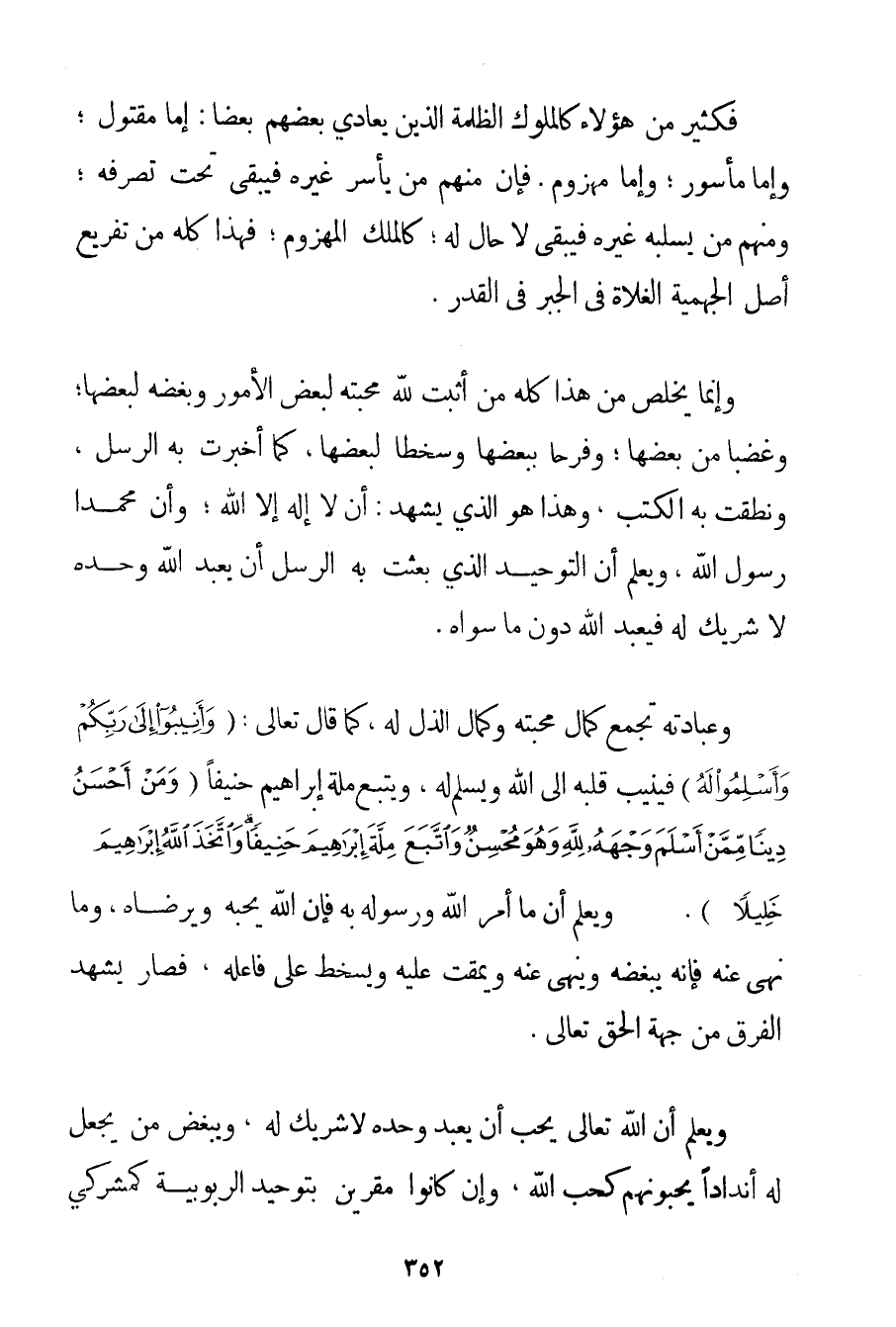 فَكَثِيرٌ مِنْ هَؤُلَاءِ كَالْمُلُوكِ الظَّلَمَةِ الَّذِينَ يُعَادِي بَعْضُهُمْ بَعْضًا: إمَّا مَقْتُولٌ؛ وَإِمَّا مَأْسُورٌ؛ وَإِمَّا مَهْزُومٌ. فَإِنَّ مِنْهُمْ مَنْ يَأْسِرُ غَيْرَهُ فَيَبْقَى تَحْتَ تَصَرُّفِهِ؛ وَمِنْهُمْ مَنْ يَسْلُبُهُ غَيْرُهُ فَيَبْقَى لَا حَالَ لَهُ؛ كَالْمَلِكِ الْمَهْزُومِ؛ فَهَذَا كُلُّهُ مِنْ تَفْرِيعِ أَصْلِ الْجَهْمِيَّة الْغُلَاةِ فِي الْجَبْرِ فِي الْقَدَرِ. وَإِنَّمَا يَخْلُصُ مِنْ هَذَا كُلِّهِ مَنْ أَثْبَتَ لِلَّهِ مَحَبَّتَهُ لِبَعْضِ الْأُمُورِ وَبُغْضَهُ لِبَعْضِهَا؛ وَغَضَبًا مِنْ بَعْضِهَا؛ وَفَرَحًا بِبَعْضِهَا وَسُخْطًا لِبَعْضِهَا كَمَا أَخْبَرَتْ بِهِ الرُّسُلُ وَنَطَقَتْ بِهِ الْكُتُبُ وَهَذَا هُوَ الَّذِي يَشْهَدُ: أَنْ لَا إلَهَ إلَّا اللَّهُ وَأَنَّ مُحَمَّدًا رَسُولُ اللَّهِ وَيَعْلَمُ أَنَّ التَّوْحِيدَ الَّذِي بُعِثَتْ بِهِ الرُّسُلُ أَنْ يُعْبَدَ اللَّهُ وَحْدَهُ لَا شَرِيكَ لَهُ فَيُعْبَدُ اللَّهُ دُونَ مَا سِوَاهُ. وَعِبَادَتُهُ تَجْمَعُ كَمَالَ مَحَبَّتِهِ وَكَمَالَ الذُّلِّ لَهُ كَمَا قَالَ تَعَالَى: {وَأَنِيبُوا إلَى رَبِّكُمْ وَأَسْلِمُوا لَهُ} فَيُنِيبُ قَلْبُهُ إلَى اللَّهِ وَيُسْلِمُ لَهُ وَيَتَّبِعُ مِلَّةَ إبْرَاهِيمَ حَنِيفًا {وَمَنْ أَحْسَنُ دِينًا مِمَّنْ أَسْلَمَ وَجْهَهُ لِلَّهِ وَهُوَ مُحْسِنٌ وَاتَّبَعَ مِلَّةَ إبْرَاهِيمَ حَنِيفًا وَاتَّخَذَ اللَّهُ إبْرَاهِيمَ خَلِيلًا} . وَيَعْلَمُ أَنَّ مَا أَمَرَ اللَّهُ وَرَسُولُهُ بِهِ فَإِنَّ اللَّهَ يُحِبُّهُ وَيَرْضَاهُ وَمَا نَهَى عَنْهُ فَإِنَّهُ يَبْغُضُهُ وَيَنْهَى عَنْهُ وَيَمْقُتُ عَلَيْهِ وَيَسْخَطُ عَلَى فَاعِلِهِ فَصَارَ يُشْهِدُ الْفَرْقَ مِنْ جِهَةِ الْحَقِّ تَعَالَى. وَيَعْلَمُ أَنَّ اللَّهَ تَعَالَى يُحِبُّ أَنْ يُعْبَدَ وَحْدَهُ لَا شَرِيكَ لَهُ، وَيُبْغِضُ مَنْ يَجْعَلُ لَهُ أَنْدَادًا يُحِبُّونَهُمْ كَحُبِّ اللَّهِ وَإِنْ كَانُوا مُقِرِّينَ بِتَوْحِيدِ الرُّبُوبِيَّةِ كَمُشْرِكِي