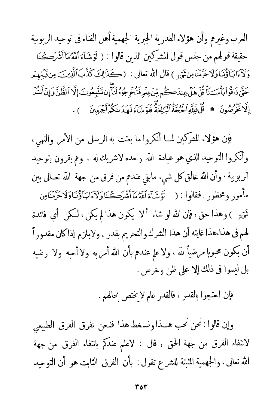 الْعَرَبِ وَغَيْرِهِمْ وَأَنَّ هَؤُلَاءِ الْقَدَرِيَّةَ الْجَبْرِيَّةَ الْجَهْمِيَّة أَهْلَ الْفَنَاءِ فِي تَوْحِيدِ الرُّبُوبِيَّةِ حَقِيقَةُ قَوْلِهِمْ مِنْ جِنْسِ قَوْلِ الْمُشْرِكِينَ الَّذِينَ قَالُوا: {لَوْ شَاءَ اللَّهُ مَا أَشْرَكْنَا وَلَا آبَاؤُنَا وَلَا حَرَّمْنَا مِنْ شَيْءٍ} قَالَ اللَّهُ تَعَالَى: {كَذَلِكَ كَذَّبَ الَّذِينَ مِنْ قَبْلِهِمْ حَتَّى ذَاقُوا بَأْسَنَا قُلْ هَلْ عِنْدَكُمْ مِنْ عِلْمٍ فَتُخْرِجُوهُ لَنَا إنْ تَتَّبِعُونَ إلَّا الظَّنَّ وَإِنْ أَنْتُمْ إلَّا تَخْرُصُونَ} {قُلْ فَلِلَّهِ الْحُجَّةُ الْبَالِغَةُ فَلَوْ شَاءَ لَهَدَاكُمْ أَجْمَعِينَ} . فَإِنَّ هَؤُلَاءِ الْمُشْرِكِينَ لَمَّا أَنْكَرُوا مَا بُعِثَتْ بِهِ الرُّسُلُ مِنْ الْأَمْرِ وَالنَّهْيِ وَأَنْكَرُوا التَّوْحِيدَ الَّذِي هُوَ عِبَادَةُ اللَّهِ وَحْدَهُ لَا شَرِيكَ لَهُ وَهُمْ يُقِرُّونَ بِتَوْحِيدِ الرُّبُوبِيَّةِ وَأَنَّ اللَّهَ خَالِقُ كُلِّ شَيْءٍ مَا بَقِيَ عِنْدَهُمْ مِنْ فَرْقٍ مِنْ جِهَةِ اللَّهِ تَعَالَى بَيْنَ مَأْمُورٍ وَمَحْظُورٍ. فَقَالُوا: {لَوْ شَاءَ اللَّهُ مَا أَشْرَكْنَا وَلَا آبَاؤُنَا وَلَا حَرَّمْنَا مِنْ شَيْءٍ} وَهَذَا حَقٌّ؛ فَإِنَّ اللَّهَ لَوْ شَاءَ أَنْ لَا يَكُونَ هَذَا لَمْ يَكُنْ؛ لَكِنْ أَيُّ فَائِدَةٍ لَهُمْ فِي هَذَا هَذَا غَايَتُهُ أَنَّ هَذَا الشِّرْكَ وَالتَّحْرِيمَ بِقَدَرِ وَلَا يَلْزَمُ إذَا كَانَ مَقْدُورًا أَنْ يَكُونَ مَحْبُوبًا مُرْضِيًا لِلَّهِ وَلَا عِلْمَ عِنْدَهُمْ بِأَنَّ اللَّهَ أَمَرَ بِهِ وَلَا أَحَبَّهُ وَلَا رَضِيَهُ بَلْ لَيْسُوا فِي ذَلِكَ إلَّا عَلَى ظَنٍّ وَخَرْصٍ. فَإِنْ احْتَجُّوا بِالْقَدَرِ فَالْقَدَرُ عَامٌّ لَا يَخْتَصُّ بِحَالِهِمْ. وَإِنْ قَالُوا: نَحْنُ نُحِبُّ هَذَا وَنَسْخَطُ هَذَا فَنَحْنُ نُفَرِّقُ الْفَرْقَ الطَّبِيعِيَّ لِانْتِفَاءِ الْفَرْقِ مِنْ جِهَةِ الْحَقِّ قَالَ: لَا عِلْمَ عِنْدَكُمْ بِانْتِفَاءِ الْفَرْقِ مِنْ جِهَةِ اللَّهِ تَعَالَى وَالْجَهْمِيَّة الْمُثْبِتَةُ لِلشَّرْعِ تَقُولُ: بِأَنَّ الْفَرْقَ الثَّابِتَ هُوَ أَنَّ التَّوْحِيدَ