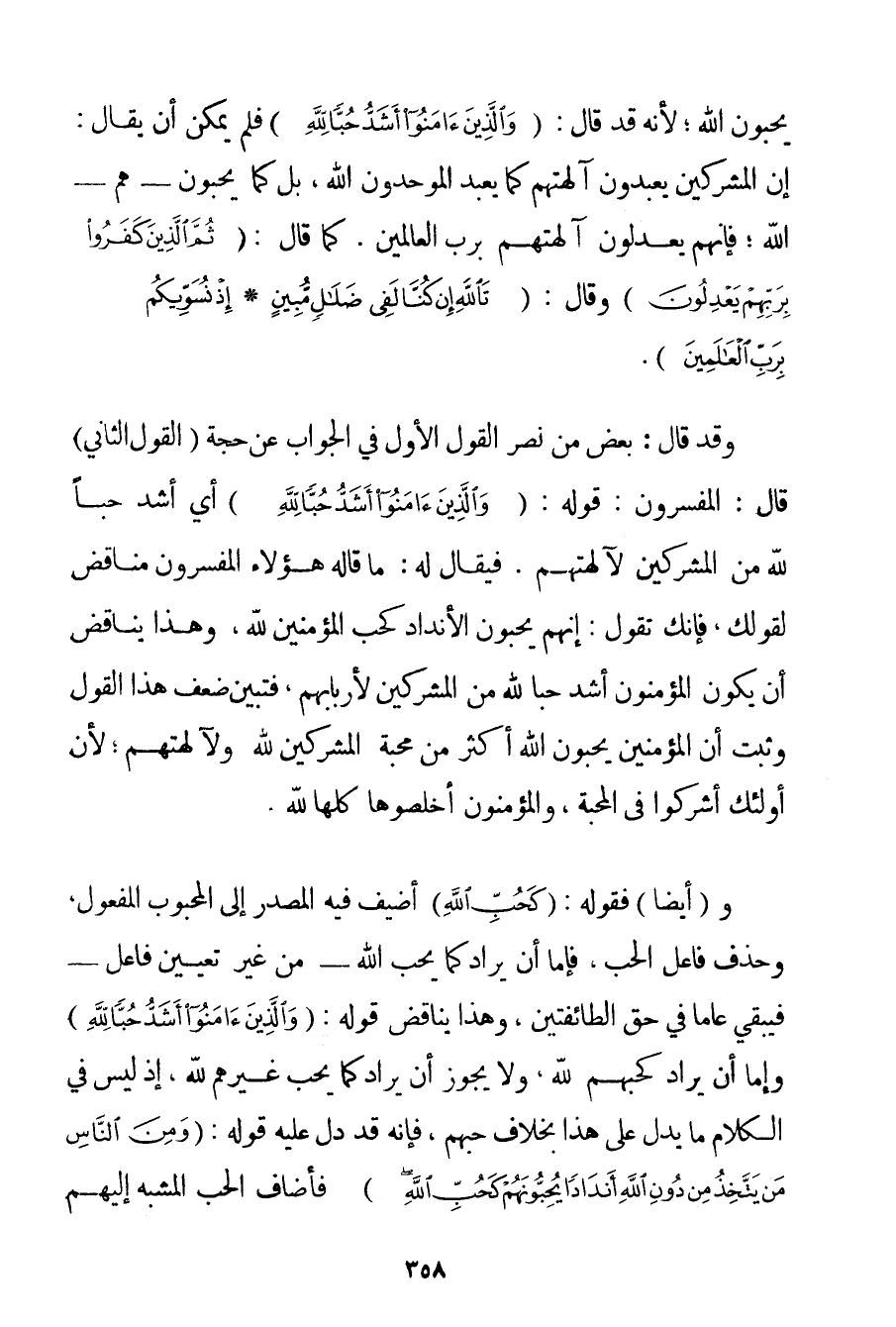 يُحِبُّونَ اللَّهَ؛ لِأَنَّهُ قَدْ قَالَ: {وَالَّذِينَ آمَنُوا أَشَدُّ حُبًّا لِلَّهِ} فَلَمْ يُمْكِنْ أَنْ يُقَالَ: إنَّ الْمُشْرِكِينَ يَعْبُدُونَ آلِهَتَهُمْ كَمَا يَعْبُدُ الْمُوَحِّدُونَ اللَّهَ بَلْ كَمَا يُحِبُّونَ - هُمْ - اللَّهَ؛ فَإِنَّهُمْ يَعْدِلُونَ آلِهَتَهُمْ بِرَبِّ الْعَالَمِينَ. كَمَا قَالَ: {ثُمَّ الَّذِينَ كَفَرُوا بِرَبِّهِمْ يَعْدِلُونَ} وَقَالَ: {تَاللَّهِ إنْ كُنَّا لَفِي ضَلَالٍ مُبِينٍ} {إذْ نُسَوِّيكُمْ بِرَبِّ الْعَالَمِينَ} . وَقَدْ قَالَ: بَعْضُ مَنْ نَصَرَ الْقَوْلَ الْأَوَّلَ فِي الْجَوَابِ عَنْ حُجَّةِ (الْقَوْلِ الثَّانِي) قَالَ: الْمُفَسِّرُونَ: قَوْلُهُ: {وَالَّذِينَ آمَنُوا أَشَدُّ حُبًّا لِلَّهِ} أَيْ أَشَدُّ حُبًّا لِلَّهِ مِنْ الْمُشْرِكِينَ لِآلِهَتِهِمْ. فَيُقَالُ لَا: مَا قَالَهُ هَؤُلَاءِ الْمُفَسِّرُونَ مُنَاقِضٌ لِقَوْلِك فَإِنَّك تَقُولُ: إنَّهُمْ يُحِبُّونَ الْأَنْدَادَ كَحُبِّ الْمُؤْمِنِينَ لِلَّهِ وَهَذَا يُنَاقِضُ أَنْ يَكُونَ الْمُؤْمِنُونَ أَشَدَّ حُبًّا لِلَّهِ مِنْ الْمُشْرِكِينَ لِأَرْبَابِهِمْ فَتَبَيَّنَ ضَعْفُ هَذَا الْقَوْلِ وَثَبَتَ أَنَّ الْمُؤْمِنِينَ يُحِبُّونَ اللَّهَ أَكْثَرَ مِنْ مَحَبَّةِ الْمُشْرِكِينَ لِلَّهِ وَلِآلِهَتِهِمْ؛ لِأَنَّ أُولَئِكَ أَشْرَكُوا فِي الْمَحَبَّةِ وَالْمُؤْمِنُونَ أَخْلَصُوهَا كُلَّهَا لِلَّهِ. وَ (أَيْضًا فَقَوْلُهُ) : {كَحُبِّ اللَّهِ} أَضِيفَ فِيهِ الْمَصْدَرُ إلَى الْمَحْبُوبِ الْمَفْعُولِ وَحُذِفَ فَاعِلُ الْحُبِّ فَإِمَّا أَنْ يُرَادَ كَمَا يُحِبُّ اللَّهُ - مِنْ غَيْرِ تَعْيِينِ فَاعِلٍ - فَيَبْقَى عَامًّا فِي حَقِّ الطَّائِفَتَيْنِ وَهَذَا يُنَاقِضُ قَوْلَهُ: {وَالَّذِينَ آمَنُوا أَشَدُّ حُبًّا لِلَّهِ} وَإِمَّا أَنْ يُرَادَ كَحُبِّهِمْ لِلَّهِ وَلَا يَجُوزُ أَنْ يُرَادَ كَمَا يُحِبُّ غَيْرُهُمْ لِلَّهِ إذْ لَيْسَ فِي الْكَلَامِ مَا يَدُلُّ عَلَى هَذَا بِخِلَافِ حُبِّهِمْ فَإِنَّهُ قَدْ دَلَّ عَلَيْهِ قَوْلُهُ: {وَمِنَ النَّاسِ مَنْ يَتَّخِذُ مِنْ دُونِ اللَّهِ أَنْدَادًا يُحِبُّونَهُمْ كَحُبِّ اللَّهِ} فَأَضَافَ الْحُبَّ الْمُشَبَّهَ إلَيْهِمْ