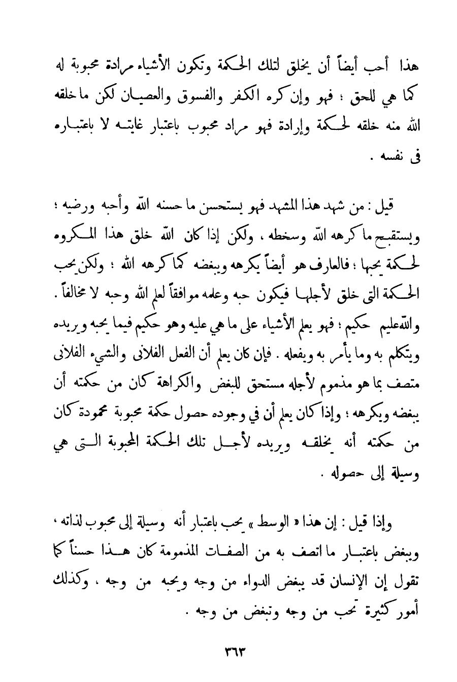 هَذَا أَحَبَّ أَيْضًا أَنْ يُخْلَقَ لِتِلْكَ الْحِكْمَةِ وَتَكُونُ الْأَشْيَاءُ مُرَادَةً مَحْبُوبَةً لَهُ كَمَا هِيَ لِلْحَقِّ؛ فَهُوَ وَإِنْ كَرِهَ الْكُفْرَ وَالْفُسُوقَ وَالْعِصْيَانَ لَكِنْ مَا خَلَقَهُ اللَّهُ مِنْهُ خَلَقَهُ لِحِكْمَةِ وَإِرَادَةٍ فَهُوَ مُرَادٌ مَحْبُوبٌ بِاعْتِبَارِ غَايَتِهِ لَا بِاعْتِبَارِهِ فِي نَفْسِهِ. قِيلَ: مَنْ شَهِدَ هَذَا الْمَشْهَدَ فَهُوَ يَسْتَحْسِنُ مَا حَسَّنَهُ اللَّهُ وَأَحَبَّهُ وَرَضِيَهُ؛ وَيَسْتَقْبِحُ مَا كَرِهَهُ اللَّهُ، وَسَخِطَهُ وَلَكِنْ إذَا كَانَ اللَّهُ خَلَقَ هَذَا الْمَكْرُوهَ لِحِكْمَةِ يُحِبُّهَا؛ فَالْعَارِفُ هُوَ أَيْضًا يَكْرَهُهُ وَيُبْغِضُهُ كَمَا كَرِهَهُ اللَّهُ؛ وَلَكِنْ يُحِبُّ الْحِكْمَةَ الَّتِي خُلِقَ لِأَجْلِهَا فَيَكُونُ حُبُّهُ وَعِلْمُهُ مُوَافِقًا لِعِلْمِ اللَّهِ وَحُبِّهِ لَا مُخَالِفًا. وَاَللَّهُ عَلِيمٌ حَكِيمٌ؛ فَهُوَ يَعْلَمُ الْأَشْيَاءَ عَلَى مَا هِيَ عَلَيْهِ وَهُوَ حَكِيمٌ فِيمَا يُحِبُّهُ وَيُرِيدُهُ وَيَتَكَلَّمُ بِهِ وَمَا يَأْمُرُ بِهِ وَيَفْعَلُهُ. فَإِنْ كَانَ يَعْلَمُ أَنَّ الْفِعْلَ الْفُلَانِيَّ وَالشَّيْءَ الْفُلَانِيَّ مُتَّصِفٌ بِمَا هُوَ مَذْمُومٌ لِأَجْلِهِ مُسْتَحِقٌّ لِلْبُغْضِ وَالْكَرَاهَةِ كَانَ مِنْ حِكْمَتِهِ أَنْ يُبْغِضَهُ وَيَكْرَهَهُ؛ وَإِذَا كَانَ يَعْلَمُ أَنَّ فِي وُجُودِهِ حُصُولَ حِكْمَةٍ مَحْبُوبَةٍ مَحْمُودَةٍ كَانَ مِنْ حِكْمَتِهِ أَنَّهُ يَخْلُقُهُ وَيُرِيدُهُ لِأَجْلِ تِلْكَ الْحِكْمَةِ الْمَحْبُوبَةِ الَّتِي هِيَ وَسِيلَةٌ إلَى حُصُولِهِ. وَإِذَا قِيلَ: إنَّ هَذَا " الْوَسَطَ " يُحَبُّ بِاعْتِبَارِ أَنَّهُ وَسِيلَةٌ إلَى مَحْبُوبٍ لِذَاتِهِ، وَيُبْغَضُ بِاعْتِبَارِ مَا اتَّصَفَ بِهِ مِنْ الصِّفَاتِ الْمَذْمُومَةِ كَانَ هَذَا حَسَنًا كَمَا تَقُولُ إنَّ الْإِنْسَانَ قَدْ يُبْغِضُ الدَّوَاءَ مِنْ وَجْهٍ وَيُحِبُّهُ مِنْ وَجْهٍ وَكَذَلِكَ أُمُورٌ كَثِيرَةٌ تُحَبُّ مِنْ وَجْهٍ وَتُبْغَضُ مِنْ وَجْهٍ.