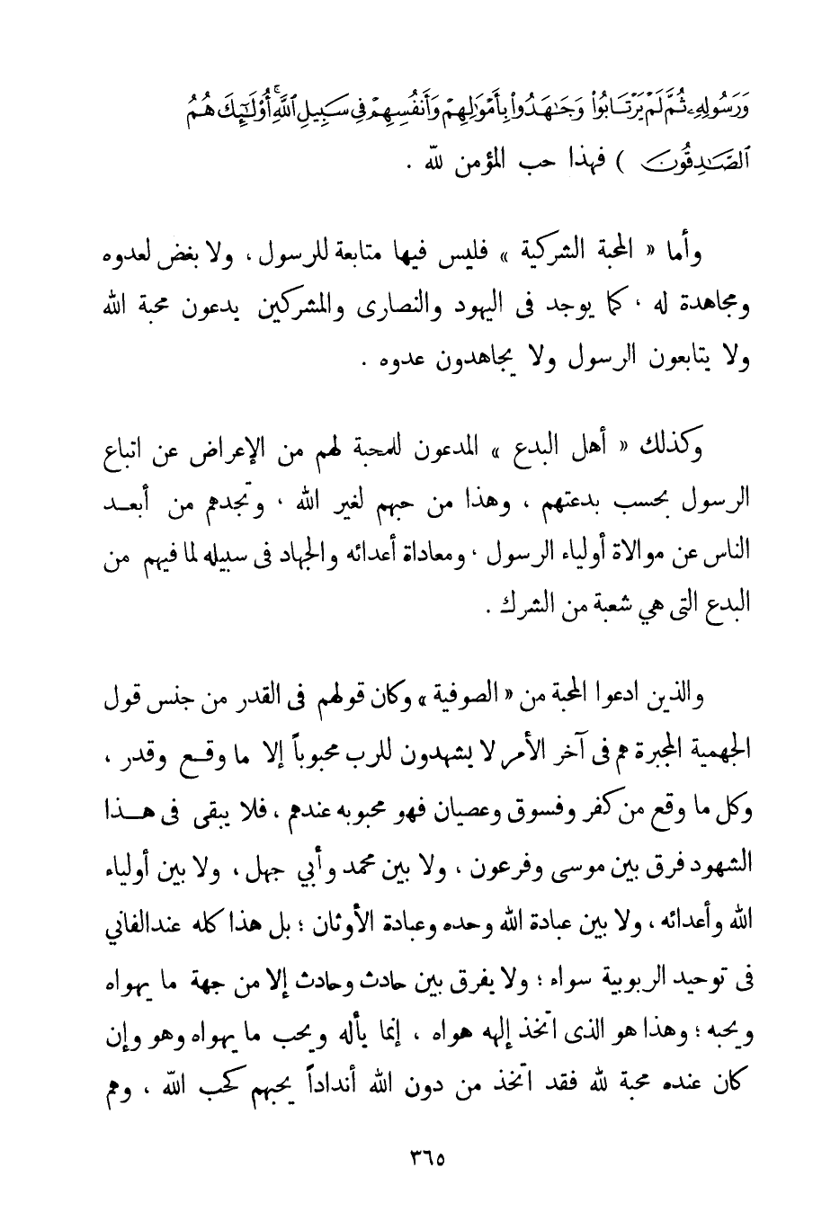 وَأَمَّا " الْمَحَبَّةُ الشركية " فَلَيْسَ فِيهَا مُتَابَعَةٌ لِلرَّسُولِ وَلَا بُغْضٌ لِعَدُوِّهِ وَمُجَاهَدَةٌ لَهُ كَمَا يُوجَدُ فِي الْيَهُودِ وَالنَّصَارَى وَالْمُشْرِكِينَ يَدَّعُونَ مَحَبَّةَ اللَّهِ وَلَا يُتَابِعُونَ الرَّسُولَ وَلَا يُجَاهِدُونَ عَدُوَّهُ. وَكَذَلِكَ " أَهْلُ الْبِدَعِ " الْمُدَّعُونَ لِلْمَحَبَّةِ لَهُمْ مِنْ الْإِعْرَاضِ عَنْ اتِّبَاعِ الرَّسُولِ بِحَسَبِ بِدْعَتِهِمْ وَهَذَا مِنْ حُبِّهِمْ لِغَيْرِ اللَّهِ وَتَجِدُهُمْ مِنْ أَبْعَدِ النَّاسِ عَنْ مُوَالَاةِ أَوْلِيَاءِ الرَّسُولِ وَمُعَادَاةِ أَعْدَائِهِ وَالْجِهَادِ فِي سَبِيلِهِ لِمَا فِيهِمْ مِنْ الْبِدَعِ الَّتِي هِيَ شُعْبَةٌ مِنْ الشِّرْكِ. وَاَلَّذِينَ ادَّعَوْا الْمَحَبَّةَ مِنْ " الصُّوفِيَّةِ " وَكَانَ قَوْلُهُمْ فِي الْقَدَرِ مِنْ جِنْسِ قَوْلِ الْجَهْمِيَّة الْمُجْبِرَةِ هُمْ فِي آخِرِ الْأَمْرِ لَا يَشْهَدُونَ لِلرَّبِّ مَحْبُوبًا إلَّا مَا وَقَعَ وَقُدِّرَ وَكُلُّ مَا وَقَعَ مِنْ كُفْرٍ وَفُسُوقٍ وَعِصْيَانٍ فَهُوَ مَحْبُوبُهُ عِنْدَهُمْ فَلَا يَبْقَى فِي هَذَا الشُّهُودِ فَرْقٌ بَيْنَ مُوسَى وَفِرْعَوْنَ وَلَا بَيْنَ مُحَمَّدٍ وَأَبِي جَهْلٍ وَلَا بَيْنَ أَوْلِيَاءِ اللَّهِ وَأَعْدَائِهِ وَلَا بَيْنَ عِبَادَةِ اللَّهِ وَحْدَهُ وَعِبَادَةِ الْأَوْثَانِ؛ بَلْ هَذَا كُلُّهُ عِنْدَ الْفَانِي فِي تَوْحِيدِ الرُّبُوبِيَّةِ سَوَاءٌ؛ وَلَا يُفَرِّقُ بَيْنَ حَادِثٍ وَحَادِثٍ إلَّا مِنْ جِهَةِ مَا يَهْوَاهُ وَيُحِبُّهُ؛ وَهَذَا هُوَ الَّذِي اتَّخَذَ إلَهَهُ هَوَاهُ إنَّمَا يَأْلَهُ وَيُحِبُّ مَا يَهْوَاهُ وَهُوَ وَإِنْ كَانَ عِنْدَهُ مَحَبَّةً لِلَّهِ فَقَدْ اتَّخَذَ مِنْ دُونِ اللَّهِ أَنْدَادًا يُحِبُّهُمْ كَحُبِّ اللَّهِ وَهُمْ