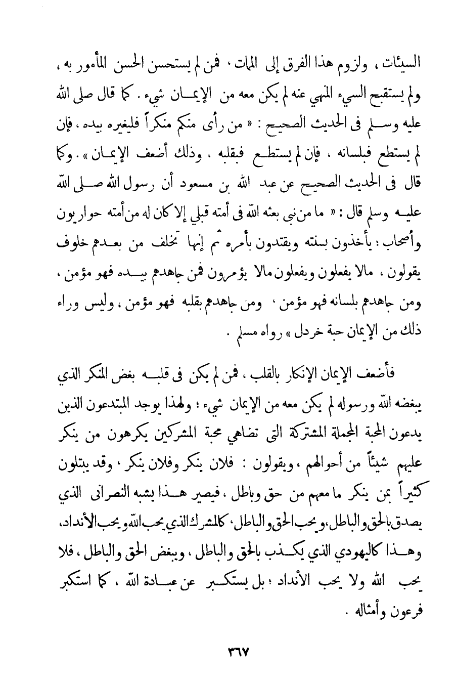 السَّيِّئَاتِ وَلُزُومُ هَذَا الْفَرْقِ إلَى الْمَمَاتِ فَمَنْ لَمْ يَسْتَحْسِنْ الْحَسَنَ الْمَأْمُورَ بِهِ وَلَمْ يَسْتَقْبِحْ السَّيِّئَ الْمَنْهِيَّ عَنْهُ لَمْ يَكُنْ مَعَهُ مِنْ الْإِيمَانِ شَيْءٌ. كَمَا قَالَ صَلَّى اللَّهُ عَلَيْهِ وَسَلَّمَ فِي الْحَدِيثِ الصَّحِيحِ: {مَنْ رَأَى مِنْكُمْ مُنْكَرًا فَلْيُغَيِّرْهُ بِيَدِهِ فَإِنْ لَمْ يَسْتَطِعْ فَبِلِسَانِهِ فَإِنْ لَمْ يَسْتَطِعْ فَبِقَلْبِهِ وَذَلِكَ أَضْعَفُ الْإِيمَانِ} . وَكَمَا قَالَ فِي الْحَدِيثِ الصَّحِيحِ عَنْ عَبْدِ اللَّهِ بْنِ مَسْعُودٍ أَنَّ رَسُولَ اللَّهِ صَلَّى اللَّهُ عَلَيْهِ وَسَلَّمَ قَالَ: {مَا مِنْ نَبِيٍّ بَعَثَهُ اللَّهُ فِي أُمَّتِهِ قَبْلِي إلَّا كَانَ لَهُ مِنْ أُمَّتِهِ حَوَارِيُّونَ وَأَصْحَابٌ؛ يَأْخُذُونَ بِسُنَّتِهِ وَيَقْتَدُونَ بِأَمْرِهِ ثُمَّ إنَّهَا تَخْلُفُ مِنْ بَعْدِهِمْ خُلُوفٌ يَقُولُونَ مَا لَا يَفْعَلُونَ وَيَفْعَلُونَ مَا لَا يُؤْمَرُونَ فَمَنْ جَاهَدَهُمْ بِيَدِهِ فَهُوَ مُؤْمِنٌ وَمَنْ جَاهَدَهُمْ بِلِسَانِهِ فَهُوَ مُؤْمِنٌ، وَمَنْ جَاهَدَهُمْ بِقَلْبِهِ فَهُوَ مُؤْمِنٌ وَلَيْسَ وَرَاءَ ذَلِكَ مِنْ الْإِيمَانِ حَبَّةُ خَرْدَلٍ} رَوَاهُ مُسْلِمٌ. فَأَضْعَفُ الْإِيمَانِ الْإِنْكَارُ بِالْقَلْبِ فَمَنْ لَمْ يَكُنْ فِي قَلْبِهِ بُغْضُ الْمُنْكَرِ الَّذِي يُبْغِضُهُ اللَّهُ وَرَسُولُهُ لَمْ يَكُنْ مَعَهُ مِنْ الْإِيمَانِ شَيْءٌ؛ وَلِهَذَا يُوجَدُ الْمُبْتَدِعُونَ الَّذِينَ يَدَّعُونَ الْمَحَبَّةَ الْمُجْمَلَةَ الْمُشْتَرَكَةَ الَّتِي تُضَاهِي مَحَبَّةَ الْمُشْرِكِينَ يَكْرَهُونَ مَنْ يُنْكِرُ عَلَيْهِمْ شَيْئًا مِنْ أَحْوَالِهِمْ وَيَقُولُونَ: فُلَانٌ يُنْكِرُ وَفُلَانٌ يُنْكِرُ وَقَدْ يُبْتَلَوْنَ كَثِيرًا بِمَنْ يُنْكِرُ مَا مَعَهُمْ مِنْ حَقٍّ وَبَاطِلٍ فَيَصِيرُ هَذَا يُشْبِهُ النَّصْرَانِيَّ الَّذِي يُصَدِّقُ بِالْحَقِّ وَالْبَاطِلِ وَيُحِبُّ الْحَقَّ وَالْبَاطِلَ كَالْمُشْرِكِ الَّذِي يُحِبُّ اللَّهَ وَيُحِبُّ الْأَنْدَادَ وَهَذَا كَالْيَهُودِيِّ الَّذِي يُكَذِّبُ بِالْحَقِّ وَالْبَاطِلِ وَيُبْغِضُ الْحَقَّ وَالْبَاطِلَ فَلَا يُحِبُّ اللَّهَ وَلَا يُحِبُّ الْأَنْدَادَ؛ بَلْ يَسْتَكْبِرُ عَنْ عِبَادَةِ اللَّهِ كَمَا اسْتَكْبَرَ فِرْعَوْنُ وَأَمْثَالُهُ.