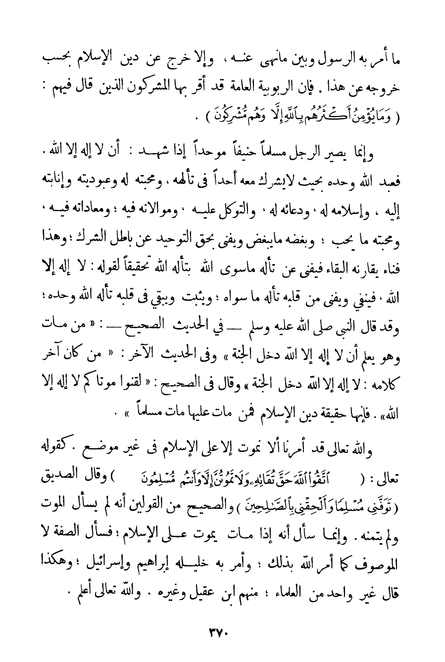 مَا أَمَرَ بِهِ الرَّسُولُ وَبَيْنَ مَا نَهَى عَنْهُ وَإِلَّا خَرَجَ عَنْ دِينِ الْإِسْلَامِ بِحَسَبِ خُرُوجِهِ عَنْ هَذَا فَإِنَّ الرُّبُوبِيَّةَ الْعَامَّةَ قَدْ أَقَرَّ بِهَا الْمُشْرِكُونَ الَّذِينَ قَالَ فِيهِمْ: {وَمَا يُؤْمِنُ أَكْثَرُهُمْ بِاللَّهِ إلَّا وَهُمْ مُشْرِكُونَ} . وَإِنَّمَا يَصِيرُ الرَّجُلُ مُسْلِمًا حَنِيفًا مُوَحِّدًا إذَا شَهِدَ: أَنْ لَا إلَهَ إلَّا اللَّهُ. فَعَبَدَ اللَّهَ وَحْدَهُ بِحَيْثُ لَا يُشْرِكُ مَعَهُ أَحَدًا فِي تَأَلُّهِهِ وَمَحَبَّتِهِ لَهُ وَعُبُودِيَّتِهِ وَإِنَابَتِهِ إلَيْهِ وَإِسْلَامِهِ لَهُ وَدُعَائِهِ لَهُ وَالتَّوَكُّلِ عَلَيْهِ وَمُوَالَاتِهِ فِيهِ؛ وَمُعَادَاتِهِ فِيهِ؛ وَمَحَبَّتِهِ مَا يُحِبُّ؛ وَبُغْضِهِ مَا يُبْغِضُ وَيَفْنَى بِحَقِّ التَّوْحِيدِ عَنْ بَاطِلِ الشِّرْكِ؛ وَهَذَا فَنَاءٌ يُقَارِنُهُ الْبَقَاءُ فَيَفْنَى عَنْ تَأَلُّهِ مَا سِوَى اللَّهِ بِتَأَلُّهِ اللَّهِ تَحْقِيقًا لِقَوْلِهِ: لَا إلَهَ إلَّا اللَّهُ فَيَنْفِي وَيَفْنَى مِنْ قَلْبِهِ تَأَلُّهَ مَا سِوَاهُ؛ وَيُثْبِتُ وَيُبْقِي فِي قَلْبِهِ تَأَلُّهَ اللَّهِ وَحْدَهُ؛ وَقَدْ قَالَ النَّبِيُّ صَلَّى اللَّهُ عَلَيْهِ وَسَلَّمَ - فِي الْحَدِيثِ الصَّحِيحِ -: {مَنْ مَاتَ وَهُوَ يَعْلَمُ أَنْ لَا إلَهَ إلَّا اللَّهُ دَخَلَ الْجَنَّةَ} وَفِي الْحَدِيثِ الْآخَرِ: {مَنْ كَانَ آخِرُ كَلَامِهِ: لَا إلَهَ إلَّا اللَّهُ دَخَلَ الْجَنَّةَ} وَقَالَ فِي الصَّحِيحِ: {لَقِّنُوا مَوْتَاكُمْ لَا إلَهَ إلَّا اللَّهُ فَإِنَّهَا حَقِيقَةُ دِينِ الْإِسْلَامِ فَمَنْ مَاتَ عَلَيْهَا مَاتَ مُسْلِمًا} . وَاَللَّهُ تَعَالَى قَدْ أَمَرَنَا أَلَّا نَمُوتَ إلَّا عَلَى الْإِسْلَامِ فِي غَيْرِ مَوْضِعٍ. كَقَوْلِهِ تَعَالَى: {اتَّقُوا اللَّهَ حَقَّ تُقَاتِهِ وَلَا تَمُوتُنَّ إلَّا وَأَنْتُمْ مُسْلِمُونَ} وَقَالَ الصِّدِّيقُ {تَوَفَّنِي مُسْلِمًا وَأَلْحِقْنِي بِالصَّالِحِينَ} وَالصَّحِيحُ مِنْ الْقَوْلَيْنِ أَنَّهُ لَمْ يَسْأَلْ الْمَوْتَ وَلَمْ يَتَمَنَّهُ. وَإِنَّمَا سَأَلَ أَنَّهُ إذَا مَاتَ يَمُوتُ عَلَى الْإِسْلَامِ؛ فَسَأَلَ الصِّفَةَ لَا الْمَوْصُوفَ كَمَا أَمَرَ اللَّهُ بِذَلِكَ؛ وَأَمَرَ بِهِ خَلِيلَهُ إبْرَاهِيمَ وَإِسْرَائِيلَ؛ وَهَكَذَا قَالَ غَيْرُ وَاحِدٍ مِنْ الْعُلَمَاءِ؛ مِنْهُمْ ابْنُ عَقِيلٍ وَغَيْرُهُ. وَاَللَّهُ تَعَالَى أَعْلَمُ.