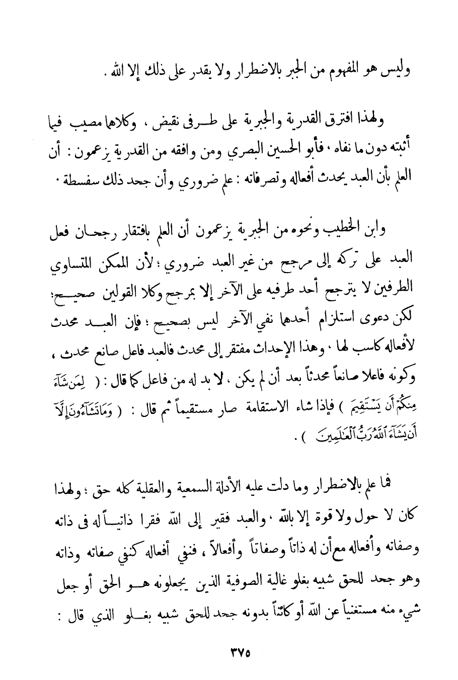 وَلَيْسَ هُوَ الْمَفْهُومَ مِنْ الْجَبْرِ بِالِاضْطِرَارِ وَلَا يَقْدِرُ عَلَى ذَلِكَ إلَّا اللَّهُ. وَلِهَذَا افْتَرَقَ الْقَدَرِيَّةُ وَالْجَبْرِيَّةُ عَلَى طَرَفَيْ نَقِيضٍ وَكِلَاهُمَا مُصِيبٌ فِيمَا أَثْبَتَهُ دُونَ مَا نَفَاهُ فَأَبُو الْحُسَيْنِ الْبَصْرِيُّ وَمَنْ وَافَقَهُ مِنْ الْقَدَرِيَّةِ يَزْعُمُونَ: أَنَّ الْعِلْمَ بِأَنَّ الْعَبْدَ يُحْدِثُ أَفْعَالَهُ وَتَصَرُّفَاتِهِ: عِلْمٌ ضَرُورِيٌّ وَأَنْ جَحْدَ ذَلِكَ سَفْسَطَةٌ. وَابْنُ الْخَطِيبِ وَنَحْوُهُ مِنْ الْجَبْرِيَّةِ يَزْعُمُونَ أَنَّ الْعِلْمَ بِافْتِقَارِ رُجْحَانِ فِعْلِ الْعَبْدِ عَلَى تَرْكِهِ إلَى مُرَجِّحٍ مِنْ غَيْرِ الْعَبْدِ ضَرُورِيٌّ؛ لِأَنَّ الْمُمْكِنَ الْمُتَسَاوِيَ الطَّرَفَيْنِ لَا يَتَرَجَّحُ أَحَدُ طَرَفَيْهِ عَلَى الْآخَرِ إلَّا بِمُرَجِّحِ وَكِلَا الْقَوْلَيْنِ صَحِيحٌ؛ لَكِنَّ دَعْوَى اسْتِلْزَامِ أَحَدِهِمَا نَفْيَ الْآخَرِ لَيْسَ بِصَحِيحِ؛ فَإِنَّ الْعَبْدَ مُحْدِثٌ لِأَفْعَالِهِ كَاسِبٌ لَهَا وَهَذَا الْإِحْدَاثُ مُفْتَقِرٌ إلَى مُحْدِثٍ فَالْعَبْدُ فَاعِلٌ صَانِعٌ مُحْدِثٌ وَكَوْنُهُ فَاعِلًا صَانِعًا مُحْدِثًا بَعْدَ أَنْ لَمْ يَكُنْ لَا بُدَّ لَهُ مِنْ فَاعِلٍ كَمَا قَالَ: {لِمَنْ شَاءَ مِنْكُمْ أَنْ يَسْتَقِيمَ} فَإِذَا شَاءَ الِاسْتِقَامَةَ صَارَ مُسْتَقِيمًا ثُمَّ قَالَ: {وَمَا تَشَاءُونَ إلَّا أَنْ يَشَاءَ اللَّهُ رَبُّ الْعَالَمِينَ} . فَمَا عُلِمَ بِالِاضْطِرَارِ وَمَا دَلَّتْ عَلَيْهِ الْأَدِلَّةُ السَّمْعِيَّةُ وَالْعَقْلِيَّةُ كُلُّهُ حَقٌّ؛ وَلِهَذَا كَانَ لَا حَوْلَ وَلَا قُوَّةَ إلَّا بِاَللَّهِ وَالْعَبْدُ فَقِيرٌ إلَى اللَّهِ فَقْرًا ذَاتِيًّا لَهُ فِي ذَاتِهِ وَصِفَاتِهِ وَأَفْعَالِهِ مَعَ أَنَّ لَهُ ذَاتًا وَصِفَاتٍ وَأَفْعَالًا فَنَفْيُ أَفْعَالِهِ كَنَفْيِ صِفَاتِهِ وَذَاتِهِ وَهُوَ جَحْدٌ لِلْحَقِّ شَبِيهٌ بِغُلُوِّ غَالِيَةِ الصُّوفِيَّةِ الَّذِينَ يَجْعَلُونَهُ هُوَ الْحَقَّ أَوْ جَعْلُ شَيْءٍ مِنْهُ مُسْتَغْنِيًا عَنْ اللَّهِ أَوْ كَائِنًا بِدُونِهِ جَحْد لِلْحَقِّ شَبِيهٌ بِغُلُوِّ الَّذِي قَالَ: