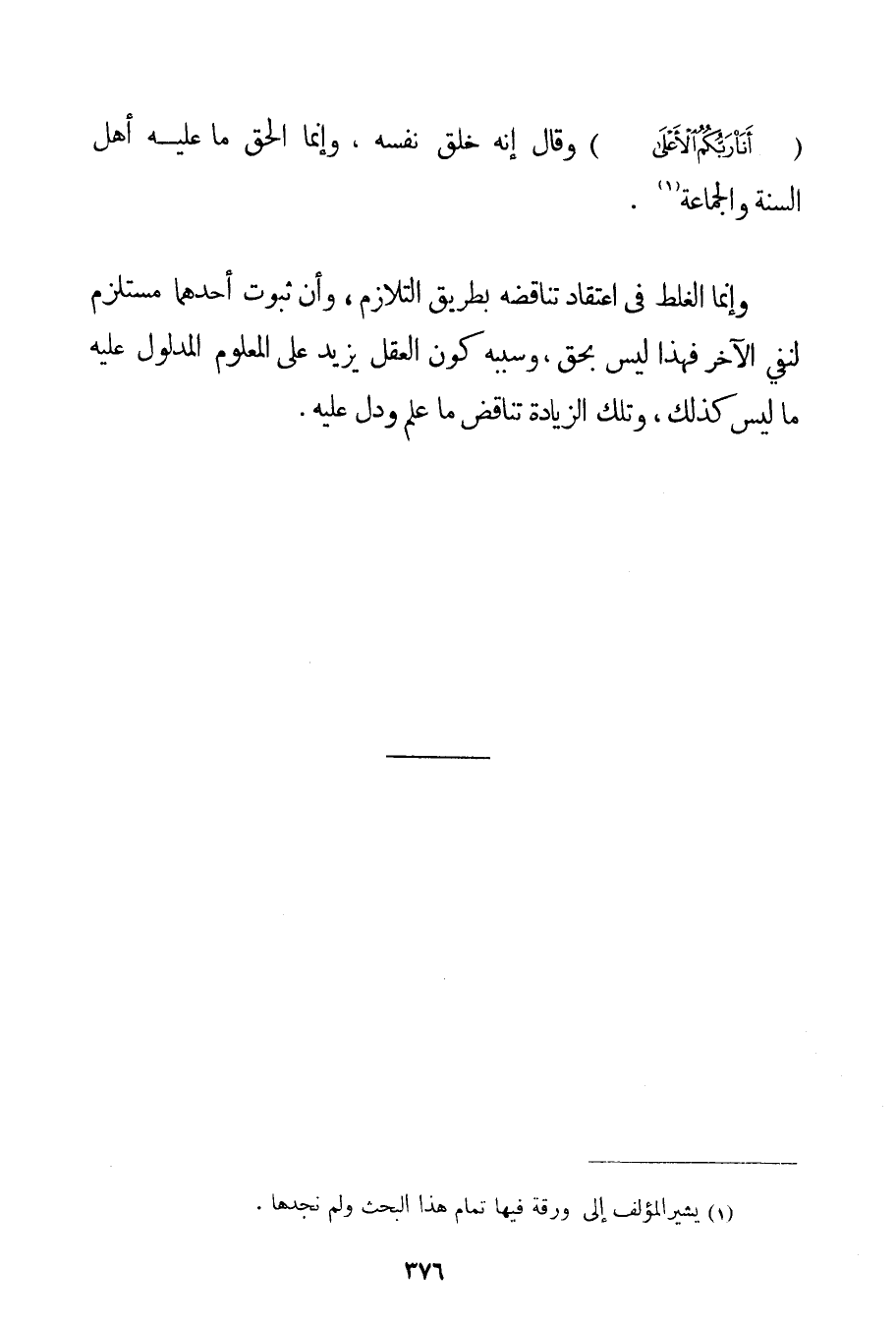 {أَنَا رَبُّكُمُ الْأَعْلَى} وَقَالَ إنَّهُ خَلَقَ نَفْسَهُ وَإِنَّمَا الْحَقُّ مَا عَلَيْهِ أَهْلُ السُّنَّةِ وَالْجَمَاعَةِ. وَإِنَّمَا الْغَلَطُ فِي اعْتِقَادِ تَنَاقُضِهِ بِطَرِيقِ التَّلَازُمِ وَأَنَّ ثُبُوتَ أَحَدِهِمَا مُسْتَلْزِمٌ لِنَفْيِ الْآخَرِ فَهَذَا لَيْسَ بِحَقِّ وَسَبَبُهُ كَوْنُ الْعَقْلِ يَزِيدُ عَلَى الْمَعْلُومِ الْمَدْلُولِ عَلَيْهِ مَا لَيْسَ كَذَلِكَ وَتِلْكَ الزِّيَادَةُ تُنَاقِضُ مَا عُلِمَ وَدَلَّ عَلَيْهِ.