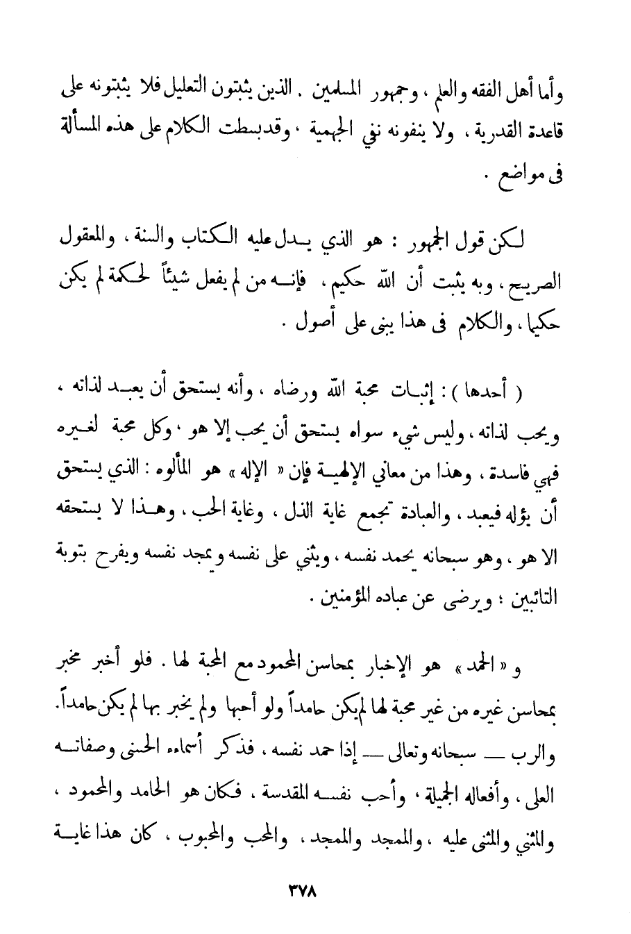 وَأَمَّا أَهْلُ الْفِقْهِ وَالْعِلْمِ وَجُمْهُورُ الْمُسْلِمِينَ الَّذِينَ يُثْبِتُونَ التَّعْلِيلَ فَلَا يُثْبِتُونَهُ عَلَى قَاعِدَةِ الْقَدَرِيَّةِ وَلَا يَنْفُونَهُ نَفْيَ الْجَهْمِيَّة وَقَدْ بَسَطْت الْكَلَامَ عَلَى هَذِهِ الْمَسْأَلَةِ فِي مَوَاضِعَ. لَكِنَّ قَوْلَ الْجُمْهُورِ: هُوَ الَّذِي يَدُلُّ عَلَيْهِ الْكِتَابُ وَالسُّنَّةُ وَالْمَعْقُولُ الصَّرِيحُ وَبِهِ يَثْبُتُ أَنَّ اللَّهَ حَكِيمٌ فَإِنَّهُ مَنْ لَمْ يَفْعَلْ شَيْئًا لِحِكْمَةِ لَمْ يَكُنْ حَكِيمًا وَالْكَلَامُ فِي هَذَا يُبْنَى عَلَى أُصُولٍ. (أَحَدُهَا) : إثْبَاتُ مَحَبَّةِ اللَّهِ وَرِضَاهُ وَأَنَّهُ يَسْتَحِقُّ أَنْ يُعْبَدَ لِذَاتِهِ وَيُحَبّ لِذَاتِهِ وَلَيْسَ شَيْءٌ سِوَاهُ يَسْتَحِقُّ أَنْ يُحَبَّ إلَّا هُوَ، وَكُلُّ مَحَبَّةٍ لِغَيْرِهِ فَهِيَ فَاسِدَةٌ وَهَذَا مِنْ مَعَانِي الْإِلَهِيَّةِ فَإِنَّ " الْإِلَهَ " هُوَ الْمَأْلُوهُ: الَّذِي يَسْتَحِقُّ أَنْ يُؤَلَّهَ فَيُعْبَدَ وَالْعِبَادَةُ تَجْمَعُ غَايَةَ الذُّلِّ وَغَايَةَ الْحُبِّ وَهَذَا لَا يَسْتَحِقُّهُ إلَّا هُوَ وَهُوَ سُبْحَانَهُ يَحْمَدُ نَفْسَهُ وَيُثْنِي عَلَى نَفْسِهِ وَيُمَجِّدُ نَفْسَهُ وَيَفْرَحُ بِتَوْبَةِ التَّائِبِينَ؛ وَيَرْضَى عَنْ عِبَادِهِ الْمُؤْمِنِينَ. وَ " الْحَمْدُ " هُوَ الْإِخْبَارُ بِمَحَاسِنِ الْمَحْمُودِ مَعَ الْمَحَبَّةِ لَهَا. فَلَوْ أَخْبَرَ مُخْبِرٌ بِمَحَاسِنِ غَيْرِهِ مِنْ غَيْرِ مَحَبَّةٍ لَهَا لَمْ يَكُنْ حَامِدًا وَلَوْ أَحَبَّهَا وَلَمْ يُخْبِرْ بِهَا لَمْ يَكُنْ حَامِدًا. وَالرَّبُّ - سُبْحَانَهُ وَتَعَالَى - إذَا حَمِدَ نَفْسَهُ فَذَكَرَ أَسْمَاءَهُ الْحُسْنَى وَصِفَاتِهِ الْعُلَى وَأَفْعَالَهُ الْجَمِيلَةَ وَأَحَبَّ نَفْسَهُ الْمُقَدَّسَةَ فَكَانَ هُوَ الْحَامِدَ وَالْمَحْمُودَ وَالْمُثْنِي وَالْمُثْنَى عَلَيْهِ وَالْمُمَجِّدَ وَالْمُمَجَّدَ وَالْمُحِبَّ وَالْمَحْبُوبَ كَانَ هَذَا غَايَةَ
