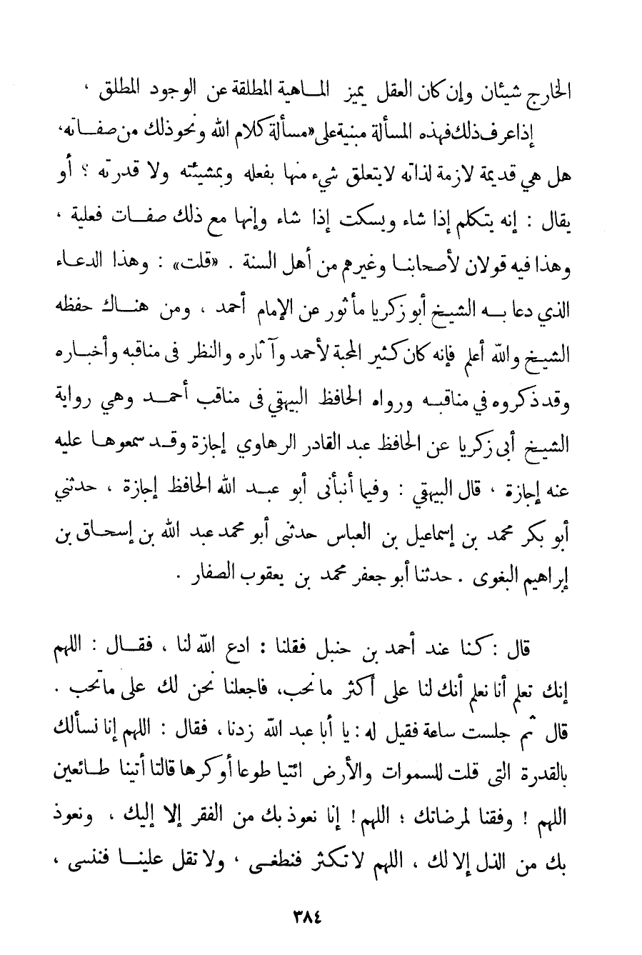إذَا عُرِفَ ذَلِكَ فَهَذِهِ الْمَسْأَلَةُ مَبْنِيَّةٌ عَلَى " مَسْأَلَةِ كَلَامِ اللَّهِ وَنَحْوِ ذَلِكَ مِنْ صِفَاتِهِ " هَلْ هِيَ قَدِيمَةٌ لَازِمَةٌ لِذَاتِهِ لَا يَتَعَلَّقُ شَيْءٌ مِنْهَا بِفِعْلِهِ وَبِمَشِيئَتِهِ وَلَا قُدْرَتِهِ؟ أَوْ يُقَالُ: إنَّهُ يَتَكَلَّمُ إذَا شَاءَ وَيَسْكُتُ إذَا شَاءَ وَأَنَّهَا مَعَ ذَلِكَ صِفَاتٌ فِعْلِيَّةٌ وَهَذَا فِيهِ قَوْلَانِ لِأَصْحَابِنَا وَغَيْرِهِمْ مِنْ أَهْلِ السُّنَّةِ. " قُلْت ": وَهَذَا الدُّعَاءُ الَّذِي دَعَا بِهِ الشَّيْخُ أَبُو زَكَرِيَّا مَأْثُورٌ عَنْ الْإِمَامِ أَحْمَد وَمِنْ هُنَاكَ حَفِظَهُ الشَّيْخُ وَاَللَّهُ أَعْلَمُ فَإِنَّهُ كَانَ كَثِيرَ الْمَحَبَّةِ لِأَحْمَدَ وَآثَارِهِ وَالنَّظَرِ فِي مَنَاقِبِهِ وَأَخْبَارِهِ وَقَدْ ذَكَرُوهُ فِي مَنَاقِبِهِ وَرَوَاهُ الْحَافِظُ البيهقي فِي مَنَاقِبِ أَحْمَد وَهِيَ رِوَايَةُ الشَّيْخِ أَبِي زَكَرِيَّا عَنْ الْحَافِظِ عَبْدِ الْقَادِرِ الرهاوي إجَازَةً وَقَدْ سَمِعُوهَا عَلَيْهِ عَنْهُ إجَازَةً قَالَ البيهقي: وَفِيمَا أَنْبَأَنِي أَبُو عَبْدِ اللَّهِ الْحَافِظُ إجَازَةً حَدَّثَنِي أَبُو بَكْرٍ مُحَمَّدُ بْنُ إسْمَاعِيلَ بْنِ الْعَبَّاسِ حَدَّثَنِي أَبُو مُحَمَّدٍ عَبْدُ اللَّهِ بْنِ إسْحَاقَ بْنِ إبْرَاهِيمَ البغوي. حَدَّثَنَا أَبُو جَعْفَرٍ مُحَمَّدُ بْنُ يَعْقُوبَ الصَّفَّارُ. قَالَ: كُنَّا عِنْدَ أَحْمَد بْنِ حَنْبَلٍ فَقُلْنَا: اُدْعُ اللَّهَ لَنَا فَقَالَ: " اللَّهُمَّ إنَّك تَعْلَمُ أَنَّا نَعْلَمُ أَنَّك لَنَا عَلَى أَكْثَرِ مَا نُحِبُّ فَاجْعَلْنَا نَحْنُ لَك عَلَى مَا تُحِبُّ ". قَالَ ثُمَّ جَلَسْت سَاعَةً فَقِيلَ لَهُ: يَا أَبَا عَبْدِ اللَّهِ زِدْنَا فَقَالَ: اللَّهُمَّ إنَّا نَسْأَلُك بِالْقُدْرَةِ الَّتِي قُلْت لِلسَّمَوَاتِ وَالْأَرْضِ ائْتِيَا طَوْعًا أَوْ كَرْهًا قَالَتَا أَتَيْنَا طَائِعِينَ، اللَّهُمَّ وَفِّقْنَا لِمَرْضَاتِك؛ اللَّهُمَّ إنَّا نَعُوذُ بِك مِنْ الْفَقْرِ إلَّا إلَيْك؛ وَنَعُوذُ بِك مِنْ الذُّلِّ إلَّا لَك اللَّهُمَّ لَا تُكْثِرْ فَنَطْغَى وَلَا تُقِلَّ عَلَيْنَا فَنَنْسَى