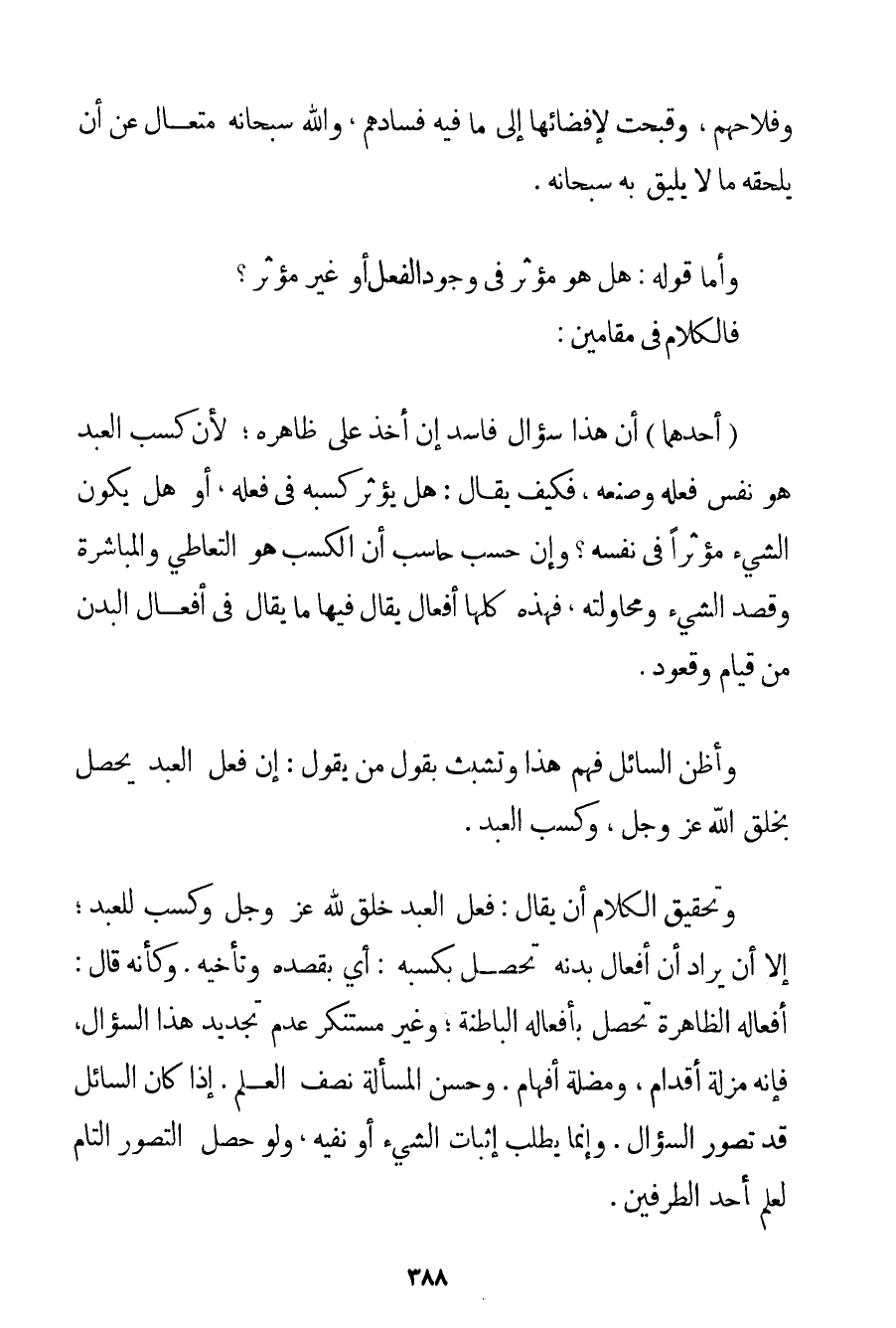 وَفَلَاحُهُمْ؛ وَقَبُحَتْ لِإِفْضَائِهَا إلَى مَا فِيهِ فَسَادُهُمْ وَاَللَّهُ سُبْحَانَهُ مُتَعَالٍ عَنْ أَنْ يَلْحَقَهُ مَا لَا يَلِيقُ بِهِ سُبْحَانَهُ. وَأَمَّا قَوْلُهُ: هَلْ هُوَ مُؤَثِّرٌ فِي وُجُودِ الْفِعْلِ أَوْ غَيْرُ مُؤَثِّرٍ؟ فَالْكَلَامُ فِي مَقَامَيْنِ: (أَحَدُهُمَا) أَنَّ هَذَا سُؤَالٌ فَاسِدٌ إنْ أُخِذَ عَلَى ظَاهِرِهِ؛ لِأَنَّ كَسْبَ الْعَبْدِ هُوَ نَفْسُ فِعْلِهِ وَصُنْعِهِ فَكَيْفَ يُقَالُ: هَلْ يُؤَثِّرُ كَسْبُهُ فِي فِعْلِهِ أَوْ هَلْ يَكُونُ الشَّيْءُ مُؤَثِّرًا فِي نَفْسِهِ؟ وَإِنْ حَسِبَ حَاسِبٌ أَنَّ الْكَسْبَ هُوَ التَّعَاطِي وَالْمُبَاشَرَةُ وَقَصْدُ الشَّيْءِ وَمُحَاوَلَتُهُ فَهَذِهِ كُلُّهَا أَفْعَالٌ يُقَالُ فِيهَا مَا يُقَالُ فِي أَفْعَالِ الْبَدَنِ مِنْ قِيَامٍ وَقُعُودٍ. وَأَظُنُّ السَّائِلَ فَهِمَ هَذَا وَتَشَبَّثَ بِقَوْلِ مَنْ يَقُولُ: إنَّ فِعْلَ الْعَبْدِ يَحْصُلُ بِخَلْقِ اللَّهِ عَزَّ وَجَلَّ وَكَسْبِ الْعَبْدِ. وَتَحْقِيقُ الْكَلَامِ أَنْ يُقَالَ: فِعْلُ الْعَبْدِ خُلِقَ لِلَّهِ - عَزَّ وَجَلَّ - وَكَسْبٌ لِلْعَبْدِ؛ إلَّا أَنْ يُرَادَ أَنَّ أَفْعَالَ بَدَنِهِ تَحْصُلُ بِكَسْبِهِ: أَيْ بِقَصْدِهِ وَتَأَخِّيهِ. وَكَأَنَّهُ قَالَ: أَفْعَالُهُ الظَّاهِرَةُ تَحْصُلُ بِأَفْعَالِهِ الْبَاطِنَةِ؛ وَغَيْرُ مُسْتَنْكَرٍ عَدَمُ تَجْدِيدِ هَذَا السُّؤَالِ فَإِنَّهُ مَزَلَّةُ أَقْدَامٍ وَمَضَلَّةُ أَفْهَامٍ. وَحُسْنُ الْمَسْأَلَةِ نِصْفُ الْعِلْمِ. إذَا كَانَ السَّائِلُ قَدْ تَصَوَّرَ السُّؤَالَ. وَإِنَّمَا يُطْلَبُ إثْبَاتُ الشَّيْءِ أَوْ نَفْيُهُ وَلَوْ حَصَلَ التَّصَوُّرُ التَّامُّ لِعِلْمِ أَحَدِ الطَّرَفَيْنِ.