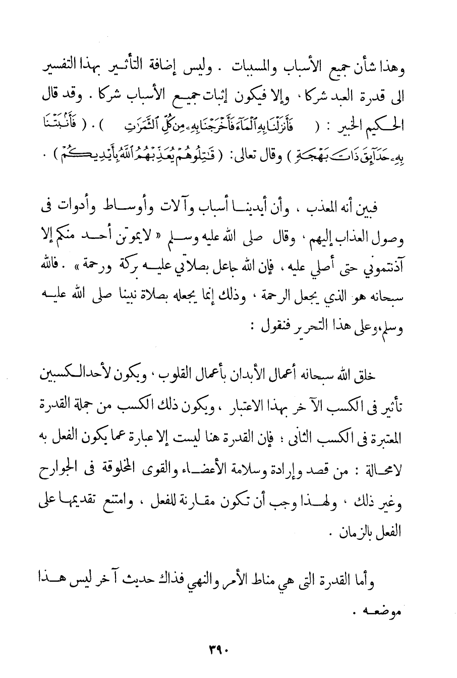 وَهَذَا شَأْنُ جَمِيعِ الْأَسْبَابِ وَالْمُسَبَّبَاتِ. وَلَيْسَ إضَافَةُ التَّأْثِيرِ بِهَذَا التَّفْسِيرِ إلَى قُدْرَةِ الْعَبْدِ شِرْكًا وَإِلَّا فَيَكُونُ إثْبَاتُ جَمِيعِ الْأَسْبَابِ شِرْكًا. وَقَدْ قَالَ الْحَكِيمُ الْخَبِيرُ: {فَأَنْزَلْنَا بِهِ الْمَاءَ فَأَخْرَجْنَا بِهِ مِنْ كُلِّ الثَّمَرَاتِ} . {فَأَنْبَتْنَا بِهِ حَدَائِقَ ذَاتَ بَهْجَةٍ} وَقَالَ تَعَالَى: {قَاتِلُوهُمْ يُعَذِّبْهُمُ اللَّهُ بِأَيْدِيكُمْ} . فَبَيَّنَ أَنَّهُ الْمُعَذِّبُ، وَأَنَّ أَيْدِيَنَا أَسْبَابٌ وَآلَاتٌ وَأَوْسَاطٌ وَأَدَوَاتٌ فِي وُصُولِ الْعَذَابِ إلَيْهِمْ وَقَالَ صَلَّى اللَّهُ عَلَيْهِ وَسَلَّمَ {لَا يَمُوتَنَّ أَحَدٌ مِنْكُمْ إلَّا آذَنْتُمُونِي حَتَّى أُصَلِّيَ عَلَيْهِ فَإِنَّ اللَّهَ جَاعِلٌ بِصَلَاتِي عَلَيْهِ بَرَكَةً وَرَحْمَةً} . فَاَللَّهُ سُبْحَانَهُ هُوَ الَّذِي يَجْعَلُ الرَّحْمَةَ وَذَلِكَ إنَّمَا يَجْعَلُهُ بِصَلَاةِ نَبِيِّنَا صَلَّى اللَّهُ عَلَيْهِ وَسَلَّمَ وَعَلَى هَذَا التَّحْرِيرِ فَنَقُولُ: خَلَقَ اللَّهُ سُبْحَانَهُ أَعْمَالَ الْأَبْدَانِ بِأَعْمَالِ الْقُلُوبِ وَيَكُونُ لِأَحَدِ الْكَسْبَيْنِ تَأْثِيرٌ فِي الْكَسْبِ الْآخَرِ بِهَذَا الِاعْتِبَارِ وَيَكُونُ ذَلِكَ الْكَسْبُ مِنْ جُمْلَةِ الْقُدْرَةِ الْمُعْتَبَرَةِ فِي الْكَسْبِ الثَّانِي؛ فَإِنَّ الْقُدْرَةَ هُنَا لَيْسَتْ إلَّا عِبَارَةً عَمَّا يَكُونُ الْفِعْلُ بِهِ لَا مَحَالَةَ: مِنْ قَصْدٍ وَإِرَادَةٍ وَسَلَامَةِ الْأَعْضَاءِ وَالْقُوَى الْمَخْلُوقَةِ فِي الْجَوَارِحِ وَغَيْرِ ذَلِكَ وَلِهَذَا وَجَبَ أَنْ تَكُونَ مُقَارِنَةً لِلْفِعْلِ وَامْتَنَعَ تَقْدِيمُهَا عَلَى الْفِعْلِ بِالزَّمَانِ. وَأَمَّا الْقُدْرَةُ الَّتِي هِيَ مَنَاطُ الْأَمْرِ وَالنَّهْيِ فَذَاكَ حَدِيثٌ آخَرُ لَيْسَ هَذَا مَوْضِعَهُ.