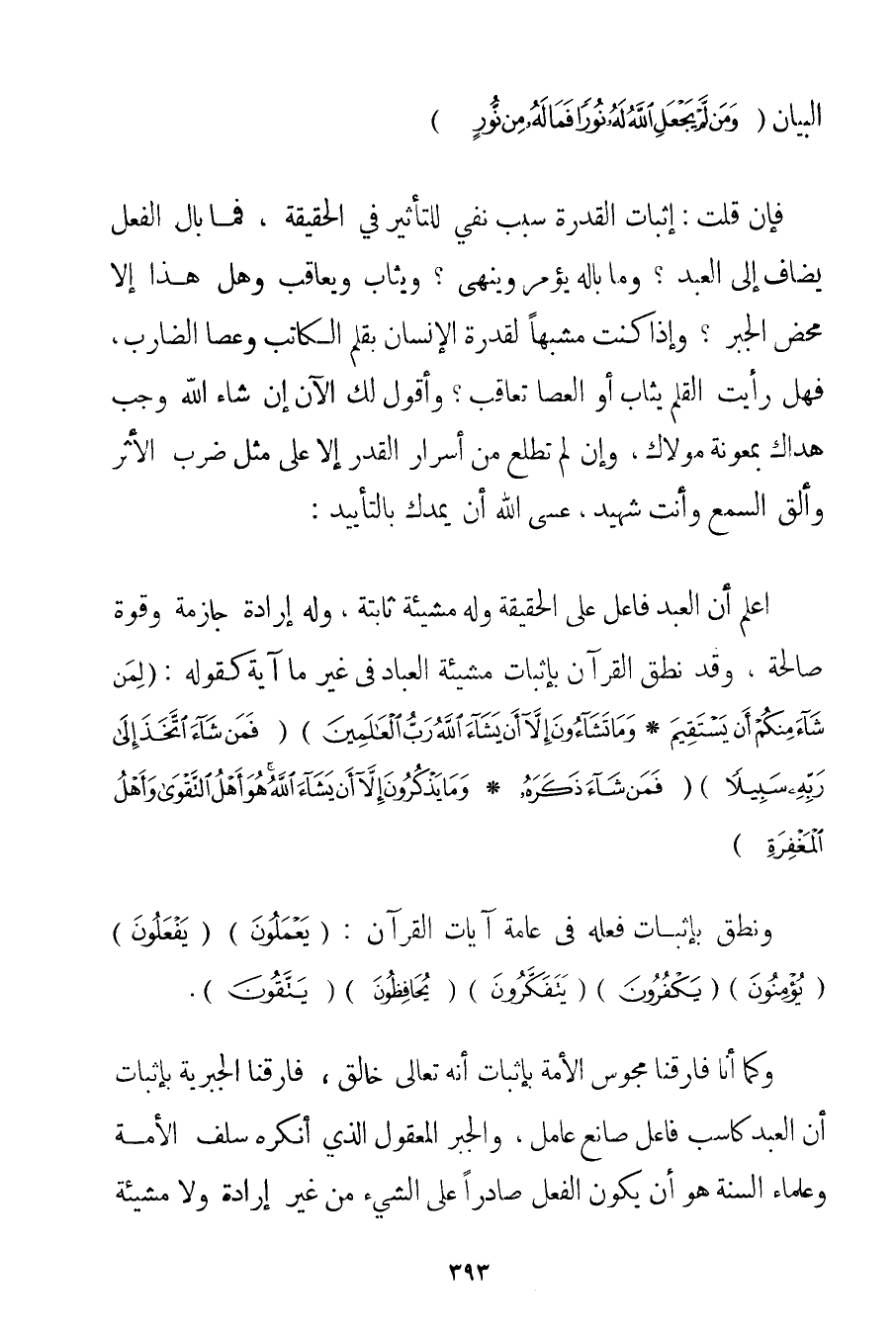 الْبَيَانَ {وَمَنْ لَمْ يَجْعَلِ اللَّهُ لَهُ نُورًا فَمَا لَهُ مِنْ نُورٍ} فَإِنْ قُلْت: إثْبَاتُ الْقُدْرَةِ سَبَبُ نَفْيٍ لِلتَّأْثِيرِ فِي الْحَقِيقَةِ فَمَا بَالُ الْفِعْلِ يُضَافُ إلَى الْعَبْدِ؟ وَمَا بَالُهُ يُؤْمَرُ وَيُنْهَى؟ وَيُثَابُ وَيُعَاقَبُ وَهَلْ هَذَا إلَّا مَحْضُ الْجَبْرِ؟ وَإِذَا كُنْت مُشَبِّهًا لِقُدْرَةِ الْإِنْسَانِ بِقَلَمِ الْكَاتِبِ وَعَصَا الضَّارِبِ فَهَلْ رَأَيْت الْقَلَمَ يُثَابُ أَوْ الْعَصَا تُعَاقَبُ؟ وَأَقُولُ لَك الْآنَ إنْ شَاءَ اللَّهُ وَجَبَ هُدَاك بِمَعُونَةِ مَوْلَاك وَإِنْ لَمْ تَطَّلِعْ مِنْ أَسْرَارِ الْقَدَرِ إلَّا عَلَى مِثْلِ ضَرْبِ الْأَثَرِ وَأَلْقِ السَّمْعَ وَأَنْتَ شَهِيدٌ عَسَى اللَّهُ أَنْ يُمِدَّك بِالتَّأْيِيدِ.
