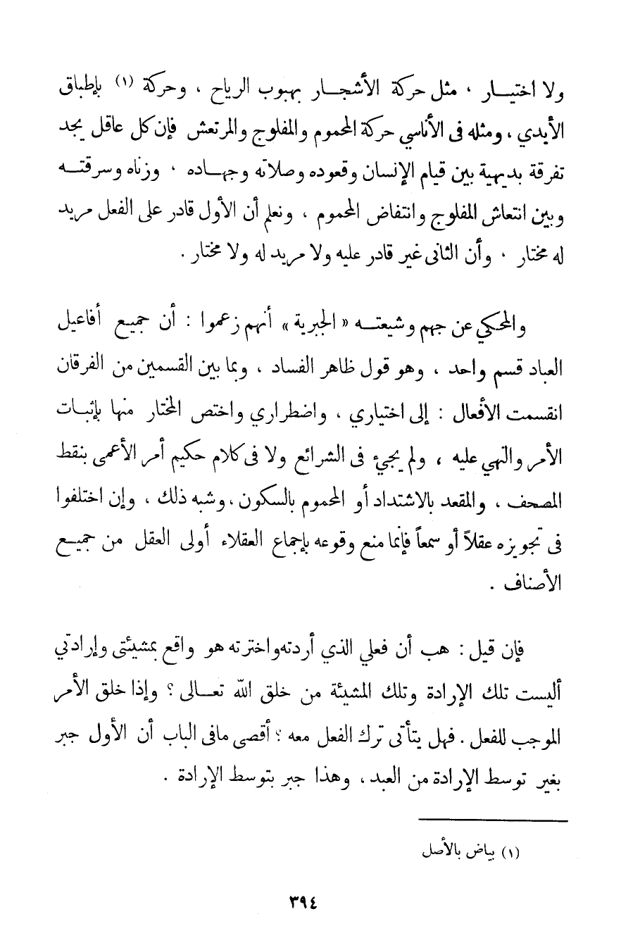 وَلَا اخْتِيَارٍ مِثْلَ حَرَكَةِ الْأَشْجَارِ بِهُبُوبِ الرِّيَاحِ وَحَرَكَةٍ. . . (1) بِإِطْبَاقِ الْأَيْدِي وَمِثْلُهُ فِي الْأَنَاسِيِّ حَرَكَةُ الْمَحْمُومِ وَالْمَفْلُوجِ وَالْمُرْتَعِشِ فَإِنَّ كُلَّ عَاقِلٍ يَجِدُ تَفْرِقَةً بَدِيهِيَّةً بَيْنَ قِيَامِ الْإِنْسَانِ وَقُعُودِهِ وَصَلَاتِهِ وَجِهَادِهِ وَزِنَاهُ وَسَرِقَتِهِ وَبَيْنَ ارْتِعَاشِ الْمَفْلُوجِ وَانْتِفَاضِ الْمَحْمُومِ وَنَعْلَمُ أَنَّ الْأَوَّلَ قَادِرٌ عَلَى الْفِعْلِ مُرِيدٌ لَهُ مُخْتَارٌ وَأَنَّ الثَّانِيَ غَيْرُ قَادِرٍ عَلَيْهِ وَلَا مُرِيدٍ لَهُ وَلَا مُخْتَارٍ. وَالْمَحْكِيُّ عَنْ جَهْمٍ وَشِيعَتِهِ " الْجَبْرِيَّةُ " أَنَّهُمْ زَعَمُوا: أَنَّ جَمِيعَ أَفَاعِيلِ الْعِبَادِ قِسْمٌ وَاحِدٌ وَهُوَ قَوْلٌ ظَاهِرُ الْفَسَادِ وَبِمَا بَيْنَ الْقِسْمَيْنِ مِنْ الْفُرْقَانِ انْقَسَمَتْ الْأَفْعَالُ: إلَى اخْتِيَارِيٍّ وَاضْطِرَارِيٍّ وَاخْتَصَّ الْمُخْتَارُ مِنْهَا بِإِثْبَاتِ الْأَمْرِ وَالنَّهْيِ عَلَيْهِ وَلَمْ يَجِئْ فِي الشَّرَائِعِ وَلَا فِي كَلَامِ حَكِيمٍ أَمْرُ الْأَعْمَى بِنَقْطِ الْمُصْحَفِ وَالْمُقْعَدِ بِالِاشْتِدَادِ أَوْ الْمَحْمُومِ بِالسُّكُونِ وَشِبْهِ ذَلِكَ وَإِنْ اخْتَلَفُوا فِي تَجْوِيزِهِ عَقْلًا أَوْ سَمْعًا فَإِنَّمَا مَنْعُ وُقُوعِهِ بِإِجْمَاعِ الْعُقَلَاءِ أَوْلَى الْعَقْلِ مِنْ جَمِيعِ الْأَصْنَافِ. فَإِنْ قِيلَ: هَبْ أَنَّ فِعْلِي الَّذِي أَرَدْته وَاخْتَرْته هُوَ وَاقِعٌ بِمَشِيئَتِي وَإِرَادَتِي أَلَيْسَتْ تِلْكَ الْإِرَادَةُ وَتِلْكَ الْمَشِيئَةُ مِنْ خَلْقِ اللَّهِ تَعَالَى؟ وَإِذَا خَلَقَ الْأَمْرَ الْمُوجِبَ لِلْفِعْلِ. فَهَلْ يَتَأَتَّى تَرْكُ الْفِعْلِ مَعَهُ؟ أَقْصَى مَا فِي الْبَابِ أَنَّ الْأَوَّلَ جَبْرٌ بِغَيْرِ تَوَسُّطِ الْإِرَادَةِ مِنْ الْعَبْدِ وَهَذَا جَبْرٌ بِتَوَسُّطِ الْإِرَادَةِ.
