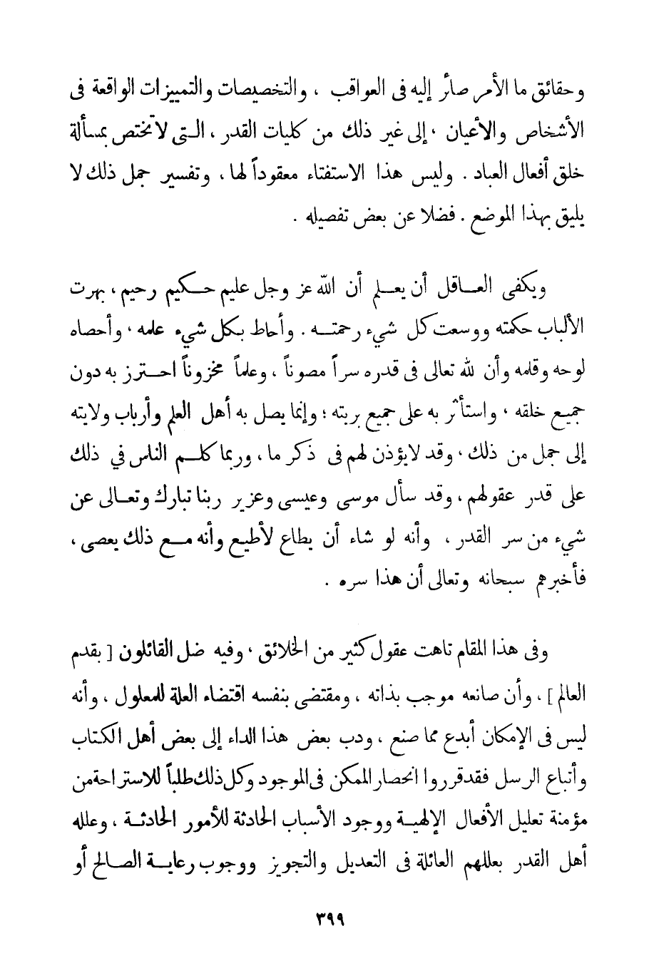 وَحَقَائِقِ مَا الْأَمْرُ صَائِرٌ إلَيْهِ فِي الْعَوَاقِبِ وَالتَّخْصِيصَاتُ وَالتَّمْيِيزَاتُ الْوَاقِعَةُ فِي الْأَشْخَاصِ وَالْأَعْيَانِ إلَى غَيْرِ ذَلِكَ مِنْ كُلِّيَّاتِ الْقَدَرِ الَّتِي لَا تَخْتَصُّ بِمَسْأَلَةِ خَلْقِ أَفْعَالِ الْعِبَادِ. وَلَيْسَ هَذَا الِاسْتِفْتَاءُ مَعْقُودًا لَهَا وَتَفْسِيرُ جُمَلِ ذَلِكَ لَا يَلِيقُ بِهَذَا الْمَوْضِعِ. فَضْلًا عَنْ بَعْضِ تَفْصِيلِهِ. وَيَكْفِي الْعَاقِلُ أَنْ يَعْلَمَ أَنَّ اللَّهَ عَزَّ وَجَلَّ عَلِيمٌ حَكِيمٌ رَحِيمٌ بَهَرَتْ الْأَلْبَابَ حِكْمَتُهُ وَوَسِعَتْ كُلَّ شَيْءٍ رَحْمَتُهُ. وَأَحَاطَ بِكُلِّ شَيْءٍ عِلْمُهُ وَأَحْصَاهُ لَوْحُهُ وَقَلَمُهُ وَأَنَّ لِلَّهِ تَعَالَى فِي قَدَرِهِ سِرًّا مَصُونًا وَعِلْمًا مَخْزُونًا احْتَرَزَ بِهِ دُونَ جَمِيعِ خَلْقِهِ وَاسْتَأْثَرَ بِهِ عَلَى جَمِيعِ بَرِيَّتِهِ؛ وَإِنَّمَا يَصِلُ بِهِ أَهْلُ الْعِلْمِ وَأَرْبَابُ وِلَايَتِهِ إلَى جُمَلٍ مِنْ ذَلِكَ وَقَدْ لَا يُؤْذَنُ لَهُمْ فِي ذِكْرٍ مَا وَرُبَّمَا كَلَّمَ النَّاسَ فِي ذَلِكَ عَلَى قَدْرِ عُقُولِهِمْ وَقَدْ سَأَلَ مُوسَى وَعِيسَى وَعُزَيْرٌ رَبَّنَا - تَبَارَكَ وَتَعَالَى - عَنْ شَيْءٍ مِنْ سِرِّ الْقَدَرِ وَأَنَّهُ لَوْ شَاءَ أَنْ يُطَاعَ لَأُطِيعَ وَأَنَّهُ مَعَ ذَلِكَ يُعْصَى فَأَخْبَرَهُمْ - سُبْحَانَهُ وَتَعَالَى - أَنَّ هَذَا سِرُّهُ. وَفِي هَذَا الْمَقَامِ تَاهَتْ عُقُولُ كَثِيرٍ مِنْ الْخَلَائِقِ وَفِيهِ ضَلَّ الْقَائِلُونَ بِقِدَمِ الْعَالَمِ، وَأَنَّ صَانِعَهُ مُوجِبٌ بِذَاتِهِ وَمُقْتَضِي بِنَفْسِهِ اقْتِضَاءَ الْعِلَّةِ لِلْمَعْلُولِ وَأَنَّهُ لَيْسَ فِي الْإِمْكَانِ أَبْدَعُ مِمَّا صَنَعَ وَدَبَّ بَعْضُ هَذَا الدَّاءِ إلَى بَعْضِ أَهْلِ الْكِتَابِ وَأَتْبَاعِ الرُّسُلِ فَقَدْ قَرَّرُوا انْحِصَارَ الْمُمْكِنِ فِي الْمَوْجُودِ وَكُلُّ ذَلِكَ طَلَبًا لِلِاسْتِرَاحَةِ مِنْ مُؤْمِنَةٍ تَعْلِيلِ الْأَفْعَالِ الْإِلَهِيَّةِ وَوُجُودِ الْأَسْبَابِ الْحَادِثَةِ لِلْأُمُورِ الْحَادِثَةِ وَعَلَّلَهُ أَهْلُ الْقَدَرِ بِعِلَلِهِمْ الْعَائِلَةِ فِي التَّعْدِيلِ وَالتَّجْوِيزِ وَوُجُوبِ رِعَايَةِ الصَّالِحِ