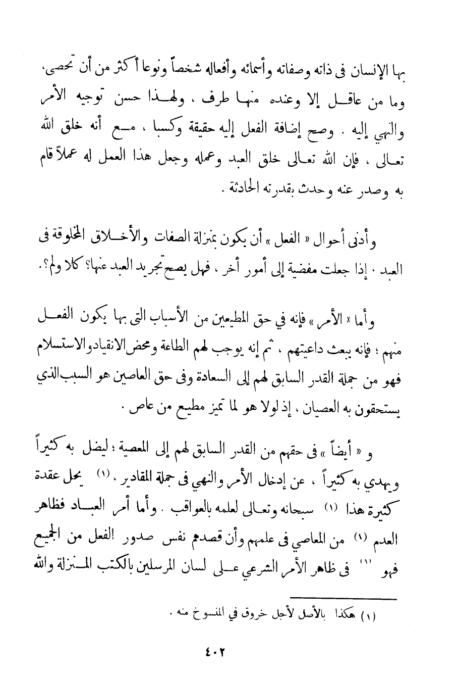 بِهَا الْإِنْسَانَ فِي ذَاتِهِ وَصِفَاتِهِ وَأَسْمَائِهِ وَأَفْعَالِهِ شَخْصًا وَنَوْعًا أَكْثَرَ مِنْ أَنْ تُحْصَى وَمَا مِنْ عَاقِلٍ إلَّا وَعِنْدَهُ مِنْهَا طَرَفٌ وَلِهَذَا حَسُنَ تَوْجِيهُ الْأَمْرِ وَالنَّهْيِ إلَيْهِ. وَصَحَّ إضَافَةُ الْفِعْلِ إلَيْهِ حَقِيقَةً وَكَسْبًا مَعَ أَنَّهُ خَلْقُ اللَّهِ تَعَالَى فَإِنَّ اللَّهَ تَعَالَى خَلَقَ الْعَبْدَ وَعَمَلَهُ وَجَعَلَ هَذَا الْعَمَلَ لَهُ عَمَلًا قَامَ بِهِ وَصَدَرَ عَنْهُ وَحَدَثَ بِقُدْرَتِهِ الْحَادِثَةِ. وَأَدْنَى أَحْوَالِ " الْفِعْلِ " أَنْ يَكُونَ بِمَنْزِلَةِ الصِّفَاتِ وَالْأَخْلَاقِ الْمَخْلُوقَةِ فِي الْعَبْدِ إذَا جُعِلَتْ مُفْضِيَةً إلَى أُمُورٍ أُخَرَ فَهَلْ يَصِحُّ تَجْرِيدُ الْعَبْدِ عَنْهَا؟ كَلَّا وَلَمْ؟ . وَأَمَّا " الْأَمْرُ " فَإِنَّهُ فِي حَقِّ الْمُطِيعِينَ مِنْ الْأَسْبَابِ الَّتِي بِهَا يَكُونُ الْفِعْلُ مِنْهُمْ؛ فَإِنَّهُ يَبْعَثُ دَاعِيَتَهُمْ ثُمَّ إنَّهُ يُوجِبُ لَهُمْ الطَّاعَةَ وَمَحْضَ الِانْقِيَادِ وَالِاسْتِسْلَامِ فَهُوَ مِنْ جُمْلَةِ الْقَدَرِ السَّابِقِ لَهُمْ إلَى السَّعَادَةِ وَفِي حَقِّ الْعَاصِينَ هُوَ السَّبَبُ الَّذِي يَسْتَحِقُّونَ بِهِ الْعِصْيَانَ إذْ لَوْلَا هُوَ لَمَا تَمَيَّزَ مُطِيعٌ مِنْ عَاصٍ. وَ " أَيْضًا " فِي حَقِّهِمْ مِنْ الْقَدَرِ السَّابِقِ لَهُمْ إلَى الْمَعْصِيَةِ؛ لِيَضِلَّ بِهِ كَثِيرًا وَيَهْدِيَ بِهِ كَثِيرًا عَنْ إدْخَالِ الْأَمْرِ وَالنَّهْيِ فِي جُمْلَةِ الْمَقَادِيرِ. . . (1) يَحِلُّ عُقْدَةً كَثِيرَةً هَذَا. . . (2) سُبْحَانَهُ وَتَعَالَى لِعِلْمِهِ بِالْعَوَاقِبِ. وَأَمَّا أَمْرُ الْعِبَادِ فَظَاهِرُ الْعَدَمِ. . . (3) مِنْ الْمَعَاصِي فِي عِلْمِهِمْ وَأَنَّ قَصْدَهُمْ نَفْسُ صُدُورِ الْفِعْلِ مِنْ الْجَمِيعِ فَهُوَ. . . (4) فِي ظَاهِرِ الْأَمْرِ الشَّرْعِيِّ عَلَى لِسَانِ الْمُرْسَلِينَ بِالْكُتُبِ الْمُنَزَّلَةِ وَاَللَّهُ