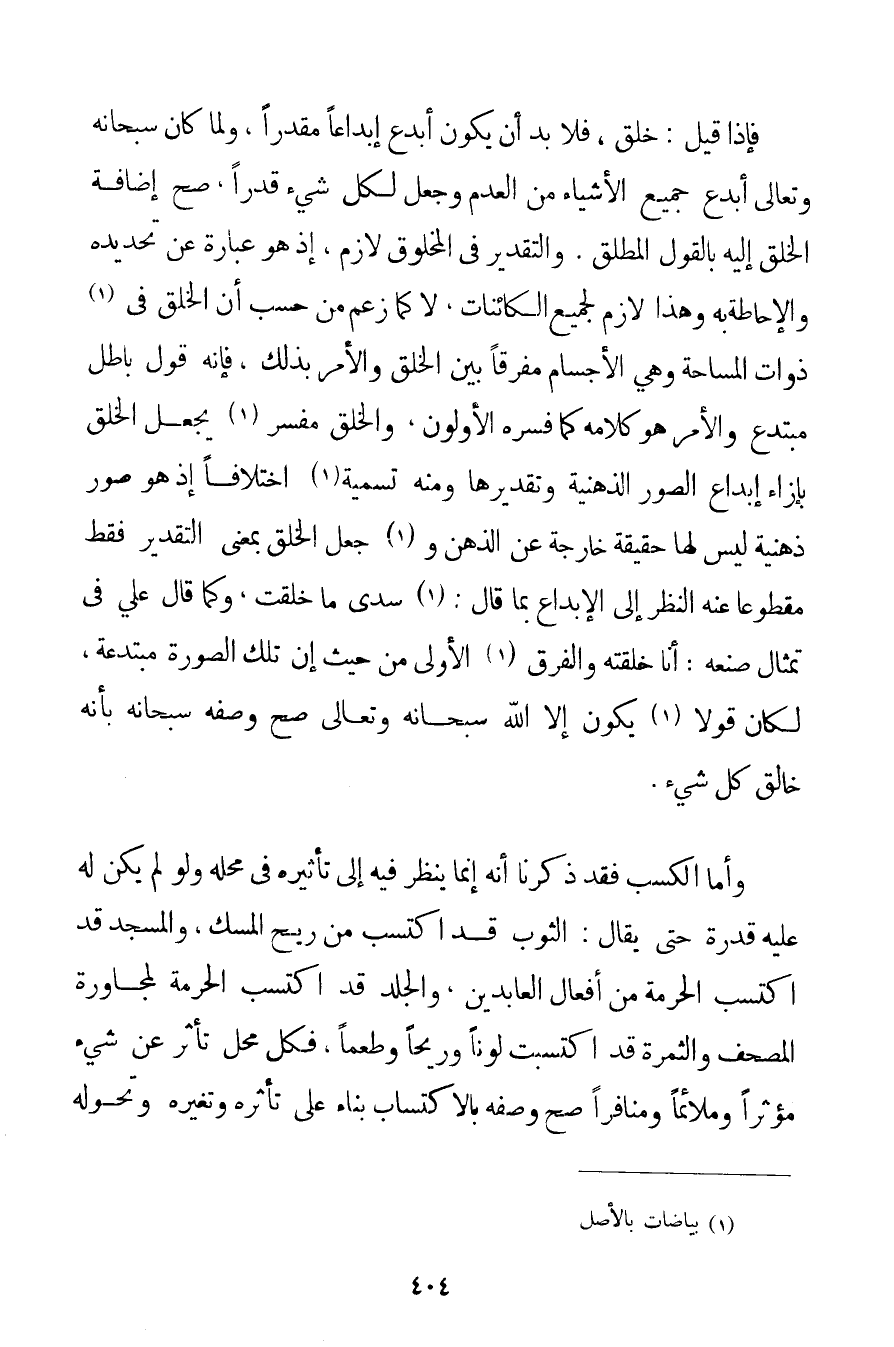 فَإِذَا قِيلَ: خَلَقَ فَلَا بُدَّ أَنْ يَكُونَ أَبْدَعَ إبْدَاعًا مُقَدَّرًا وَلَمَّا كَانَ - سُبْحَانَهُ وَتَعَالَى - أَبْدَعَ جَمِيعَ الْأَشْيَاءِ مِنْ الْعَدَمِ وَجَعَلَ لِكُلِّ شَيْءٍ قَدَرًا صَحَّ إضَافَةُ الْخَلْقِ إلَيْهِ بِالْقَوْلِ الْمُطْلَقِ. وَالتَّقْدِيرُ فِي الْمَخْلُوقِ لَازِمٌ إذْ هُوَ عِبَارَةٌ عَنْ تَحْدِيدِهِ وَالْإِحَاطَةِ بِهِ وَهَذَا لَازِمٌ لِجَمِيعِ الْكَائِنَاتِ لَا كَمَا زَعَمَ مَنْ حَسِبَ أَنَّ الْخَلْقَ فِي. . . (1) ذَوَاتِ الْمِسَاحَةِ وَهِيَ الْأَجْسَامُ مُفَرِّقًا بَيْنَ الْخَلْقِ وَالْأَمْرِ بِذَلِكَ فَإِنَّهُ قَوْلٌ بَاطِلٌ مُبْتَدَعٌ وَالْأَمْرُ هُوَ كَلَامُهُ كَمَا فَسَّرَهُ الْأَوَّلُونَ وَالْخَلْقُ مُفَسَّرٌ. . . (2) يَجْعَلُ الْخَلْقَ بِإِزَاءِ إبْدَاعِ الصُّوَرِ الذِّهْنِيَّةِ وَتَقْدِيرِهَا وَمِنْهُ تَسْمِيَةُ. . . (3) اخْتِلَافًا إذْ هُوَ صُوَرٌ ذِهْنِيَّةٌ لَيْسَ لَهَا حَقِيقَةٌ خَارِجَةٌ عَنْ الذِّهْنِ وَ. . . (4) جَعْلُ الْخَلْقِ بِمَعْنَى التَّقْدِيرِ فَقَطْ مَقْطُوعًا عَنْهُ النَّظَرُ إلَى الْإِبْدَاعِ بِمَا قَالَ. . . (5) سُدًى مَا خَلَقْت وَكَمَا قَالَ عَلِيٌّ فِي تِمْثَالٍ صَنَعَهُ: أَنَا خَلَقْته وَالْفَرْقُ. . . (6) الْأُولَى مِنْ حَيْثُ إنَّ تِلْكَ الصُّورَةَ مُبْتَدَعَةٌ لَكَانَ قَوْلًا. . . (7) يَكُونُ إلَّا اللَّهُ سُبْحَانَهُ وَتَعَالَى صَحَّ وَصْفُهُ سُبْحَانَهُ بِأَنَّهُ خَالِقُ كُلِّ شَيْءٍ. وَأَمَّا الْكَسْبُ فَقَدْ ذَكَرْنَا أَنَّهُ إنَّمَا يُنْظَرُ فِيهِ إلَى تَأْثِيرِهِ فِي مَحَلِّهِ وَلَوْ لَمْ يَكُنْ لَهُ عَلَيْهِ قُدْرَةٌ حَتَّى يُقَالَ: الثَّوْبُ قَدْ اُكْتُسِبَ مِنْ رِيحِ الْمِسْكِ، وَالْمَسْجِدُ قَدْ اكْتَسَبَ الْحُرْمَةَ مِنْ أَفْعَالِ الْعَابِدِينَ وَالْجِلْد قَدْ اكْتَسَبَ الْحُرْمَةَ لِمُجَاوَرَةِ الْمُصْحَفِ وَالثَّمَرَةُ قَدْ اكْتَسَبَتْ لَوْنًا وَرِيحًا وَطَعْمًا فَكُلُّ مَحَلٍّ تَأَثَّرَ عَنْ شَيْءٍ مُؤَثِّرًا وَمُلَائِمًا وَمُنَافِرًا صَحَّ وَصْفُهُ بِالِاكْتِسَابِ بِنَاءً عَلَى تَأَثُّرِهِ وَتَغَيُّرِهِ وَتَحَوُّلِهِ