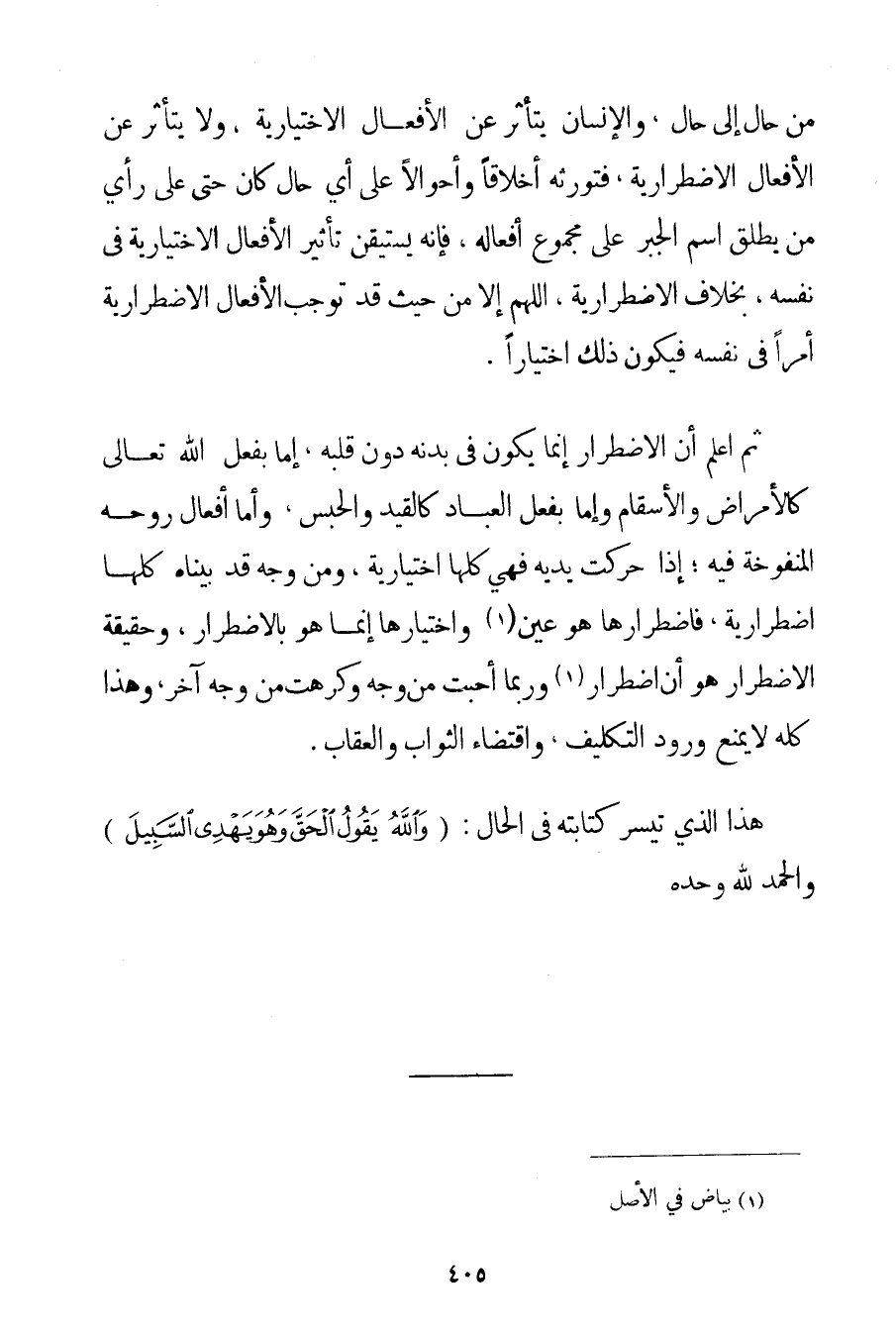 مِنْ حَالٍ إلَى حَالٍ وَالْإِنْسَانُ يَتَأَثَّرُ عَنْ الْأَفْعَالِ الِاخْتِيَارِيَّةِ وَلَا يَتَأَثَّرُ عَنْ الْأَفْعَالِ الِاضْطِرَارِيَّةِ فَتُورِثُهُ أَخْلَاقًا وَأَحْوَالًا عَلَى أَيِّ حَالٍ كَانَ حَتَّى عَلَى رَأْيِ مَنْ يُطْلِقُ اسْمَ الْجَبْرِ عَلَى مَجْمُوعِ أَفْعَالِهِ فَإِنَّهُ يَسْتَيْقِنُ تَأْثِيرَ الْأَفْعَالِ الِاخْتِيَارِيَّةِ فِي نَفْسِهِ بِخِلَافِ الِاضْطِرَارِيَّةِ اللَّهُمَّ إلَّا مِنْ حَيْثُ قَدْ تُوجِبُ الْأَفْعَالُ الِاضْطِرَارِيَّةُ أَمْرًا فِي نَفْسِهِ فَيَكُونُ ذَلِكَ اخْتِيَارًا. ثُمَّ اعْلَمْ أَنَّ الِاضْطِرَارَ إنَّمَا يَكُونُ فِي بَدَنِهِ دُونَ قَلْبِهِ إمَّا بِفِعْلِ اللَّهِ تَعَالَى كَالْأَمْرَاضِ وَالْأَسْقَامِ وَإِمَّا بِفِعْلِ الْعِبَادِ كَالْقَيْدِ وَالْحَبْسِ وَأَمَّا أَفْعَالُ رُوحِهِ الْمَنْفُوخَةِ فِيهِ؛ إذَا حَرَّكَتْ يَدَيْهِ فَهِيَ كُلُّهَا اخْتِيَارِيَّةٌ وَمِنْ وَجْهٍ قَدْ بَيَّنَّاهُ كُلَّهَا اضْطِرَارِيَّةً فَاضْطِرَارُهَا هُوَ عَيْنُ. . . (1) وَاخْتِيَارُهَا إنَّمَا هُوَ بِالِاضْطِرَارِ وَحَقِيقَةُ الِاضْطِرَارِ هُوَ أَنَّ اضْطِرَارَ. . . (2) وَرُبَّمَا أَحَبَّتْ مِنْ وَجْهٍ وَكَرِهَتْ مِنْ وَجْهٍ آخَرَ وَهَذَا كُلُّهُ لَا يَمْنَعُ وُرُودَ التَّكْلِيفِ وَاقْتِضَاءَ الثَّوَابِ وَالْعِقَابِ. هَذَا الَّذِي تَيَسَّرَ كِتَابَتُهُ فِي الْحَالِ: {وَاللَّهُ يَقُولُ الْحَقَّ وَهُوَ يَهْدِي السَّبِيلَ} وَالْحَمْدُ لِلَّهِ وَحْدَهُ.