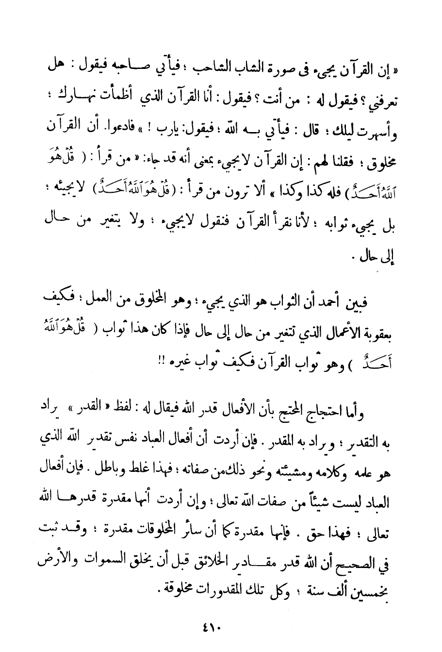 {إنَّ الْقُرْآنَ يَجِيءُ فِي صُورَةِ الشَّابِّ الشَّاحِبِ؛ فَيَأْتِي صَاحِبُهُ فَيَقُولُ: هَلْ تَعْرِفُنِي؟ فَيَقُولُ لَهُ: مَنْ أَنْتَ؟ فَيَقُولُ: أَنَا الْقُرْآنُ الَّذِي أَظْمَأْتُ نَهَارَكَ؛ وَأَسْهَرْتُ لَيْلَكَ؛ قَالَ: فَيَأْتِي بِهِ اللَّهُ؛ فَيَقُولُ: يَا رَبِّ} فَادَّعَوْا. أَنَّ الْقُرْآنَ مَخْلُوقٌ؛ فَقُلْنَا لَهُمْ: إنَّ الْقُرْآنَ لَا يَجِيءُ بِمَعْنَى أَنَّهُ قَدْ جَاءَ: {مَنْ قَرَأَ: {قُلْ هُوَ اللَّهُ أَحَدٌ} فَلَهُ كَذَا وَكَذَا} أَلَا تَرَوْنَ مَنْ قَرَأَ: {قُلْ هُوَ اللَّهُ أَحَدٌ} لَا يَجِيئُهُ؛ بَلْ يَجِيءُ ثَوَابُهُ؛ لِأَنَّا نَقْرَأُ الْقُرْآنَ فَنَقُولُ لَا يَجِيءُ؛ وَلَا يَتَغَيَّرُ مِنْ حَالٍ إلَى حَالٍ. فَبَيَّنَ أَحْمَد أَنَّ الثَّوَابَ هُوَ الَّذِي يَجِيءُ؛ وَهُوَ الْمَخْلُوقُ مِنْ الْعَمَلِ؛ فَكَيْفَ بِعُقُوبَةِ الْأَعْمَالِ الَّذِي تَتَغَيَّرُ مِنْ حَالٍ إلَى حَالٍ فَإِذَا كَانَ هَذَا ثَوَابُ {قُلْ هُوَ اللَّهُ أَحَدٌ} وَهُوَ ثَوَابُ الْقُرْآنِ فَكَيْفَ ثَوَابُ غَيْرِهِ وَأَمَّا احْتِجَاجُ الْمُحْتَجِّ بِأَنَّ الْأَفْعَالَ قَدَرُ اللَّهِ فَيُقَالُ لَهُ: لَفْظُ " الْقَدَرِ " يُرَادُ بِهِ التَّقْدِيرُ؛ وَيُرَادُ بِهِ الْمُقَدَّرُ. فَإِنْ أَرَدْتَ أَنَّ أَفْعَالَ الْعِبَادِ نَفْسُ تَقْدِيرِ اللَّهِ الَّذِي هُوَ عِلْمُهُ وَكَلَامُهُ وَمَشِيئَتُهُ وَنَحْوُ ذَلِكَ مِنْ صِفَاتِهِ؛ فَهَذَا غَلَطٌ وَبَاطِلٌ. فَإِنَّ أَفْعَالَ الْعِبَادِ لَيْسَتْ شَيْئًا مِنْ صِفَاتِ اللَّهِ تَعَالَى؛ وَإِنْ أَرَدْتَ أَنَّهَا مُقَدَّرَةٌ قَدَّرَهَا اللَّهُ تَعَالَى؛ فَهَذَا حَقٌّ، فَإِنَّهَا مُقَدَّرَةٌ كَمَا أَنَّ سَائِرَ الْمَخْلُوقَاتِ مُقَدَّرَةٌ؛ وَقَدْ ثَبَتَ فِي الصَّحِيحِ {أَنَّ اللَّهَ قَدَّرَ مَقَادِيرَ الْخَلَائِقِ قَبْلَ أَنْ يَخْلُقَ السَّمَوَاتِ وَالْأَرْضَ بِخَمْسِينَ أَلْفِ سَنَةٍ} وَكُلُّ تِلْكَ الْمَقْدُورَاتِ مَخْلُوقَةٌ.