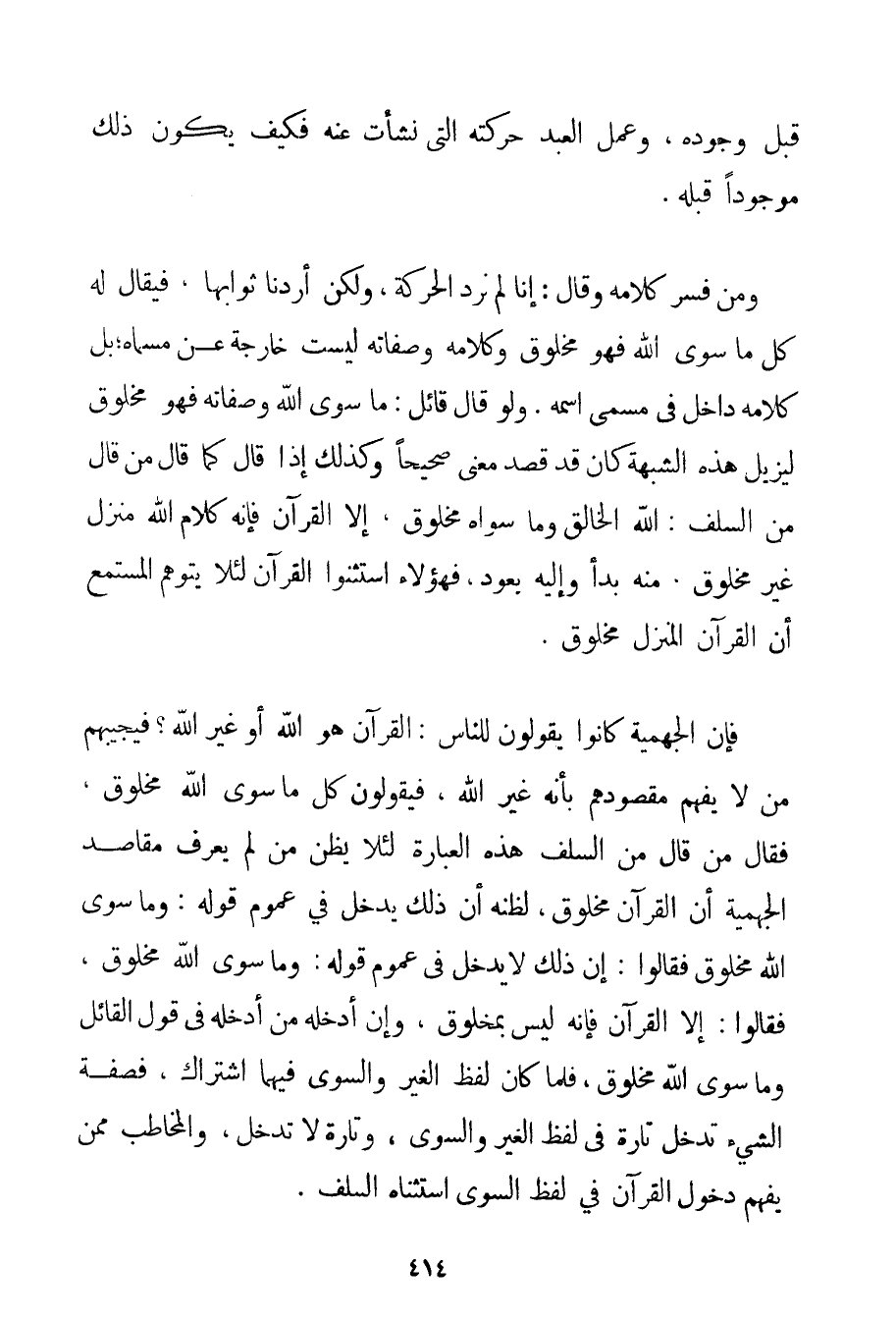 قَبْلَ وُجُودِهِ وَعَمَلُ الْعَبْدِ حَرَكَتُهُ الَّتِي نَشَأَتْ عَنْهُ فَكَيْفَ يَكُونُ ذَلِكَ مَوْجُودًا قَبْلَهُ. وَمَنْ فَسَّرَ كَلَامَهُ وَقَالَ: إنَّا لَمْ نُرِدْ الْحَرَكَةَ وَلَكِنْ أَرَدْنَا ثَوَابَهَا فَيُقَالُ لَهُ كُلُّ مَا سِوَى اللَّهِ فَهُوَ مَخْلُوقٌ وَكَلَامُهُ وَصِفَاتُهُ لَيْسَتْ خَارِجَةً عَنْ مُسَمَّاهُ؛ بَلْ كَلَامُهُ دَاخِلٌ فِي مُسَمَّى اسْمِهِ. وَلَوْ قَالَ قَائِلٌ: مَا سِوَى اللَّهِ وَصِفَاتِهِ فَهُوَ مَخْلُوقٌ لِيُزِيلَ هَذِهِ الشُّبْهَةَ كَانَ قَدْ قَصَدَ مَعْنًى صَحِيحًا وَكَذَلِكَ إذَا قَالَ كَمَا قَالَ مَنْ قَالَ مِنْ السَّلَفِ: اللَّهُ الْخَالِقُ وَمَا سِوَاهُ مَخْلُوقٌ إلَّا الْقُرْآنَ فَإِنَّهُ كَلَامُ اللَّهِ مُنَزَّلٌ غَيْرُ مَخْلُوقٍ مِنْهُ بَدَأَ وَإِلَيْهِ يَعُودُ فَهَؤُلَاءِ اسْتَثْنَوْا الْقُرْآنَ لِئَلَّا يَتَوَهَّمُ الْمُسْتَمِعُ أَنَّ الْقُرْآنَ الْمُنَزَّلَ مَخْلُوقٌ. فَإِنَّ الْجَهْمِيَّة كَانُوا يَقُولُونَ لِلنَّاسِ: الْقُرْآنُ هُوَ اللَّهُ أَوْ غَيْرُ اللَّهِ؟ فَيُجِيبُهُمْ مَنْ لَا يَفْهَمُ مَقْصُودَهُمْ بِأَنَّهُ غَيْرُ اللَّهِ فَيَقُولُونَ كُلُّ مَا سِوَى اللَّهِ مَخْلُوقٌ فَقَالَ مَنْ قَالَ مِنْ السَّلَفِ هَذِهِ الْعِبَارَةَ لِئَلَّا يَظُنُّ مَنْ لَمْ يَعْرِفْ مَقَاصِدَ الْجَهْمِيَّة أَنَّ الْقُرْآنَ مَخْلُوقٌ لِظَنِّهِ أَنَّ ذَلِكَ يَدْخُلُ فِي عُمُومِ قَوْلِهِ: وَمَا سِوَى اللَّهِ مَخْلُوقٌ فَقَالُوا: إنَّ ذَلِكَ لَا يَدْخُلُ فِي عُمُومِ قَوْلِهِ: وَمَا سِوَى اللَّهِ مَخْلُوقٌ فَقَالُوا: إلَّا الْقُرْآنَ فَإِنَّهُ لَيْسَ بِمَخْلُوقِ وَإِنْ أَدْخَلَهُ مَنْ أَدْخَلَهُ فِي قَوْلِ الْقَائِلِ وَمَا سِوَى اللَّهِ مَخْلُوقٌ فَلَمَّا كَانَ لَفْظُ الْغَيْرِ وَالسِّوَى فِيهِمَا اشْتِرَاكٌ فَصِفَةُ الشَّيْءِ تَدْخُلُ تَارَةً فِي لَفْظِ الْغَيْرِ وَالسِّوَى وَتَارَةً لَا تَدْخُلُ وَالْمُخَاطَبُ مِمَّنْ يَفْهَمُ دُخُولَ الْقُرْآنِ فِي لَفْظِ السِّوَى اسْتَثْنَاهُ السَّلَفُ.