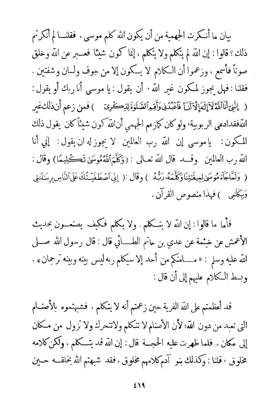 بَيَانُ مَا أَنْكَرَتْ الْجَهْمِيَّة مِنْ أَنْ يَكُونَ اللَّهُ كَلَّمَ مُوسَى فَقُلْنَا لِمَ أَنْكَرْتُمْ ذَلِكَ؟ قَالُوا: إنَّ اللَّهَ لَمْ يَتَكَلَّمْ وَلَا يَتَكَلَّمُ إنَّمَا كَوَّنَ شَيْئًا فَعَبَّرَ عَنْ اللَّهِ وَخَلَقَ صَوْتًا فَأَسْمَعَ وَزَعَمُوا أَنَّ الْكَلَامَ لَا يَكُونُ إلَّا مِنْ جَوْفٍ وَلِسَانٍ وَشَفَتَيْنِ. فَقُلْنَا: فَهَلْ يَجُوزُ لِمُكَوِّنِ غَيْرِ اللَّهِ أَنْ يَقُولَ: يَا مُوسَى أَنَا رَبُّكَ أَوْ يَقُولَ: {إنَّنِي أَنَا اللَّهُ لَا إلَهَ إلَّا أَنَا فَاعْبُدْنِي وَأَقِمِ الصَّلَاةَ لِذِكْرِي} فَمَنْ زَعَمَ أَنَّ ذَلِكَ غَيْرُ اللَّهِ فَقَدْ ادَّعَى الرُّبُوبِيَّةَ وَلَوْ كَانَ كَمَا زَعَمَ الجهمي أَنَّ اللَّهَ كَوَّنَ شَيْئًا كَانَ يَقُولُ ذَلِكَ الْمُكَوِّنُ: يَا مُوسَى إنَّ اللَّهَ رَبُّ الْعَالَمِينَ لَا يَجُوزُ لَهُ أَنْ يَقُولَ: إنِّي أَنَا اللَّهُ رَبُّ الْعَالَمِينَ وَقَدْ قَالَ اللَّهُ تَعَالَى: {وَكَلَّمَ اللَّهُ مُوسَى تَكْلِيمًا} وَقَالَ: {وَلَمَّا جَاءَ مُوسَى لِمِيقَاتِنَا وَكَلَّمَهُ رَبُّهُ} وَقَالَ: {إنِّي اصْطَفَيْتُكَ عَلَى النَّاسِ بِرِسَالَاتِي وَبِكَلَامِي} فَهَذَا مَنْصُوصُ الْقُرْآنِ. فَأَمَّا مَا قَالُوا: إنَّ اللَّهَ لَا يَتَكَلَّمُ. وَلَا يُكَلِّمُ فَكَيْفَ يَصْنَعُونَ بِحَدِيثِ الْأَعْمَشِ عَنْ خيثمة عَنْ عَدِيِّ بْنِ حَاتِمٍ الطَّائِيِّ قَالَ: قَالَ رَسُولُ اللَّهِ صَلَّى اللَّهُ عَلَيْهِ وَسَلَّمَ {مَا مِنْكُمْ مِنْ أَحَدٍ إلَّا سَيُكَلِّمُ رَبَّهُ لَيْسَ بَيْنَهُ وَبَيْنَهُ تَرْجُمَانٌ} . وَبَسَطَ الْكَلَامَ عَلَيْهِمْ إلَى أَنْ قَالَ: قَدْ أَعْظَمْتُمْ عَلَى اللَّهِ الْفِرْيَةَ حِينَ زَعَمْتُمْ أَنَّهُ لَا يَتَكَلَّمُ فَشَبَّهْتُمُوهُ بِالْأَصْنَامِ الَّتِي تُعْبَدُ مِنْ دُونِ اللَّهِ؛ لِأَنَّ الْأَصْنَامَ لَا تَتَكَلَّمُ وَلَا تَتَحَرَّكُ وَلَا تَزُولُ مِنْ مَكَانٍ إلَى مَكَانٍ فَلَمَّا ظَهَرَتْ عَلَيْهِ الْحُجَّةُ قَالَ: إنَّ اللَّهَ قَدْ يَتَكَلَّمُ وَلَكِنَّ كَلَامَهُ مَخْلُوقٌ قُلْنَا: وَكَذَلِكَ بَنُو آدَمَ كَلَامُهُمْ مَخْلُوقٌ فَقَدْ شَبَّهْتُمْ اللَّهَ بِخَلْقِهِ حِينَ