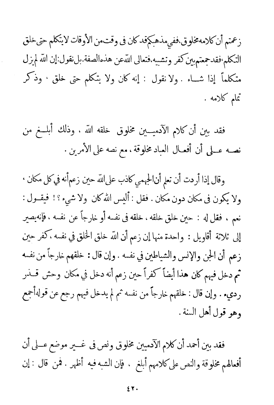 زَعَمْتُمْ أَنَّ كَلَامَهُ مَخْلُوقٌ فَفِي مَذْهَبِكُمْ قَدْ كَانَ فِي وَقْتٍ مِنْ الْأَوْقَاتِ لَا يَتَكَلَّمُ حَتَّى خَلَقَ التَّكَلُّمَ فَقَدْ جَمَعْتُمْ بَيْنَ كُفْرٍ وَتَشْبِيهٍ فَتَعَالَى اللَّهُ عَنْ هَذِهِ الصِّفَةِ بَلْ نَقُولُ: إنَّ اللَّهَ لَمْ يَزَلْ مُتَكَلِّمًا إذَا شَاءَ. وَلَا نَقُولُ: إنَّهُ كَانَ وَلَا يَتَكَلَّمُ حَتَّى خَلَقَ وَذَكَرَ تَمَامَ كَلَامِهِ. فَقَدْ بَيَّنَ أَنَّ كَلَامَ الْآدَمِيِّينَ مَخْلُوقٌ خَلَقَهُ اللَّهُ وَذَلِكَ أَبْلَغُ مِنْ نَصِّهِ عَلَى أَنَّ أَفْعَالَ الْعِبَادِ مَخْلُوقَةٌ مَعَ نَصِّهِ عَلَى الْأَمْرَيْنِ. وَقَالَ إذَا أَرَدْتَ أَنْ تَعْلَمَ أَنَّ الجهمي كَاذِبٌ عَلَى اللَّهِ حِينَ زَعَمَ أَنَّهُ فِي كُلِّ مَكَانٍ وَلَا يَكُونُ فِي مَكَانٍ دُونَ مَكَانٍ. فَقُلْ: أَلَيْسَ اللَّهُ كَانَ وَلَا شَيْءَ فَيَقُولُ: نَعَمْ فَقُلْ لَهُ: حِينَ خَلَقَ خَلْقَهُ خَلَقَهُ فِي نَفْسِهِ أَوْ خَارِجًا عَنْ نَفْسِهِ فَإِنَّهُ يَصِيرُ إلَى ثَلَاثَةِ أَقَاوِيلَ: وَاحِدَةٌ مِنْهَا إنْ زَعَمَ أَنَّ اللَّهَ خَلَقَ الْخَلْقَ فِي نَفْسِهِ كَفَرَ حِينَ زَعَمَ أَنَّ الْجِنَّ وَالْإِنْسَ وَالشَّيَاطِينَ فِي نَفْسِهِ. وَإِنْ قَالَ: خَلَقَهُمْ خَارِجًا مِنْ نَفْسِهِ ثُمَّ دَخَلَ فِيهِمْ كَانَ هَذَا أَيْضًا كُفْرًا حِينَ زَعَمَ أَنَّهُ دَخَلَ فِي مَكَانٍ وَحِشٍ قَذِرٍ رَدِيءٍ. وَإِنْ قَالَ: خَلَقَهُمْ خَارِجًا مِنْ نَفْسِهِ ثُمَّ لَمْ يَدْخُلْ فِيهِمْ رَجَعَ عَنْ قَوْلِهِ أَجْمَعَ وَهُوَ قَوْلُ أَهْلِ السُّنَّةِ. فَقَدْ بَيَّنَ أَحْمَد أَنَّ كَلَامَ الْآدَمِيِّينَ مَخْلُوقٌ وَنَصَّ فِي غَيْرِ مَوْضِعٍ عَلَى أَنَّ أَفْعَالَهُمْ مَخْلُوقَةٌ وَالنَّصُّ عَلَى كَلَامِهِمْ أَبْلَغُ فَإِنَّ الشُّبَهَ فِيهِ أَظْهَرُ. فَمَنْ قَالَ: إنَّ
