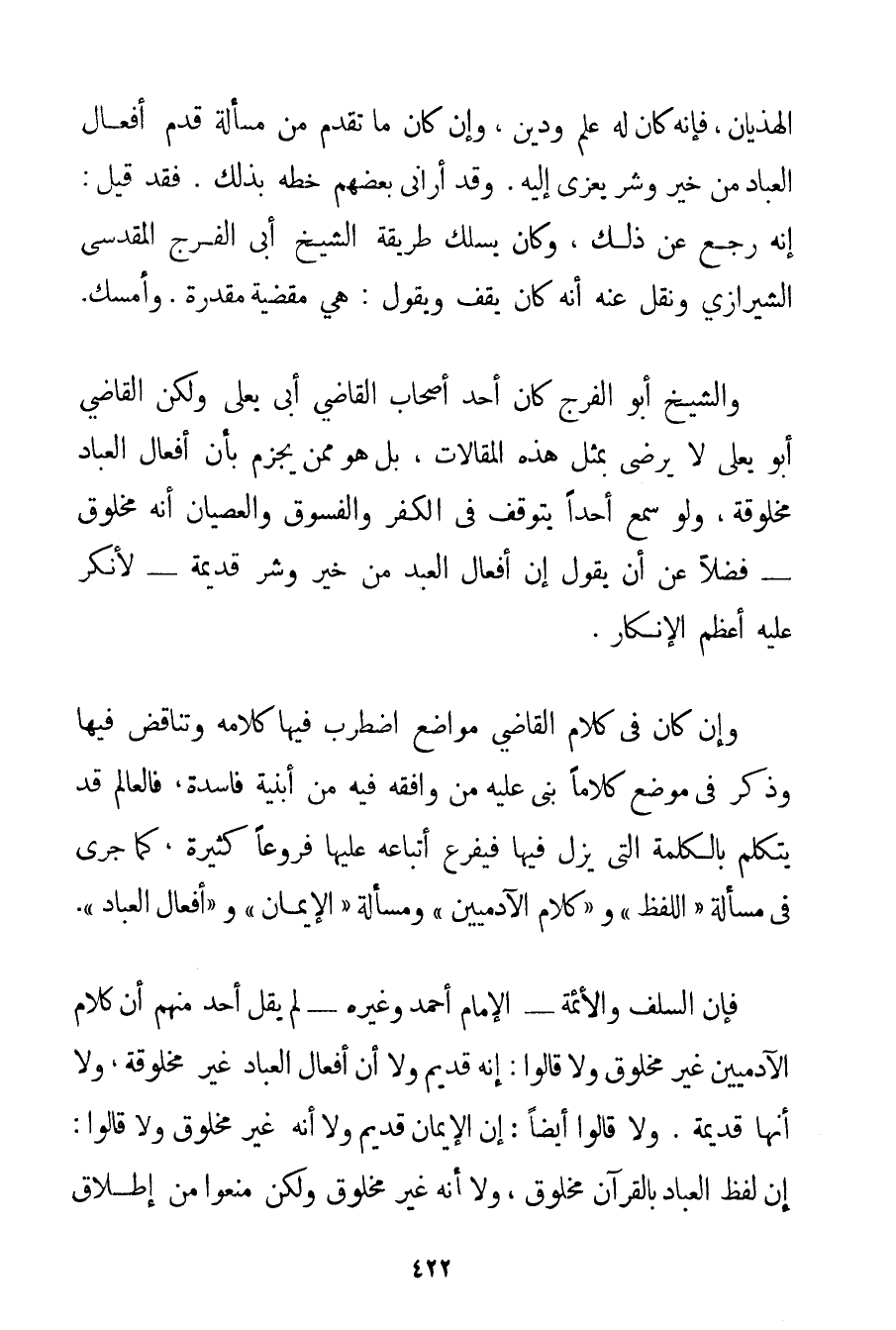 الْهَذَيَانِ فَإِنَّهُ كَانَ لَهُ عِلْمٌ وَدِينٌ وَإِنْ كَانَ مَا تَقَدَّمَ مِنْ مَسْأَلَةِ قِدَمِ أَفْعَالِ الْعِبَادِ مِنْ خَيْرٍ وَشَرٍّ يُعْزَى إلَيْهِ. وَقَدْ أَرَانِي بَعْضُهُمْ خَطَّهُ بِذَلِكَ. فَقَدْ قِيلَ: إنَّهُ رَجَعَ عَنْ ذَلِكَ وَكَانَ يَسْلُكُ طَرِيقَة الشَّيْخِ أَبِي الْفَرَجِ المقدسي الشِّيرَازِيِّ وَنَقَلَ عَنْهُ أَنَّهُ كَانَ يَقِفُ وَيَقُولُ: هِيَ مَقْضِيَّةٌ مُقَدَّرَةٌ، وَأَمْسَكَ. وَالشَّيْخُ أَبُو الْفَرَجِ كَانَ أَحَدَ أَصْحَابِ الْقَاضِي أَبِي يَعْلَى وَلَكِنْ الْقَاضِي أَبُو يَعْلَى لَا يَرْضَى بِمِثْلِ هَذِهِ الْمَقَالَاتِ بَلْ هُوَ مِمَّنْ يَجْزِمُ بِأَنَّ أَفْعَالَ الْعِبَادِ مَخْلُوقَةٌ وَلَوْ سَمِعَ أَحَدًا يَتَوَقَّفُ فِي الْكُفْرِ وَالْفُسُوقِ وَالْعِصْيَانِ أَنَّهُ مَخْلُوقٌ - فَضْلًا عَنْ أَنْ يَقُولَ إنَّ أَفْعَالَ الْعَبْدِ مِنْ خَيْرٍ وَشَرٍّ قَدِيمَةٌ - لَأَنْكَرَ عَلَيْهِ أَعْظَمَ الْإِنْكَارِ. وَإِنْ كَانَ فِي كَلَامِ الْقَاضِي مَوَاضِعُ اضْطَرَبَ فِيهَا كَلَامُهُ وَتَنَاقَضَ فِيهَا وَذَكَرَ فِي مَوْضِعٍ كَلَامًا بَنَى عَلَيْهِ مَنْ وَافَقَهُ فِيهِ مِنْ أَبْنِيَةٍ فَاسِدَةٍ فَالْعَالِمُ قَدْ يَتَكَلَّمُ بِالْكَلِمَةِ الَّتِي يَزِلُّ فِيهَا فَيُفَرِّعُ أَتْبَاعُهُ عَلَيْهَا فُرُوعًا كَثِيرَةً كَمَا جَرَى فِي مَسْأَلَةِ " اللَّفْظِ " وَ " كَلَامِ الْآدَمِيِّينَ " وَمَسْأَلَةِ " الْإِيمَانِ " وَ " أَفْعَالِ الْعِبَادِ ". فَإِنَّ السَّلَفَ وَالْأَئِمَّةَ - الْإِمَامَ أَحْمَد وَغَيْرَهُ - لَمْ يَقُلْ أَحَدٌ مِنْهُمْ أَنَّ كَلَامَ الْآدَمِيِّينَ غَيْرُ مَخْلُوقٍ وَلَا قَالُوا: إنَّهُ قَدِيمٌ وَلَا أَنَّ أَفْعَالَ الْعِبَادِ غَيْرُ مَخْلُوقَةٍ وَلَا أَنَّهَا قَدِيمَةٌ. وَلَا قَالُوا أَيْضًا: إنَّ الْإِيمَانَ قَدِيمٌ وَلَا أَنَّهُ غَيْرُ مَخْلُوقٍ وَلَا قَالُوا: إنَّ لَفْظَ الْعِبَادِ بِالْقُرْآنِ مَخْلُوقٌ وَلَا أَنَّهُ غَيْرُ مَخْلُوقٍ وَلَكِنْ مَنَعُوا مِنْ إطْلَاقِ