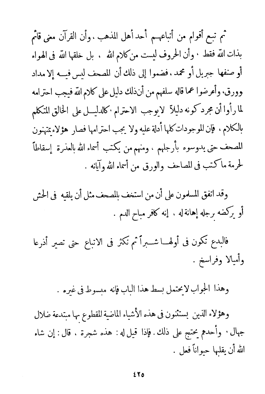 ثُمَّ تَبِعَ أَقْوَامٌ مِنْ أَتْبَاعِهِمْ أَحَدَ أَهْلِ الْمَذْهَبِ وَأَنَّ الْقُرْآنَ مَعْنًى قَائِمٌ بِذَاتِ اللَّهِ فَقَطْ وَأَنَّ الْحُرُوفَ لَيْسَتْ مِنْ كَلَامِ اللَّهِ بَلْ خَلَقَهَا اللَّهُ فِي الْهَوَاءِ أَوْ صَنَّفَهَا جِبْرِيلُ أَوْ مُحَمَّدٌ فَضَمُّوا إلَى ذَلِكَ أَنَّ الْمُصْحَفَ لَيْسَ فِيهِ إلَّا مِدَادٌ وَوَرَقٌ وَأَعْرَضُوا عَمَّا قَالَهُ سَلَفُهُمْ مِنْ أَنَّ ذَلِكَ دَلِيلٌ عَلَى كَلَامِ اللَّهِ فَيَجِبُ احْتِرَامُهُ لَمَّا رَأَوْا أَنَّ مُجَرَّدَ كَوْنِهِ دَلِيلًا لَا يُوجِبُ الِاحْتِرَامَ كَالدَّلِيلِ عَلَى الْخَالِقِ الْمُتَكَلِّمِ بِالْكَلَامِ فَإِنَّ الْمَوْجُودَاتِ كُلَّهَا أَدِلَّةٌ عَلَيْهِ وَلَا يَجِبُ احْتِرَامُهَا فَصَارَ هَؤُلَاءِ يَمْتَهِنُونَ الْمُصْحَفَ حَتَّى يَدُوسُوهُ بِأَرْجُلِهِمْ وَمِنْهُمْ مَنْ يَكْتُبُ أَسْمَاءَ اللَّهِ بِالْعَذِرَةِ إسْقَاطًا لِحُرْمَةِ مَا كُتِبَ فِي الْمَصَاحِفِ، وَالْوَرَقُ مِنْ أَسْمَاءِ اللَّهِ وَآيَاتِهِ. وَقَدْ اتَّفَقَ الْمُسْلِمُونَ عَلَى أَنَّ مَنْ اسْتَخَفَّ بِالْمُصْحَفِ مِثْلَ أَنْ يُلْقِيَهُ فِي الْحُشِّ أَوْ يَرْكُضَهُ بِرِجْلِهِ إهَانَةً لَهُ إنَّهُ كَافِرٌ مُبَاحُ الدَّمِ. فَالْبِدَعُ تَكُونُ فِي أَوَّلِهَا شِبْرًا ثُمَّ تَكْثُرُ فِي الِاتِّبَاعِ حَتَّى تَصِيرَ أَذْرُعًا وَأَمْيَالًا وَفَرَاسِخَ. وَهَذَا الْجَوَابُ لَا يَحْتَمِلُ بَسْطَ هَذَا الْبَابِ فَإِنَّهُ مَبْسُوطٌ فِي غَيْرِهِ. وَهَؤُلَاءِ الَّذِينَ يَسْتَثْنُونَ فِي هَذِهِ الْأَشْيَاءِ الْمَاضِيَةِ الْمَقْطُوعِ بِهَا مُبْتَدِعَةٌ ضُلَّالٌ جُهَّالٌ وَأَحَدُهُمْ يَحْتَجُّ عَلَى ذَلِكَ. فَإِذَا قِيلَ لَهُ: هَذِهِ شَجَرَةٌ قَالَ: إنْ شَاءَ اللَّهُ أَنْ يَقْلِبَهَا حَيَوَانًا فَعَلَ.