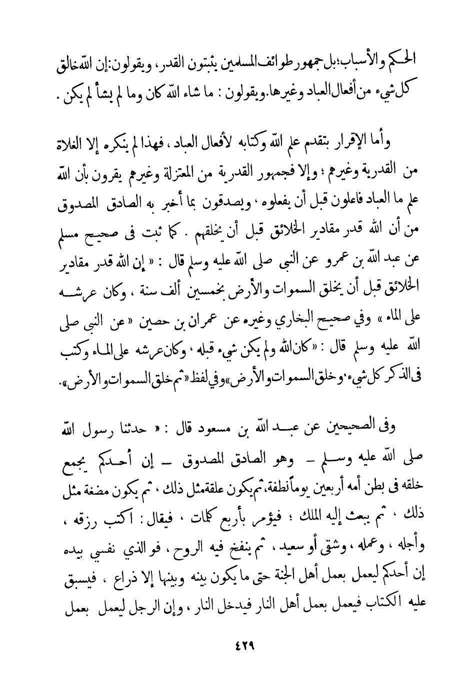 الْحُكْمِ وَالْأَسْبَابِ؛ بَلْ جُمْهُورُ طَوَائِفِ الْمُسْلِمِينَ يُثْبِتُونَ الْقَدَرَ وَيَقُولُونَ: إنَّ اللَّهَ خَالِقُ كُلِّ شَيْءٍ مِنْ أَفْعَالِ الْعِبَادِ وَغَيْرِهَا. وَيَقُولُونَ: مَا شَاءَ اللَّهُ كَانَ وَمَا لَمْ يَشَأْ لَمْ يَكُنْ. وَأَمَّا الْإِقْرَارُ بِتَقَدُّمِ عِلْمِ اللَّهِ وَكِتَابِهِ لِأَفْعَالِ الْعِبَادِ فَهَذَا لَمْ يُنْكِرْهُ إلَّا الْغُلَاةُ مِنْ الْقَدَرِيَّةِ وَغَيْرِهِمْ؛ وَإِلَّا فَجُمْهُورُ الْقَدَرِيَّةِ مِنْ الْمُعْتَزِلَةِ وَغَيْرِهِمْ يُقِرُّونَ بِأَنَّ اللَّهَ عَلِمَ مَا الْعِبَادُ فَاعِلُونَ قَبْلَ أَنْ يَفْعَلُوهُ وَيُصَدِّقُونَ بِمَا أَخْبَرَ بِهِ الصَّادِقُ الْمَصْدُوقُ مِنْ أَنَّ اللَّهَ قَدَّرَ مَقَادِيرَ الْخَلَائِقِ قَبْلَ أَنْ يَخْلُقَهُمْ. كَمَا ثَبَتَ فِي صَحِيحِ مُسْلِمٍ عَنْ عَبْدِ اللَّهِ بْنِ عَمْرٍو عَنْ النَّبِيِّ صَلَّى اللَّهُ عَلَيْهِ وَسَلَّمَ قَالَ: {إنَّ اللَّهَ قَدَّرَ مَقَادِيرَ الْخَلَائِقِ قَبْلَ أَنْ يَخْلُقَ السَّمَوَاتِ وَالْأَرْضَ بِخَمْسِينَ أَلْفِ سَنَةٍ وَكَانَ عَرْشُهُ عَلَى الْمَاءِ} وَفِي صَحِيحِ الْبُخَارِيِّ وَغَيْرِهِ عَنْ عِمْرَانَ بْنِ حُصَيْنٍ " عَنْ النَّبِيِّ صَلَّى اللَّهُ عَلَيْهِ وَسَلَّمَ قَالَ: {كَانَ اللَّهُ وَلَمْ يَكُنْ شَيْءٌ قَبْلَهُ وَكَانَ عَرْشُهُ عَلَى الْمَاءِ وَكَتَبَ فِي الذِّكْرِ كُلَّ شَيْءٍ وَخَلَقَ السَّمَوَاتِ وَالْأَرْضَ} وَفِي لَفْظٍ {ثُمَّ خَلَقَ السَّمَوَاتِ وَالْأَرْضَ} . وَفِي الصَّحِيحَيْنِ عَنْ {عَبْدِ اللَّهِ بْنِ مَسْعُودٍ قَالَ: حَدَّثَنَا رَسُولُ اللَّهِ صَلَّى اللَّهُ عَلَيْهِ وَسَلَّمَ - وَهُوَ الصَّادِقُ الْمَصْدُوقُ - إنَّ أَحَدَكُمْ يُجْمَعُ خَلْقُهُ فِي بَطْنِ أُمِّهِ أَرْبَعِينَ يَوْمًا نُطْفَةً ثُمَّ يَكُونُ عَلَقَةً مِثْلَ ذَلِكَ ثُمَّ يَكُونُ مُضْغَةً مِثْلَ ذَلِكَ ثُمَّ يُبْعَثُ إلَيْهِ الْمَلَكُ؛ فَيُؤْمَرُ بِأَرْبَعِ كَلِمَاتٍ فَيُقَالُ: اُكْتُبْ رِزْقَهُ وَأَجَلَهُ وَعَمَلَهُ وَشَقِيٌّ أَوْ سَعِيدٌ ثُمَّ يُنْفَخُ فِيهِ الرُّوحُ فَوَاَلَّذِي نَفْسِي بِيَدِهِ إنَّ أَحَدَكُمْ لَيَعْمَلُ بِعَمَلِ أَهْلِ الْجَنَّةِ حَتَّى مَا يَكُونُ بَيْنَهُ وَبَيْنَهَا إلَّا ذِرَاعٌ فَيَسْبِقُ عَلَيْهِ الْكِتَابُ فَيَعْمَلُ بِعَمَلِ أَهْلِ النَّارِ فَيَدْخُلُ النَّارَ وَإِنَّ الرَّجُلَ لَيَعْمَلُ بِعَمَلِ