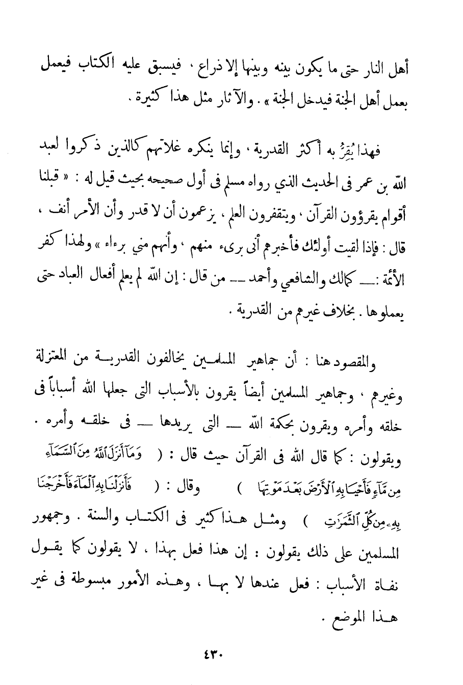 أَهْلِ النَّارِ حَتَّى مَا يَكُونُ بَيْنَهُ وَبَيْنَهَا إلَّا ذِرَاعٌ فَيَسْبِقُ عَلَيْهِ الْكِتَابُ فَيَعْمَلُ بِعَمَلِ أَهْلِ الْجَنَّةِ فَيَدْخُلُ الْجَنَّةَ} . وَالْآثَارُ مِثْلَ هَذَا كَثِيرَةٌ. فَهَذَا يُقِرُّ بِهِ أَكْثَرُ الْقَدَرِيَّةِ وَإِنَّمَا يُنْكِرُهُ غُلَاتُهُمْ كَاَلَّذِينَ ذَكَرُوا لِعَبْدِ اللَّهِ بْنِ عُمَرَ فِي الْحَدِيثِ الَّذِي رَوَاهُ مُسْلِمٌ فِي أَوَّلِ صَحِيحِهِ بِحَيْثُ قِيلَ لَهُ: " قِبَلَنَا أَقْوَامٌ يَقْرَءُونَ الْقُرْآنَ وَيَفْتَقِرُونَ الْعِلْمَ يَزْعُمُونَ أَنْ لَا قَدَرَ وَأَنَّ الْأَمْرَ أُنُفٌ قَالَ: فَإِذَا لَقِيتَ أُولَئِكَ فَأَخْبِرْهُمْ أَنِّي بَرِيءٌ مِنْهُمْ وَأَنَّهُمْ مِنِّي بُرَآءُ " وَلِهَذَا كَفَّرَ الْأَئِمَّةُ: - كَمَالِكِ وَالشَّافِعِيِّ وَأَحْمَد - مَنْ قَالَ: إنَّ اللَّهَ لَمْ يَعْلَمْ أَفْعَالَ الْعِبَادِ حَتَّى يَعْمَلُوهَا بِخِلَافِ غَيْرِهِمْ مِنْ الْقَدَرِيَّةِ. وَالْمَقْصُودُ هُنَا: أَنَّ جَمَاهِيرَ الْمُسْلِمِينَ يُخَالِفُونَ الْقَدَرِيَّةَ مِنْ الْمُعْتَزِلَةِ وَغَيْرِهِمْ وَجَمَاهِيرُ الْمُسْلِمِينَ أَيْضًا يُقِرُّونَ بِالْأَسْبَابِ الَّتِي جَعَلَهَا اللَّهُ أَسْبَابًا فِي خَلْقِهِ وَأَمْرِهِ وَيُقِرُّونَ بِحِكْمَةِ اللَّهِ - الَّتِي يُرِيدُهَا - فِي خَلْقِهِ وَأَمْرِهِ. وَيَقُولُونَ: كَمَا قَالَ اللَّهُ فِي الْقُرْآنِ حَيْثُ قَالَ: {وَمَا أَنْزَلَ اللَّهُ مِنَ السَّمَاءِ مِنْ مَاءٍ فَأَحْيَا بِهِ الْأَرْضَ بَعْدَ مَوْتِهَا} وَقَالَ: {فَأَنْزَلْنَا بِهِ الْمَاءَ فَأَخْرَجْنَا بِهِ مِنْ كُلِّ الثَّمَرَاتِ} وَمِثْلُ هَذَا كَثِيرٌ فِي الْكِتَابِ وَالسُّنَّةِ. وَجُمْهُورُ الْمُسْلِمِينَ عَلَى ذَلِكَ يَقُولُونَ: إنَّ هَذَا فُعِلَ بِهَذَا لَا يَقُولُونَ كَمَا يَقُولُ نفاة الْأَسْبَابِ: فُعِلَ عِنْدَهَا لَا بِهَا وَهَذِهِ الْأُمُورُ مَبْسُوطَةٌ فِي غَيْرِ هَذَا الْمَوْضِعِ.