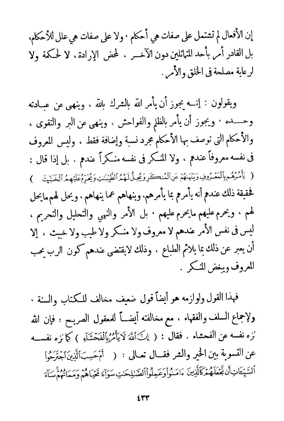 إنَّ الْأَفْعَالَ لَمْ تَشْتَمِلْ عَلَى صِفَاتٍ هِيَ أَحْكَامٌ وَلَا عَلَى صِفَاتٍ هِيَ عِلَلٌ لِلْأَحْكَامِ بَلْ الْقَادِرُ أَمَرَ بِأَحَدِ الْمُتَمَاثِلَيْنِ دُونَ الْآخَرِ لِمَحْضِ الْإِرَادَةِ لَا لِحِكْمَةِ وَلَا لِرِعَايَةِ مَصْلَحَةٍ فِي الْخَلْقِ وَالْأَمْرِ. وَيَقُولُونَ: إنَّهُ يَجُوزُ أَنْ يَأْمُرَ اللَّهُ بِالشِّرْكِ بِاَللَّهِ وَيَنْهَى عَنْ عِبَادَتِهِ وَحْدَهُ وَيَجُوزُ أَنْ يَأْمُرَ بِالظُّلْمِ وَالْفَوَاحِشِ وَيَنْهَى عَنْ الْبِرِّ وَالتَّقْوَى وَالْأَحْكَامُ الَّتِي تُوصَفُ بِهَا الْأَحْكَامُ مُجَرَّدُ نِسْبَةٍ وَإِضَافَةٍ فَقَطْ وَلَيْسَ الْمَعْرُوفُ فِي نَفْسِهِ مَعْرُوفًا عِنْدَهُمْ وَلَا الْمُنْكَرُ فِي نَفْسِهِ مُنْكَرًا عِنْدَهُمْ. بَلْ إذَا قَالَ: {يَأْمُرُهُمْ بِالْمَعْرُوفِ وَيَنْهَاهُمْ عَنِ الْمُنْكَرِ وَيُحِلُّ لَهُمُ الطَّيِّبَاتِ وَيُحَرِّمُ عَلَيْهِمُ الْخَبَائِثَ} فَحَقِيقَةُ ذَلِكَ عِنْدَهُمْ أَنَّهُ يَأْمُرُهُمْ بِمَا يَأْمُرُهُمْ وَيَنْهَاهُمْ عَمَّا يَنْهَاهُمْ وَيُحِلُّ لَهُمْ مَا يُحِلُّ لَهُمْ وَيُحَرِّمُ عَلَيْهِمْ مَا يُحَرِّمُ عَلَيْهِمْ بَلْ الْأَمْرُ وَالنَّهْيُ وَالتَّحْلِيلُ وَالتَّحْرِيمُ لَيْسَ فِي نَفْسِ الْأَمْرِ عِنْدَهُمْ لَا مَعْرُوفٌ وَلَا مُنْكَرٌ وَلَا طَيِّبٌ وَلَا خَبِيثٌ إلَّا أَنْ يُعَبِّرَ عَنْ ذَلِكَ بِمَا يُلَائِمُ الطِّبَاعَ وَذَلِكَ لَا يَقْتَضِي عِنْدَهُمْ كَوْنَ الرَّبِّ يُحِبُّ الْمَعْرُوفَ وَيُبْغِضُ الْمُنْكَرَ. فَهَذَا الْقَوْلُ وَلَوَازِمُهُ هُوَ أَيْضًا قَوْلٌ ضَعِيفٌ مُخَالِفٌ لِلْكِتَابِ وَالسُّنَّةِ وَلِإِجْمَاعِ السَّلَفِ وَالْفُقَهَاءِ مَعَ مُخَالَفَتِهِ أَيْضًا لِلْمَعْقُولِ الصَّرِيحِ؛ فَإِنَّ اللَّهَ نَزَّهَ نَفْسَهُ عَنْ الْفَحْشَاءِ. فَقَالَ: {إنَّ اللَّهَ لَا يَأْمُرُ بِالْفَحْشَاءِ} كَمَا نَزَّهَ نَفْسَهُ عَنْ التَّسْوِيَةِ بَيْنَ الْخَيْرِ وَالشَّرِّ فَقَالَ تَعَالَى: {أَمْ حَسِبَ الَّذِينَ اجْتَرَحُوا السَّيِّئَاتِ أَنْ نَجْعَلَهُمْ كَالَّذِينَ آمَنُوا وَعَمِلُوا الصَّالِحَاتِ سَوَاءً مَحْيَاهُمْ وَمَمَاتُهُمْ