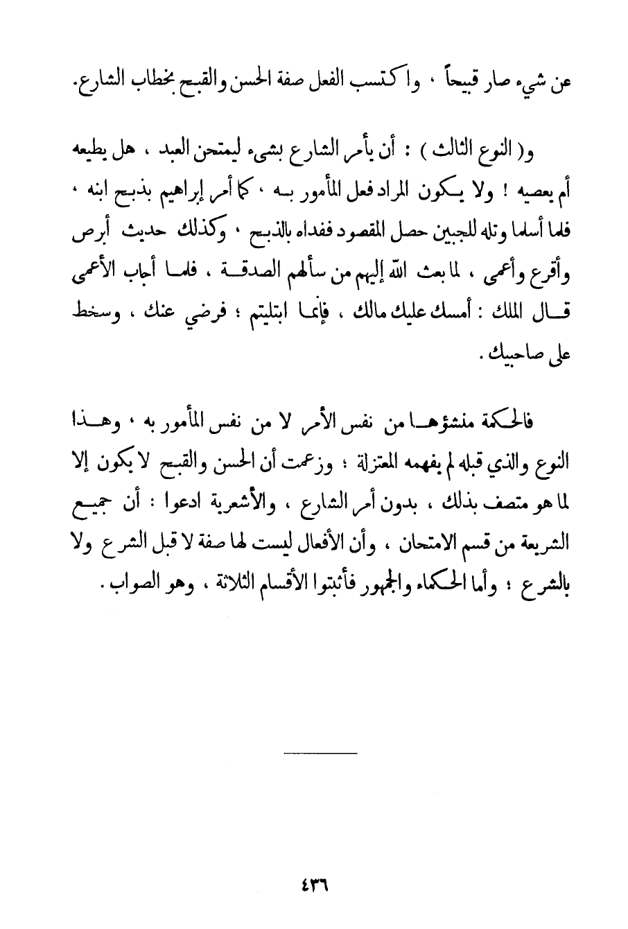 وَالنَّوْعُ الثَّالِثُ: أَنْ يَأْمُرَ الشَّارِعُ بِشَيْءِ لِيَمْتَحِنَ الْعَبْدَ هَلْ يُطِيعُهُ أَمْ يَعْصِيهِ وَلَا يَكُونُ الْمُرَادُ فِعْلَ الْمَأْمُورِ بِهِ كَمَا أَمَرَ إبْرَاهِيمَ بِذَبْحِ ابْنِهِ فَلَمَّا أَسْلَمَا وَتَلَّهُ لِلْجَبِينِ حَصَلَ الْمَقْصُودُ فَفَدَاهُ بِالذَّبْحِ وَكَذَلِكَ {حَدِيثُ أَبْرَصَ وَأَقْرَعَ وَأَعْمَى لَمَّا بَعَثَ اللَّهُ إلَيْهِمْ مَنْ سَأَلَهُمْ الصَّدَقَةَ فَلَمَّا أَجَابَ الْأَعْمَى قَالَ الْمَلَكُ: أَمْسِكْ عَلَيْكَ مَالَكَ فَإِنَّمَا اُبْتُلِيتُمْ؛ فَرَضِيَ عَنْكَ وَسَخِطَ عَلَى صَاحِبَيْكَ} . فَالْحِكْمَةُ مَنْشَؤُهَا مِنْ نَفْسِ الْأَمْرِ لَا مِنْ نَفْسِ الْمَأْمُورِ بِهِ وَهَذَا النَّوْعُ وَاَلَّذِي قَبْلَهُ لَمْ يَفْهَمْهُ الْمُعْتَزِلَةُ؛ وَزَعَمَتْ أَنَّ الْحُسْنَ وَالْقُبْحَ لَا يَكُونُ إلَّا لِمَا هُوَ مُتَّصِفٌ بِذَلِكَ بِدُونِ أَمْرِ الشَّارِعِ وَالْأَشْعَرِيَّةُ ادَّعَوْا: أَنَّ جَمِيعَ الشَّرِيعَةِ مِنْ قِسْمِ الِامْتِحَانِ وَأَنَّ الْأَفْعَالَ لَيْسَتْ لَهَا صِفَةٌ لَا قَبْلَ الشَّرْعِ وَلَا بِالشَّرْعِ؛ وَأَمَّا الْحُكَمَاءُ وَالْجُمْهُورُ فَأَثْبَتُوا الْأَقْسَامَ الثَّلَاثَةَ وَهُوَ الصَّوَابُ.