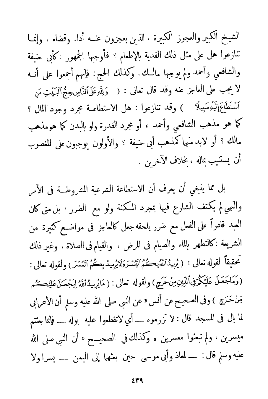 الشَّيْخِ الْكَبِيرِ وَالْعَجُوزِ الْكَبِيرَةِ الَّذِينَ يَعْجِزُونَ عَنْهُ أَدَاءً وَقَضَاءً وَإِنَّمَا تَنَازَعُوا هَلْ عَلَى مِثْلِ ذَلِكَ الْفِدْيَةُ بِالْإِطْعَامِ؟ فَأَوْجَبَهَا الْجُمْهُورُ: كَأَبِي حَنِيفَةَ وَالشَّافِعِيِّ وَأَحْمَد وَلَمْ يُوجِبْهَا مَالِكٌ وَكَذَلِكَ الْحَجُّ: فَإِنَّهُمْ أَجْمَعُوا عَلَى أَنَّهُ لَا يَجِبُ عَلَى الْعَاجِزِ عَنْهُ وَقَدْ قَالَ تَعَالَى: {وَلِلَّهِ عَلَى النَّاسِ حِجُّ الْبَيْتِ مَنِ اسْتَطَاعَ إلَيْهِ سَبِيلًا} وَقَدْ تَنَازَعُوا: هَلْ الِاسْتِطَاعَةُ مُجَرَّدُ وُجُودِ الْمَالِ؟ كَمَا هُوَ مَذْهَبُ الشَّافِعِيِّ وَأَحْمَد أَوْ مُجَرَّدُ الْقُدْرَةِ وَلَوْ بِالْبَدَنِ كَمَا هُوَ مَذْهَبُ مَالِكٍ؟ أَوْ لَا بُدَّ مِنْهُمَا كَمَذْهَبِ أَبِي حَنِيفَةَ؟ وَالْأَوَّلُونَ يُوجِبُونَ عَلَى الْمَغْصُوبِ أَنْ يَسْتَنِيبَ بِمَالِهِ بِخِلَافِ الْآخَرِينَ. بَلْ مِمَّا يَنْبَغِي أَنْ يُعْرَفَ أَنَّ الِاسْتِطَاعَةَ الشَّرْعِيَّةَ الْمَشْرُوطَةَ فِي الْأَمْرِ وَالنَّهْيِ لَمْ يَكْتَفِ الشَّارِعُ فِيهَا بِمُجَرَّدِ الْمِكْنَةِ وَلَوْ مَعَ الضَّرَرِ بَلْ مَتَى كَانَ الْعَبْدُ قَادِرًا عَلَى الْفِعْلِ مَعَ ضَرَرٍ يَلْحَقُهُ جُعِلَ كَالْعَاجِزِ فِي مَوَاضِعَ كَثِيرَةٍ مِنْ الشَّرِيعَةِ: كَالتَّطَهُّرِ بِالْمَاءِ وَالصِّيَامِ فِي الْمَرَضِ وَالْقِيَامِ فِي الصَّلَاةِ وَغَيْرِ ذَلِكَ تَحْقِيقًا لِقَوْلِهِ تَعَالَى {يُرِيدُ اللَّهُ بِكُمُ الْيُسْرَ وَلَا يُرِيدُ بِكُمُ الْعُسْرَ} وَلِقَوْلِهِ تَعَالَى: {وَمَا جَعَلَ عَلَيْكُمْ فِي الدِّينِ مِنْ حَرَجٍ} وَلِقَوْلِهِ تَعَالَى: {مَا يُرِيدُ اللَّهُ لِيَجْعَلَ عَلَيْكُمْ مِنْ حَرَجٍ} وَفِي الصَّحِيحِ عَنْ أَنَسٍ " {عَنْ النَّبِيِّ صَلَّى اللَّهُ عَلَيْهِ وَسَلَّمَ أَنَّ الْأَعْرَابِيَّ لَمَّا بَالَ فِي الْمَسْجِدِ قَالَ: لَا تزرموه - أَيْ لَا تَقْطَعُوا عَلَيْهِ بَوْلَهُ - فَإِنَّمَا بُعِثْتُمْ مُيَسِّرِينَ وَلَمْ تُبْعَثُوا مُعَسِّرِينَ} وَكَذَلِكَ فِي الصَّحِيحِ {أَنَّ النَّبِيَّ صَلَّى اللَّهُ عَلَيْهِ وَسَلَّمَ قَالَ: - لِمُعَاذِ وَأَبِي مُوسَى حِينَ بَعَثَهُمَا إلَى الْيَمَنِ - يَسِّرَا وَلَا