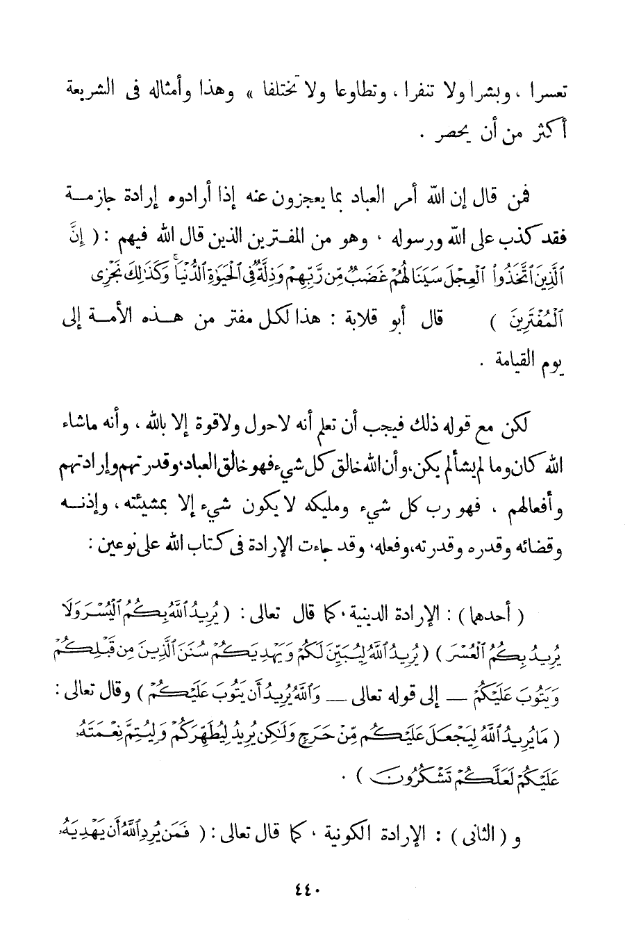 فَمَنْ قَالَ إنَّ اللَّهَ أَمَرَ الْعِبَادَ بِمَا يَعْجِزُونَ عَنْهُ إذَا أَرَادُوهُ إرَادَةً جَازِمَةً فَقَدْ كَذَبَ عَلَى اللَّهِ وَرَسُولِهِ وَهُوَ مِنْ الْمُفْتَرِينَ الَّذِينَ قَالَ اللَّهُ فِيهِمْ: {إنَّ الَّذِينَ اتَّخَذُوا الْعِجْلَ سَيَنَالُهُمْ غَضَبٌ مِنْ رَبِّهِمْ وَذِلَّةٌ فِي الْحَيَاةِ الدُّنْيَا وَكَذَلِكَ نَجْزِي الْمُفْتَرِينَ} قَالَ أَبُو قلابة: هَذَا لِكُلِّ مُفْتَرٍ مِنْ هَذِهِ الْأُمَّةِ إلَى يَوْمِ الْقِيَامَةِ. لَكِنْ مَعَ قَوْلِهِ ذَلِكَ فَيَجِبُ أَنْ تَعْلَمَ أَنَّهُ لَا حَوْلَ وَلَا قُوَّةَ إلَّا بِاَللَّهِ وَأَنَّهُ مَا شَاءَ اللَّهُ كَانَ وَمَا لَمْ يَشَأْ لَمْ يَكُنْ وَأَنَّ اللَّهَ خَالِقُ كُلِّ شَيْءٍ فَهُوَ خَالِقُ الْعِبَادِ وَقُدْرَتَهُمْ وَإِرَادَتَهُمْ وَأَفْعَالَهُمْ فَهُوَ رَبُّ كُلِّ شَيْءٍ وَمَلِيكُهُ لَا يَكُونُ شَيْءٌ إلَّا بِمَشِيئَتِهِ وَإِذْنِهِ وَقَضَائِهِ وَقَدَرِهِ وَقُدْرَتِهِ وَفِعْلِهِ وَقَدْ جَاءَتْ الْإِرَادَةُ فِي كِتَابِ اللَّهِ عَلَى نَوْعَيْنِ: أَحَدُهُمَا: الْإِرَادَةُ الدِّينِيَّةُ كَمَا قَالَ تَعَالَى: {يُرِيدُ اللَّهُ بِكُمُ الْيُسْرَ وَلَا يُرِيدُ بِكُمُ الْعُسْرَ} {يُرِيدُ اللَّهُ لِيُبَيِّنَ لَكُمْ وَيَهْدِيَكُمْ سُنَنَ الَّذِينَ مِنْ قَبْلِكُمْ وَيَتُوبَ عَلَيْكُمْ} - إلَى قَوْله تَعَالَى - {وَاللَّهُ يُرِيدُ أَنْ يَتُوبَ عَلَيْكُمْ} وَقَالَ تَعَالَى: {مَا يُرِيدُ اللَّهُ لِيَجْعَلَ عَلَيْكُمْ مِنْ حَرَجٍ وَلَكِنْ يُرِيدُ لِيُطَهِّرَكُمْ وَلِيُتِمَّ نِعْمَتَهُ عَلَيْكُمْ لَعَلَّكُمْ تَشْكُرُونَ} . وَ (الثَّانِي: الْإِرَادَةُ الْكَوْنِيَّةُ كَمَا قَالَ تَعَالَى: {فَمَنْ يُرِدِ اللَّهُ أَنْ يَهدِيَهُ